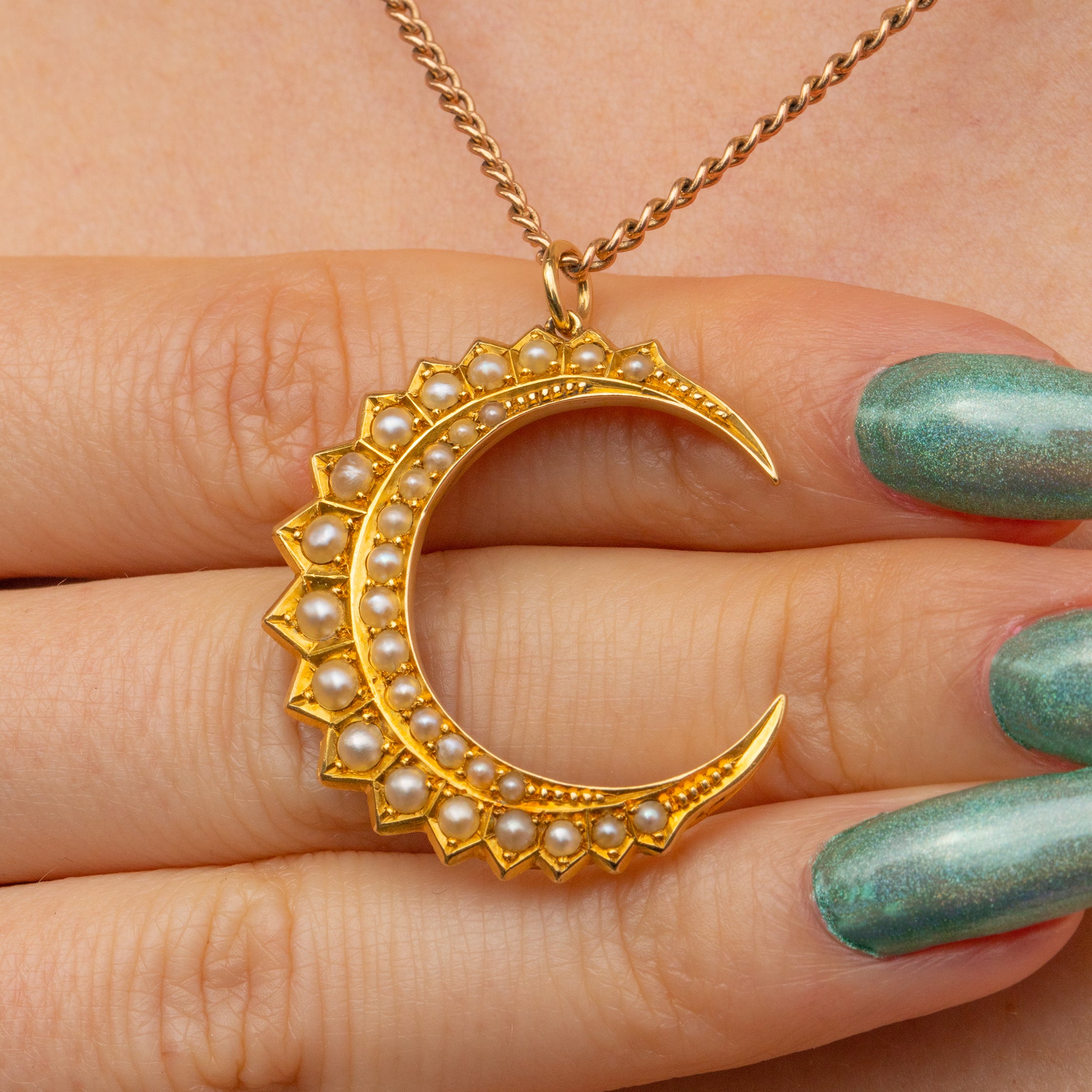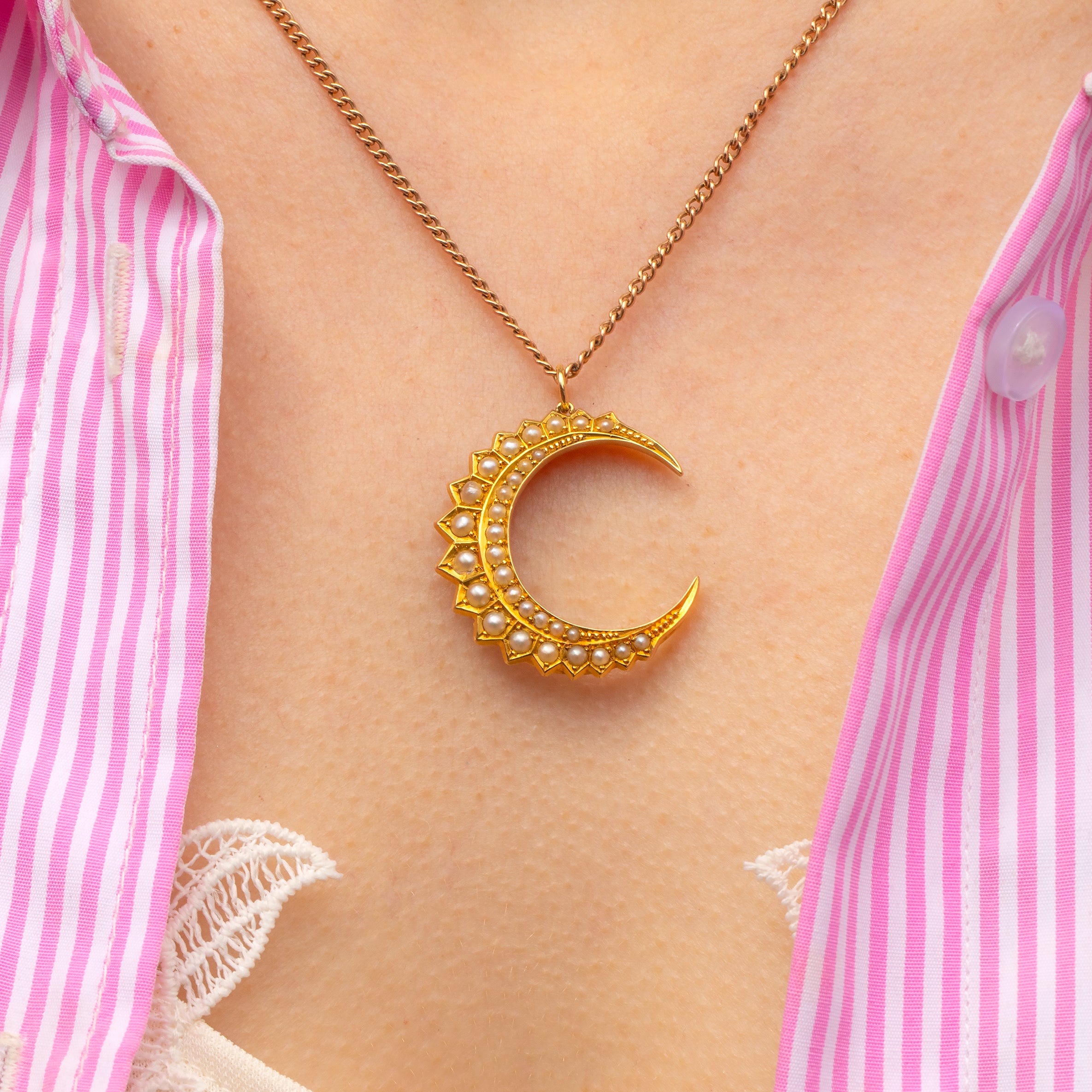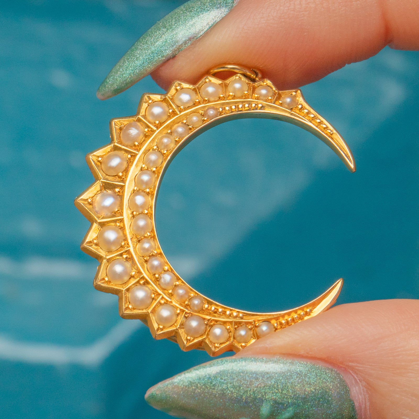 This striking Victorian 18ct Gold Pearl crescent moon pendant will bring undeniable celestial allure to your antique jewellery collection! The rows of plump Pearls send iridescent shimmers across the curved form of the crescent, set into saturated 18ct Gold.