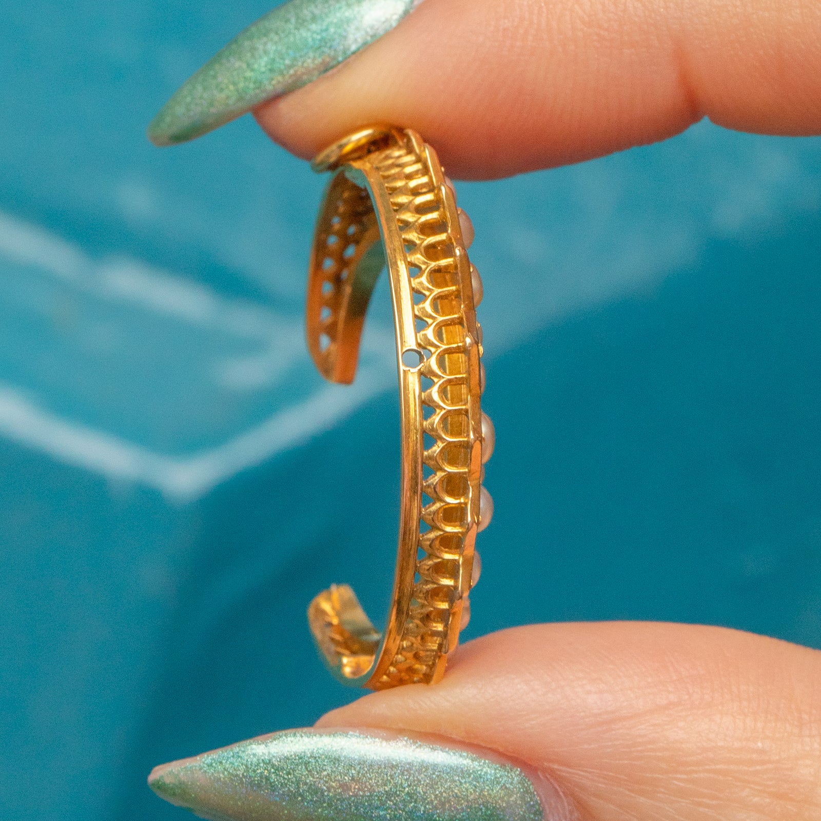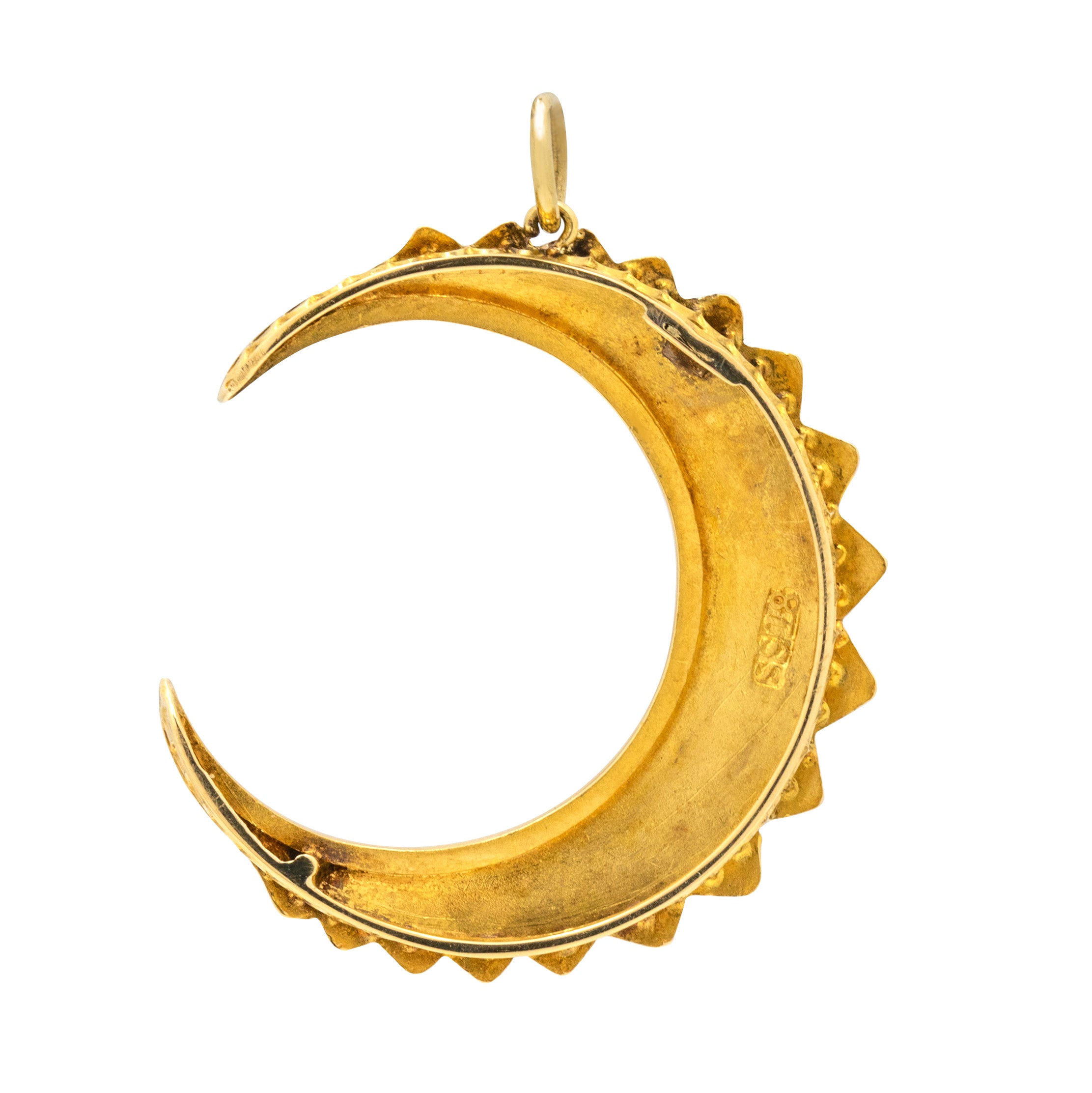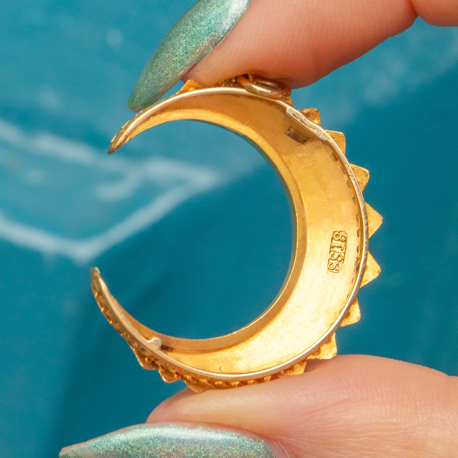 This striking Victorian 18ct Gold Pearl crescent moon pendant will bring undeniable celestial allure to your antique jewellery collection! The rows of plump Pearls send iridescent shimmers across the curved form of the crescent, set into saturated 18ct Gold.