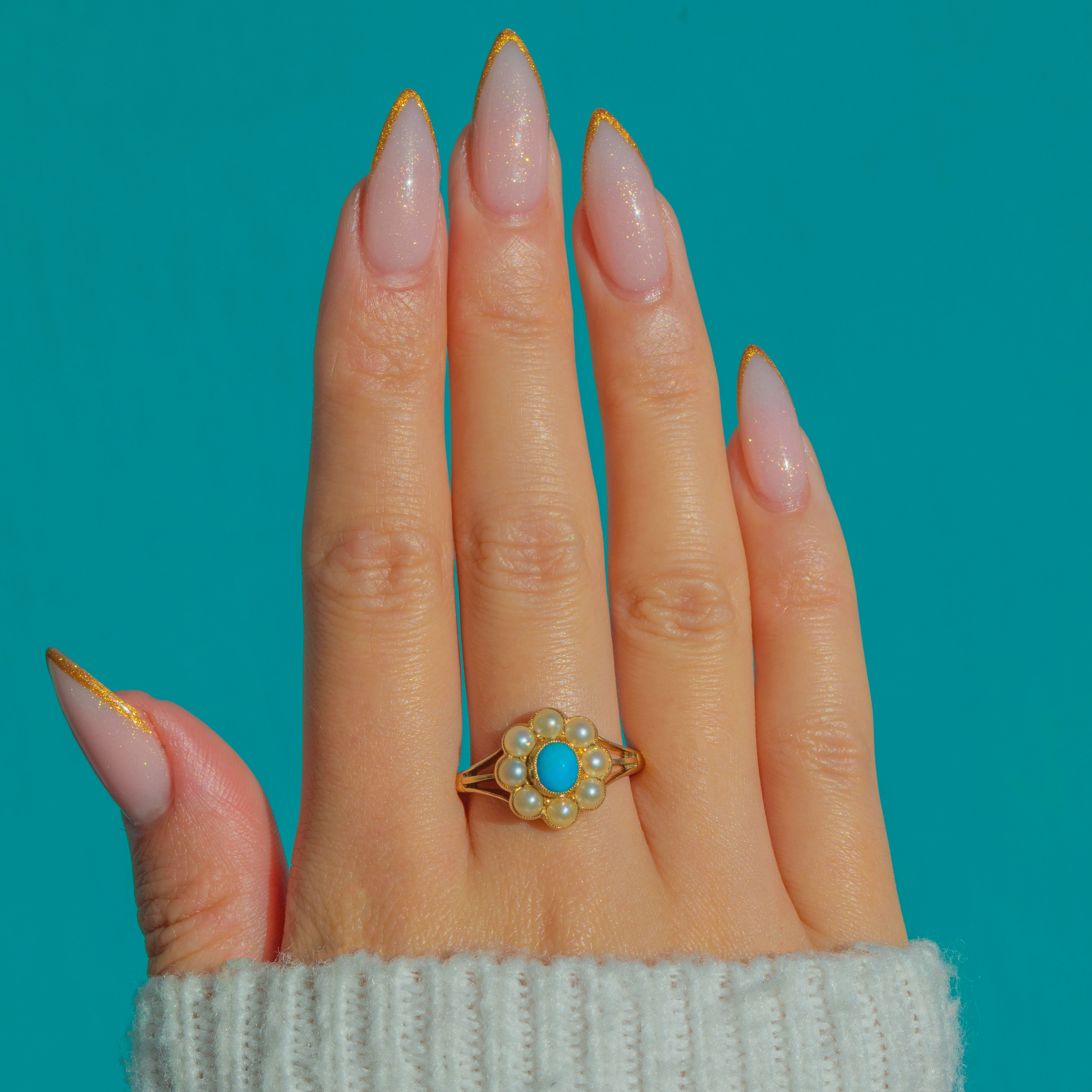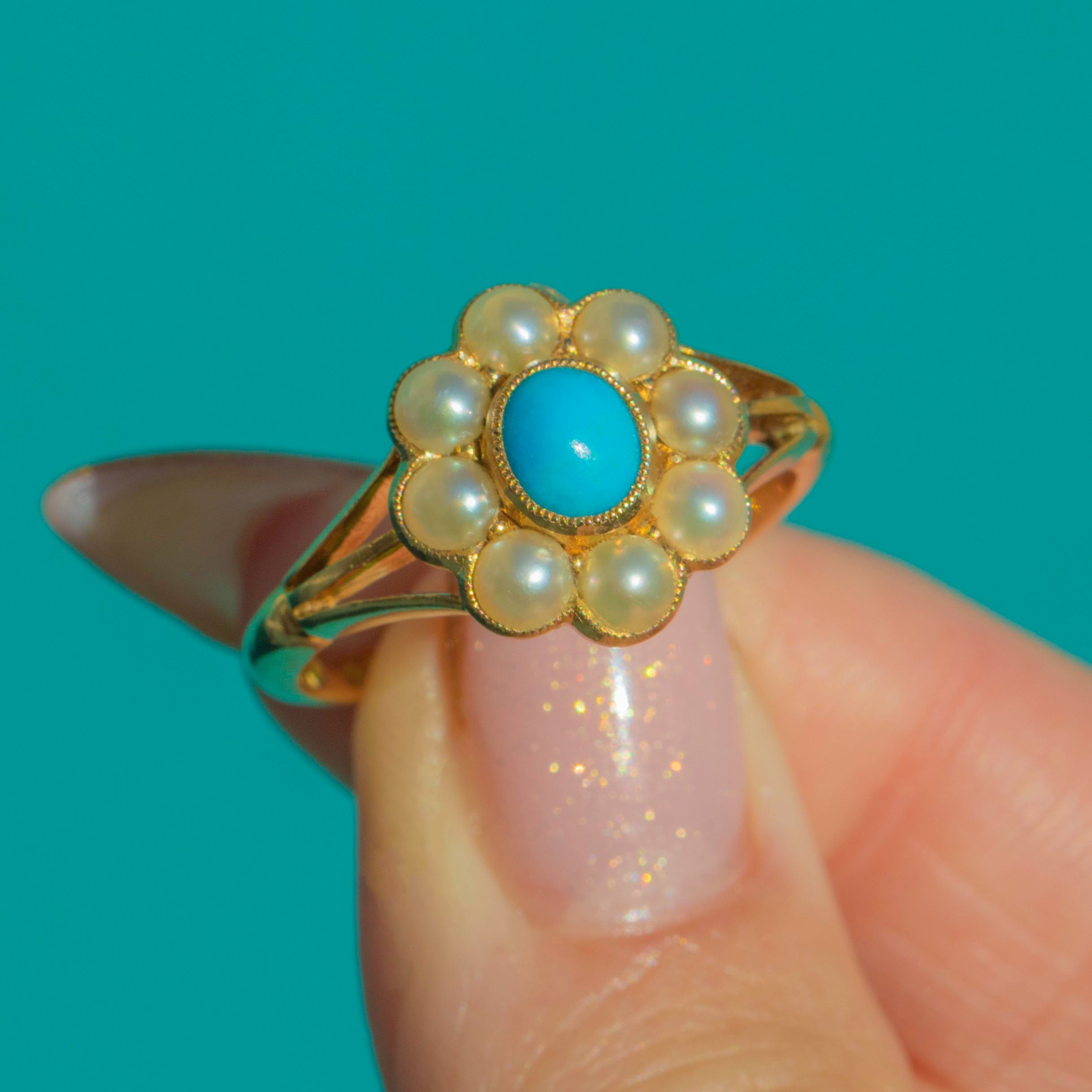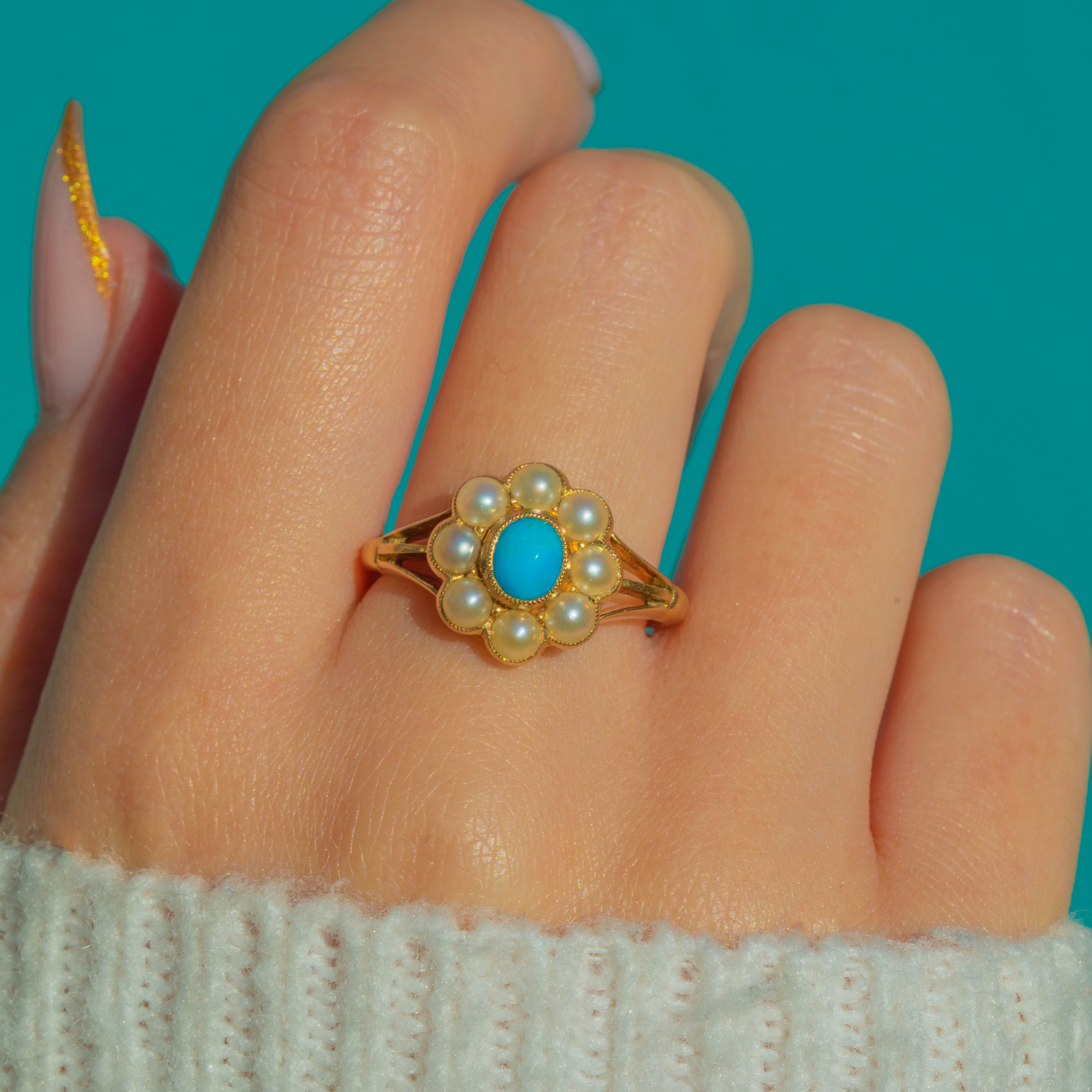 This romantic Victorian cluster ring is all about that joyful pop of colour. A bright oval Turquoise sits at the centre, its saturated blue hue glowing against rich 18ct Gold. Around it, a halo of creamy Pearls forms a charming daisy motif, framed with fine milgrain for a delicate, lacy edge.