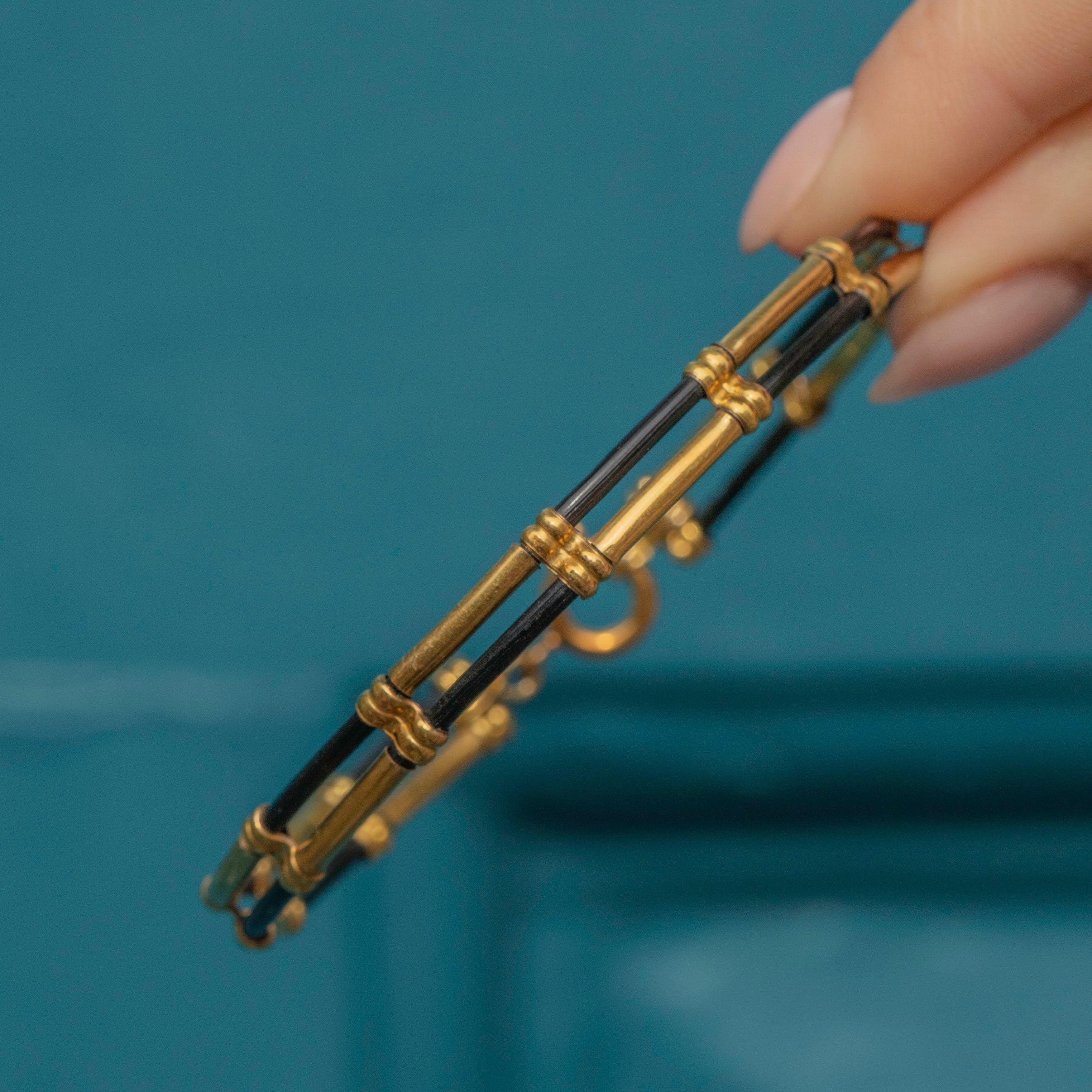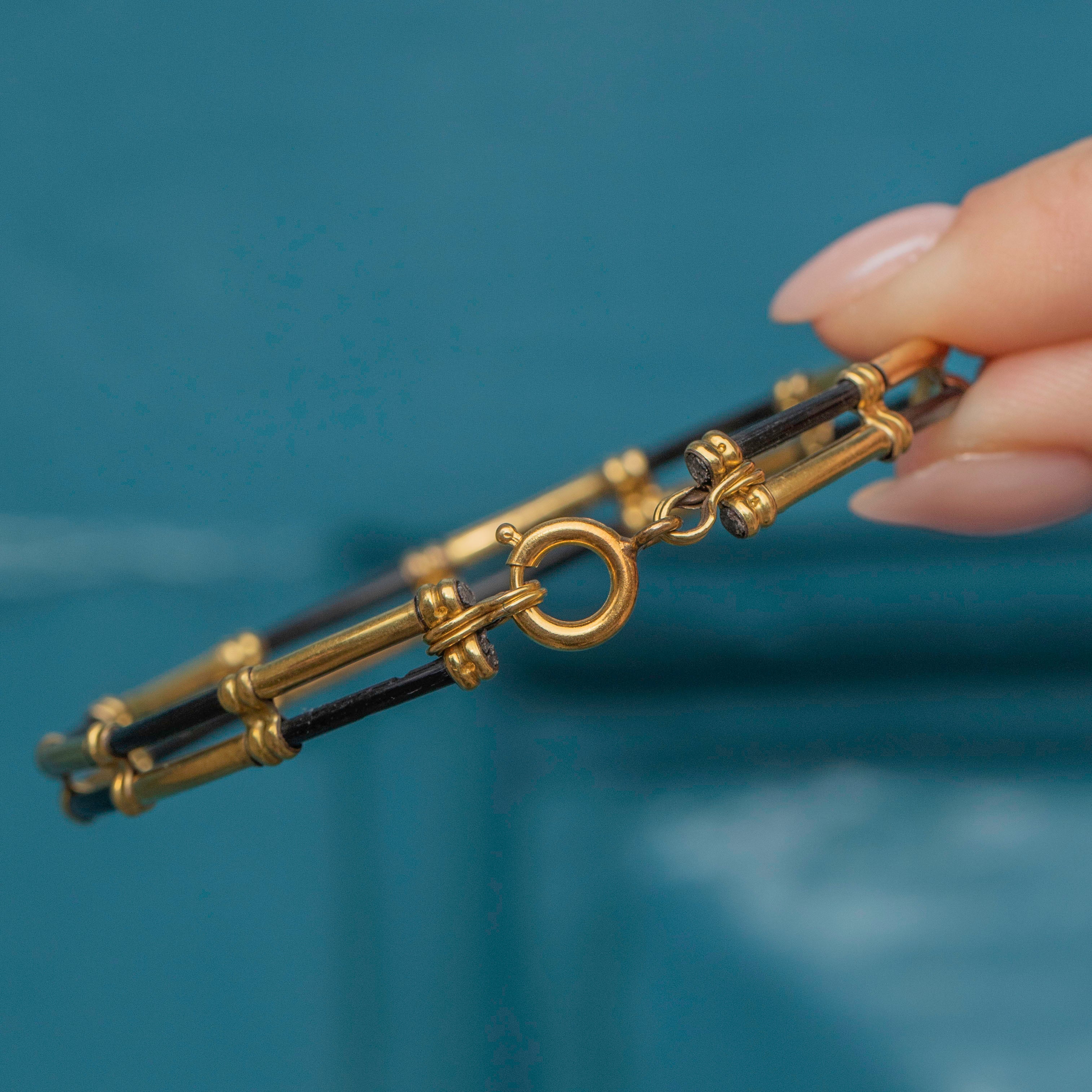 We are in love with this Victorian 18ct Gold plated elephant hair bangle! The antique bangle is a 18ct Gold plated Gold band and a strand of elephant hair joined by 18ct Gold plated crimp connectors! Elephant hair jewellery became very popular in the 19th century and we can certainly see why!
