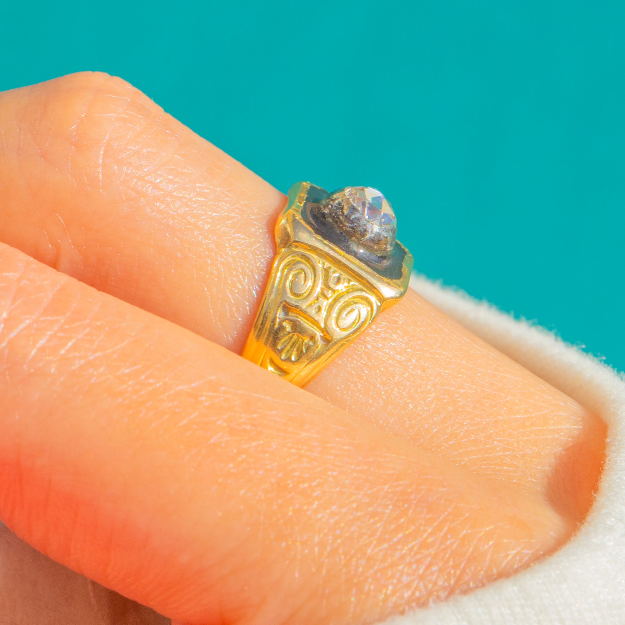 A refined Victorian ring with a deliciously inky Black Enamel surround framing a glowing rose-cut Diamond. The Diamond (approx. 0.35ct) is secured in a patinated Silver collet, its soft dome and glittering facets lending a romantic, antique sparkle. Crafted in warm 18ct Gold, the shoulders are adorned with chased foliate scrolls for an elegant, historic finish.