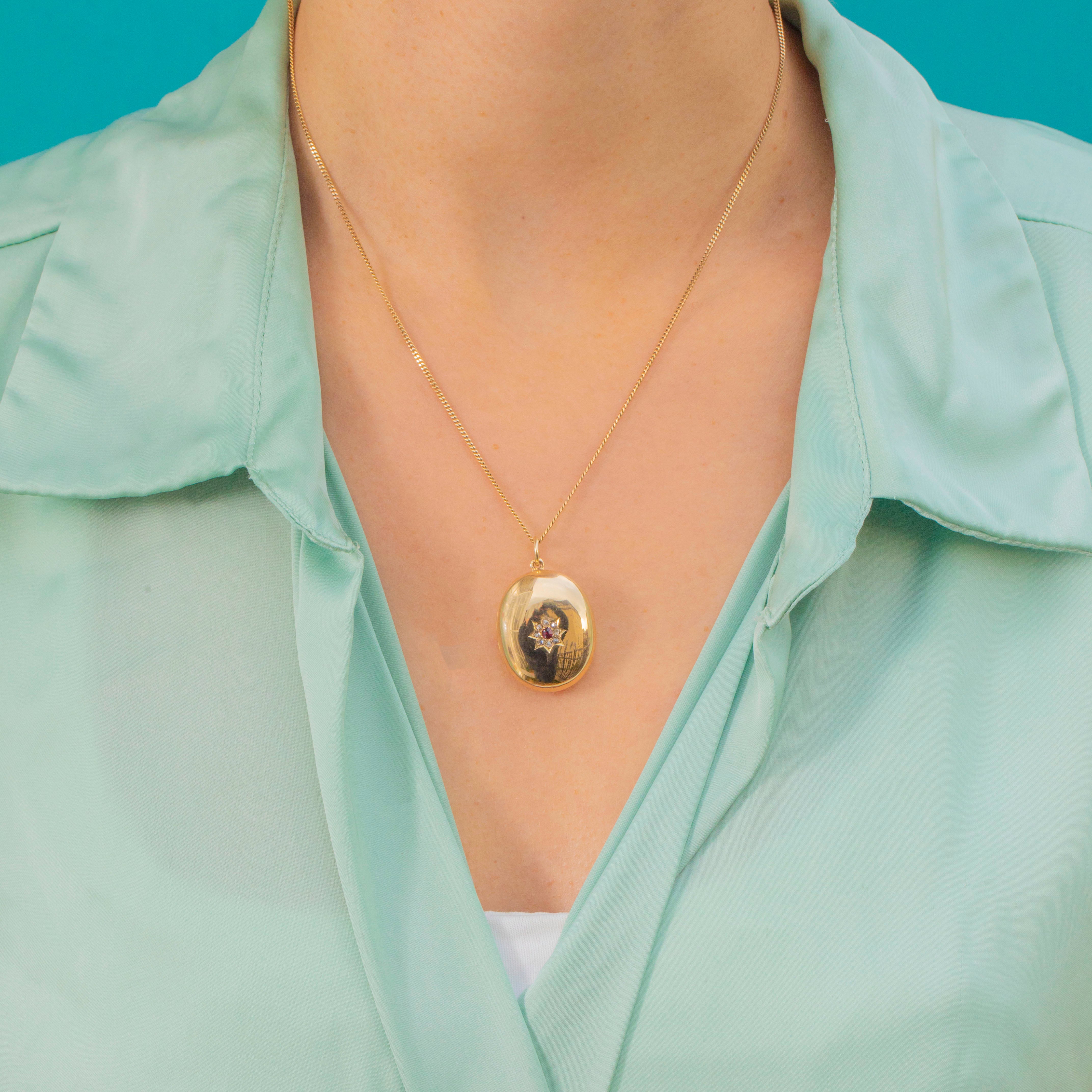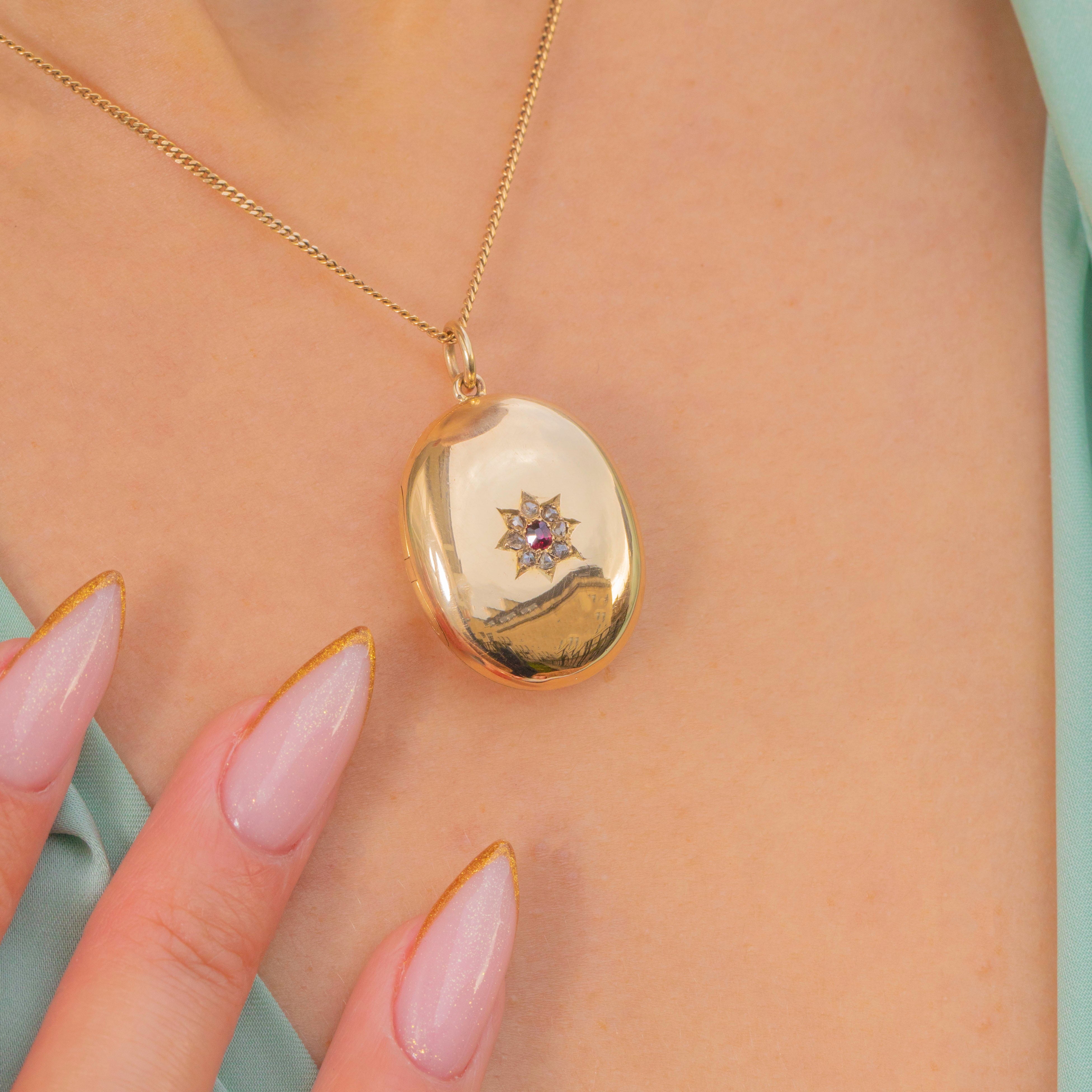 This exquisite late Victorian locket is a true treasure, crafted in luxurious 18ct Gold and displaying a radiant oval Ruby framed by twinkling rose-cut Diamonds in an ornate star-setting. The rich, buttery Gold gleams beautifully against the soft sparkle of the antique Diamonds, creating a timeless and romantic look.