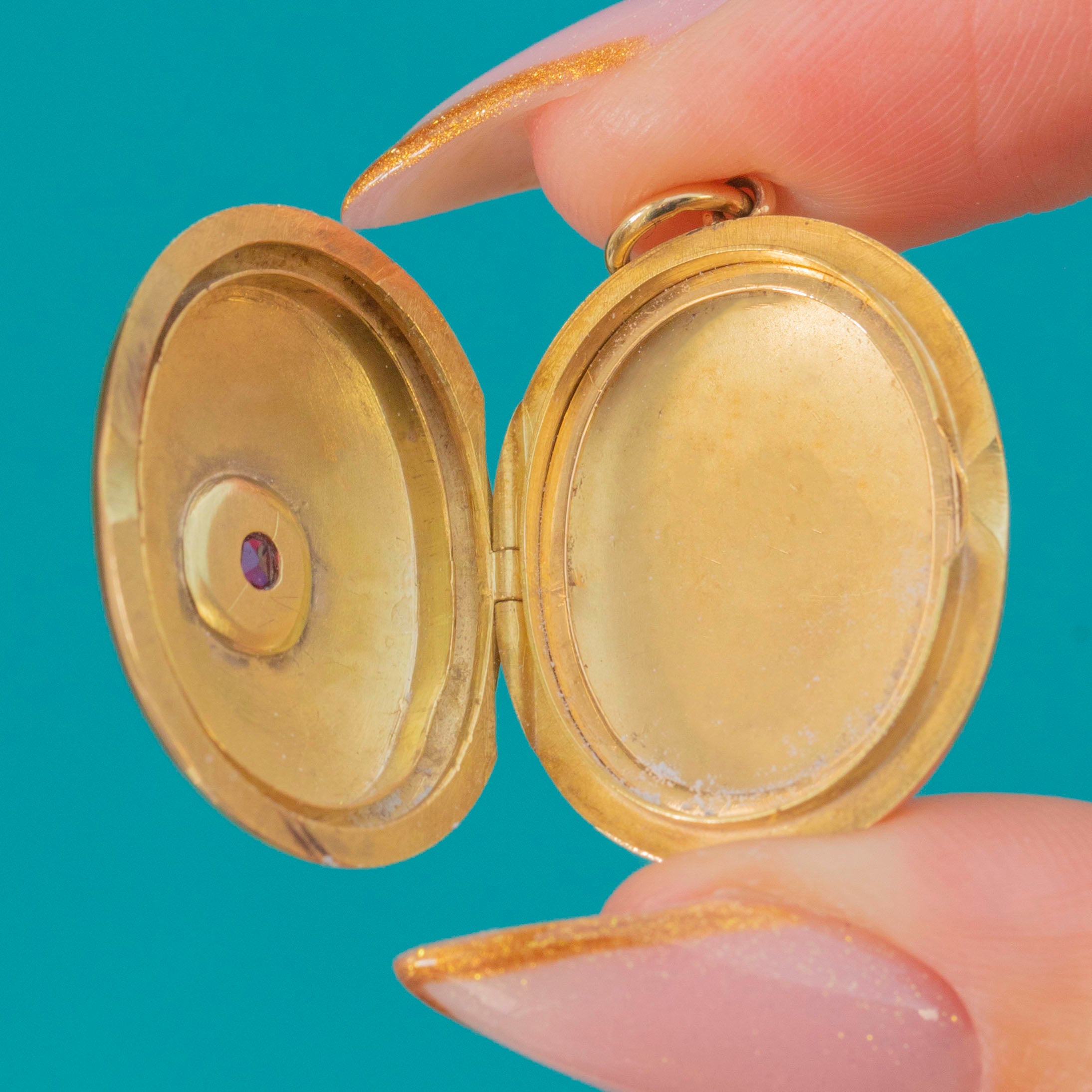 EXCELLENT: The locket is in superb condition with no chips or damage. The Ruby and Diamonds are secure and bright, and the locket retains its original glass frame and rich antique patina.