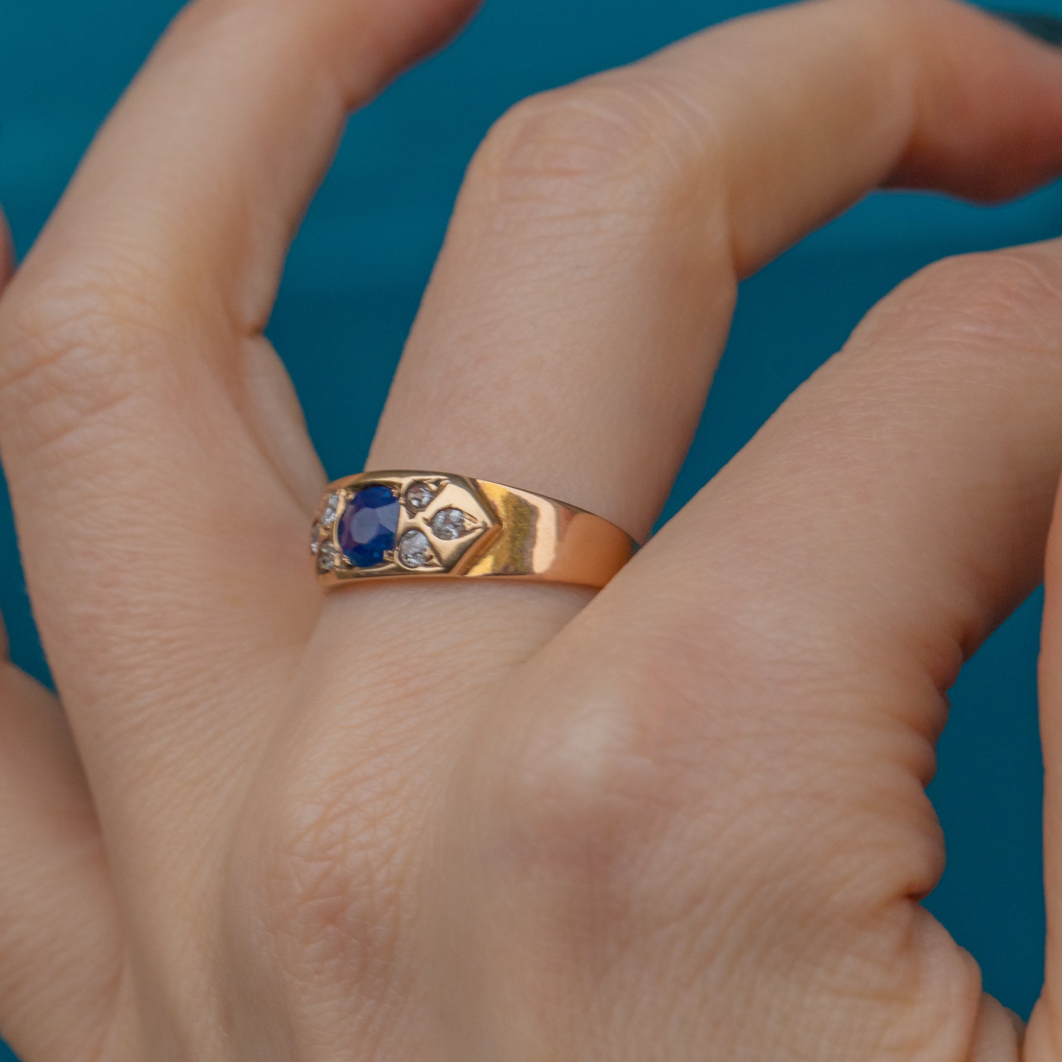 The royal blue hue of the Sapphire is perfectly complemented by the buttery Gold, framed by a sprinkling of twinkling Diamonds. With a low profile making this antique gypsy ring perfect for everyday wear, you can easily style it as a standalone piece or stacked amongst your other favourite gems!