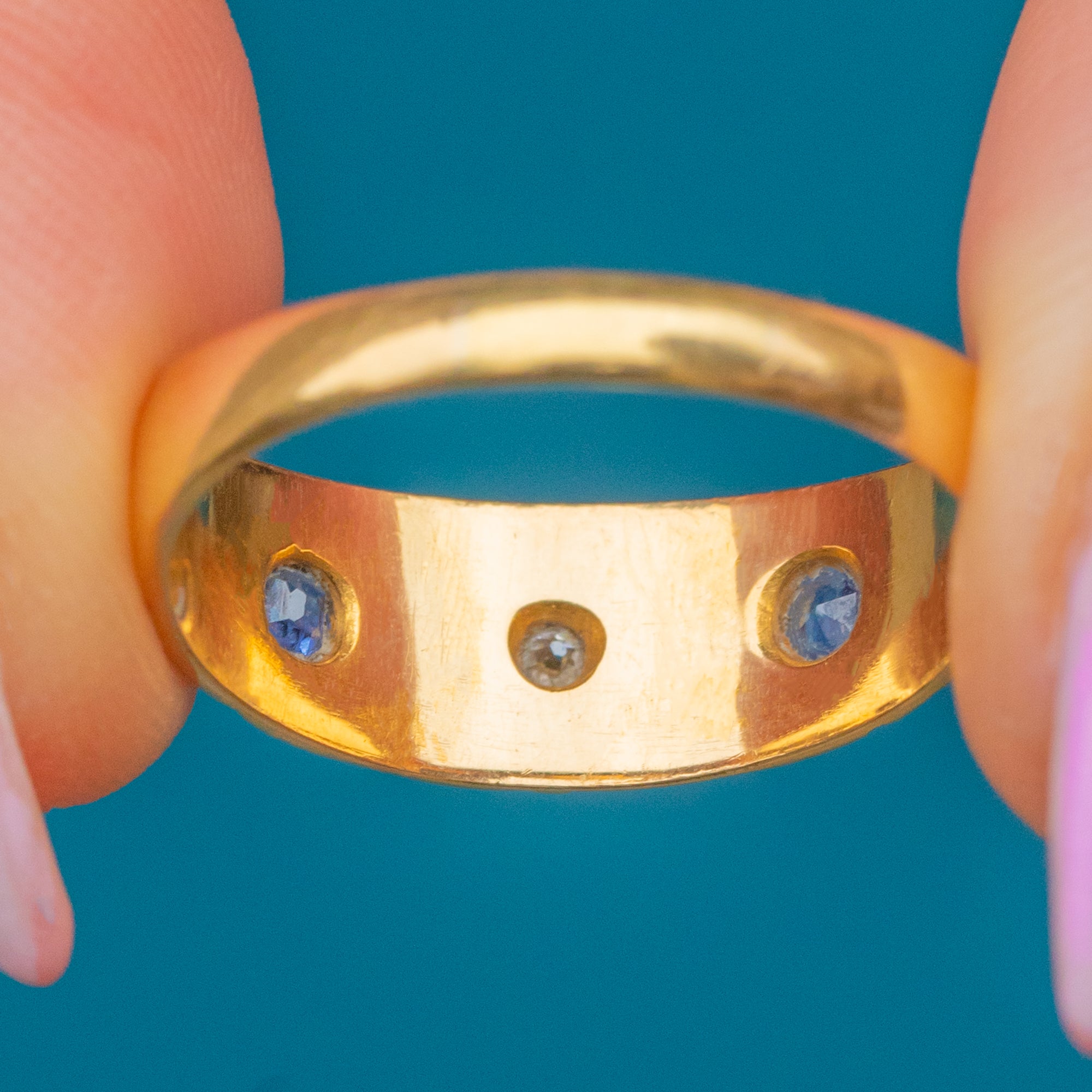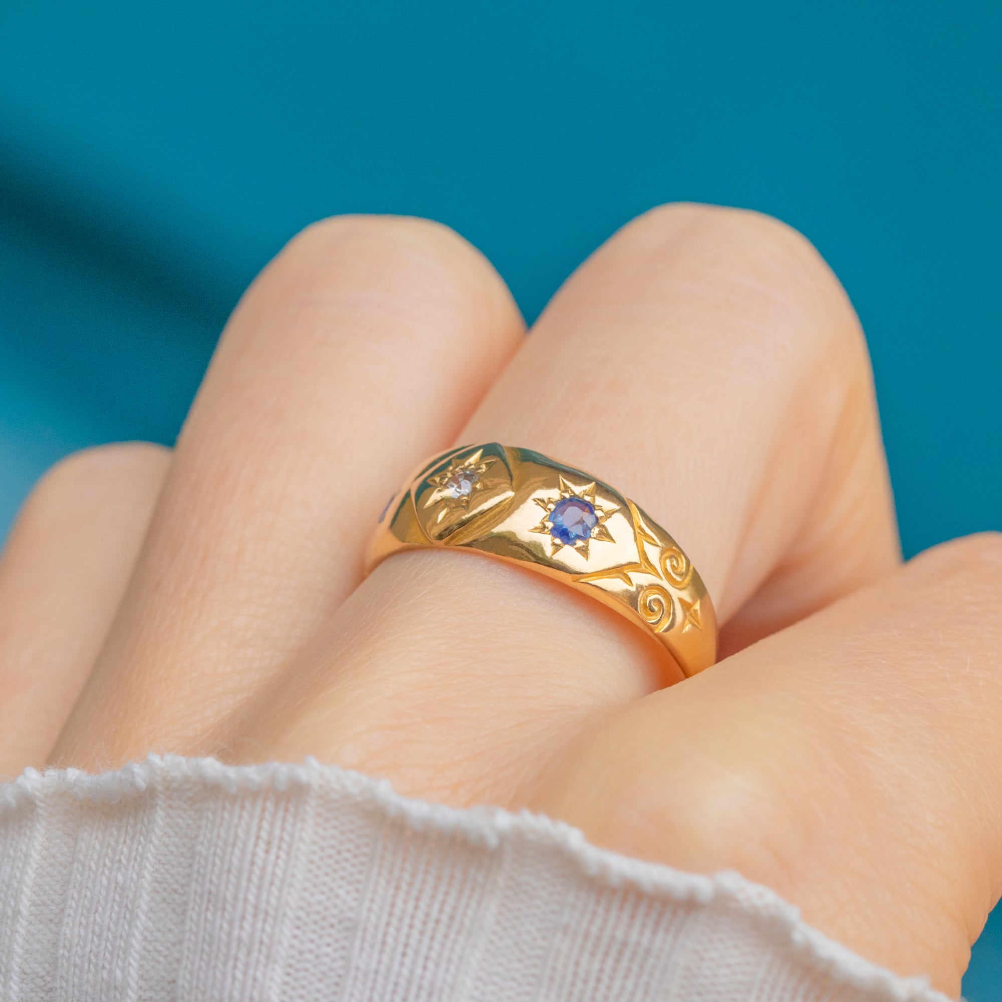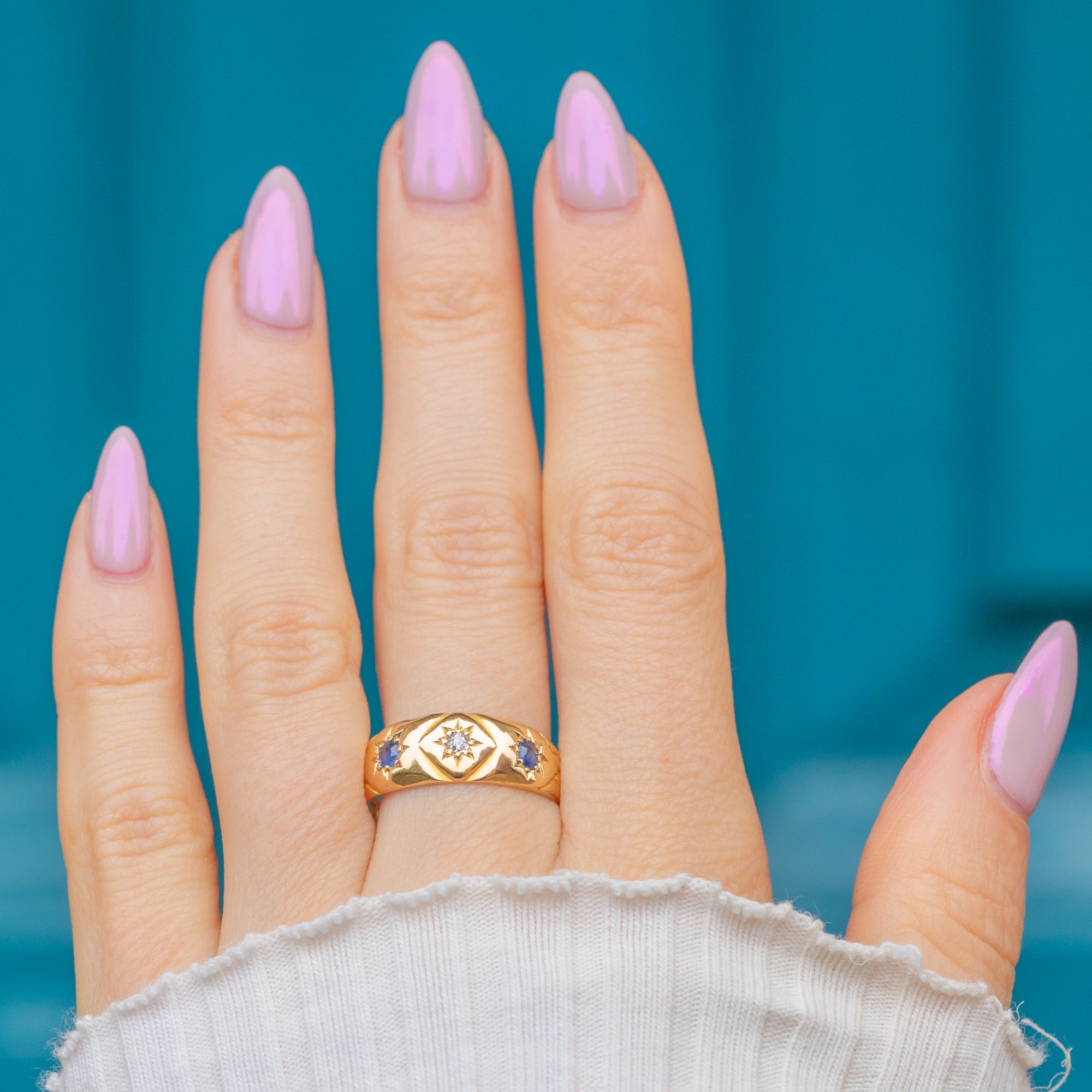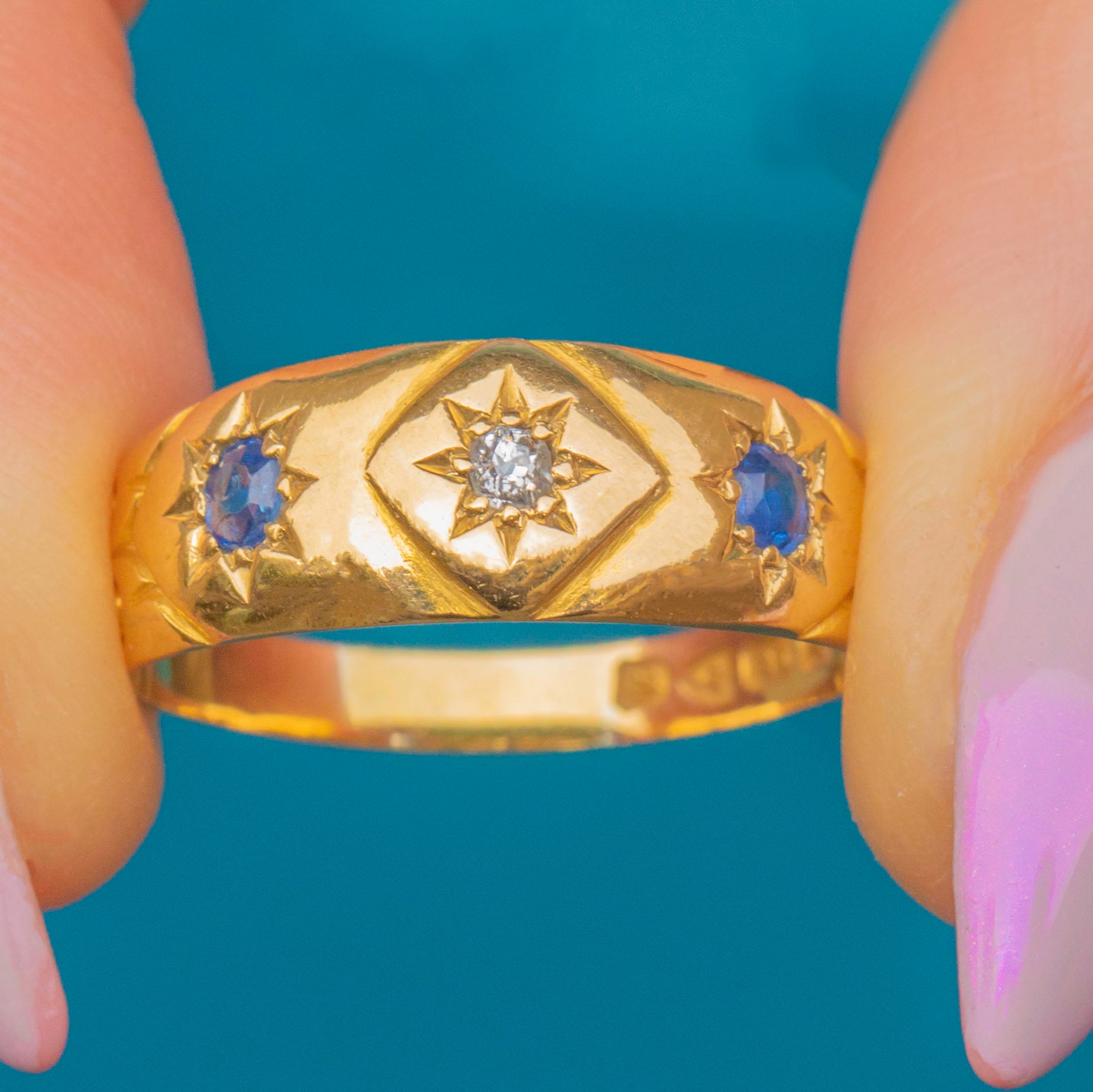 A stunning Victorian gypsy ring crafted in rich 18ct Gold, star-set with a twinkling Diamond framed by two bright blue Sapphires. The bold, tapering band and crisp star settings are beautifully proportioned, reflecting the fine craftsmanship of mid-19th-century Chester jewellers.