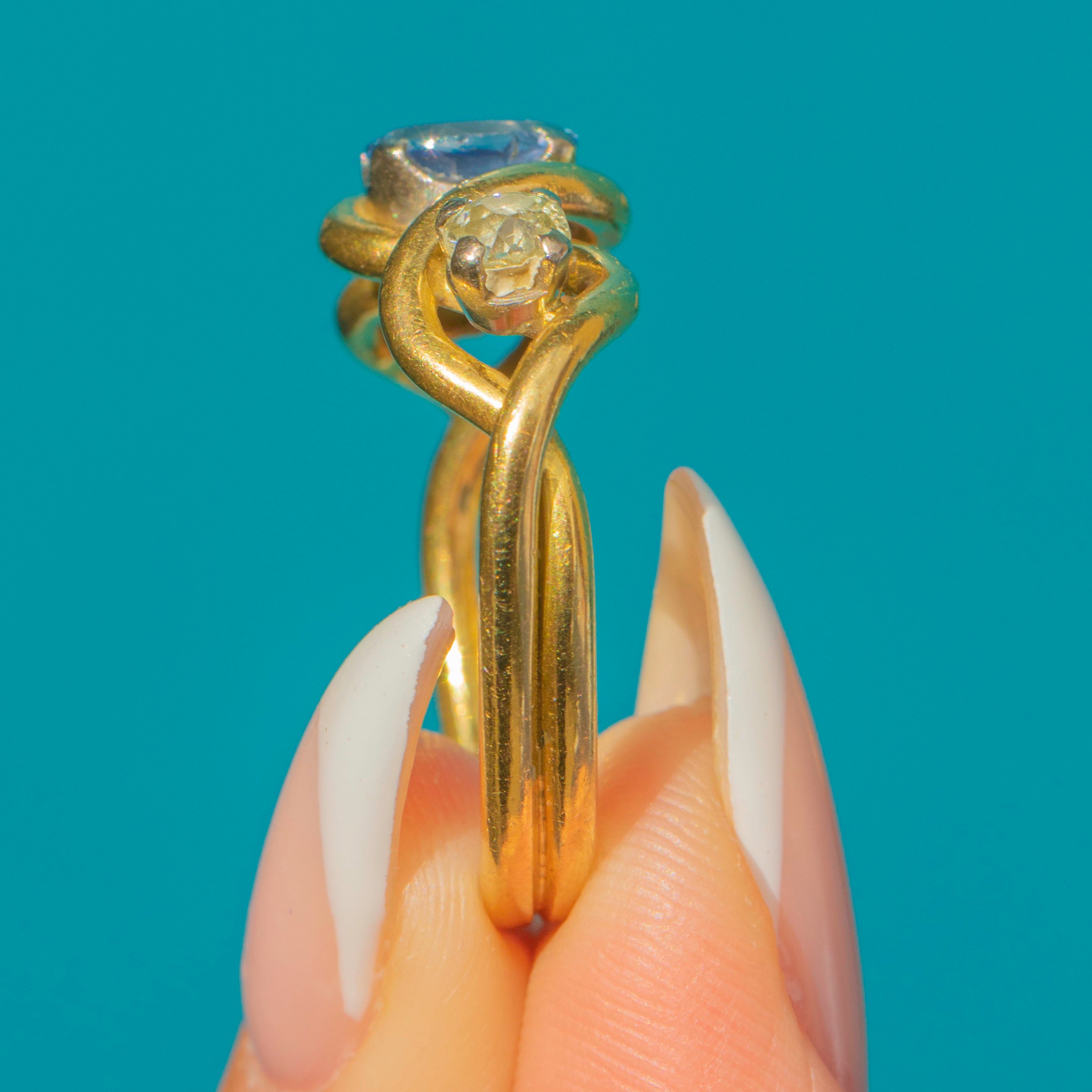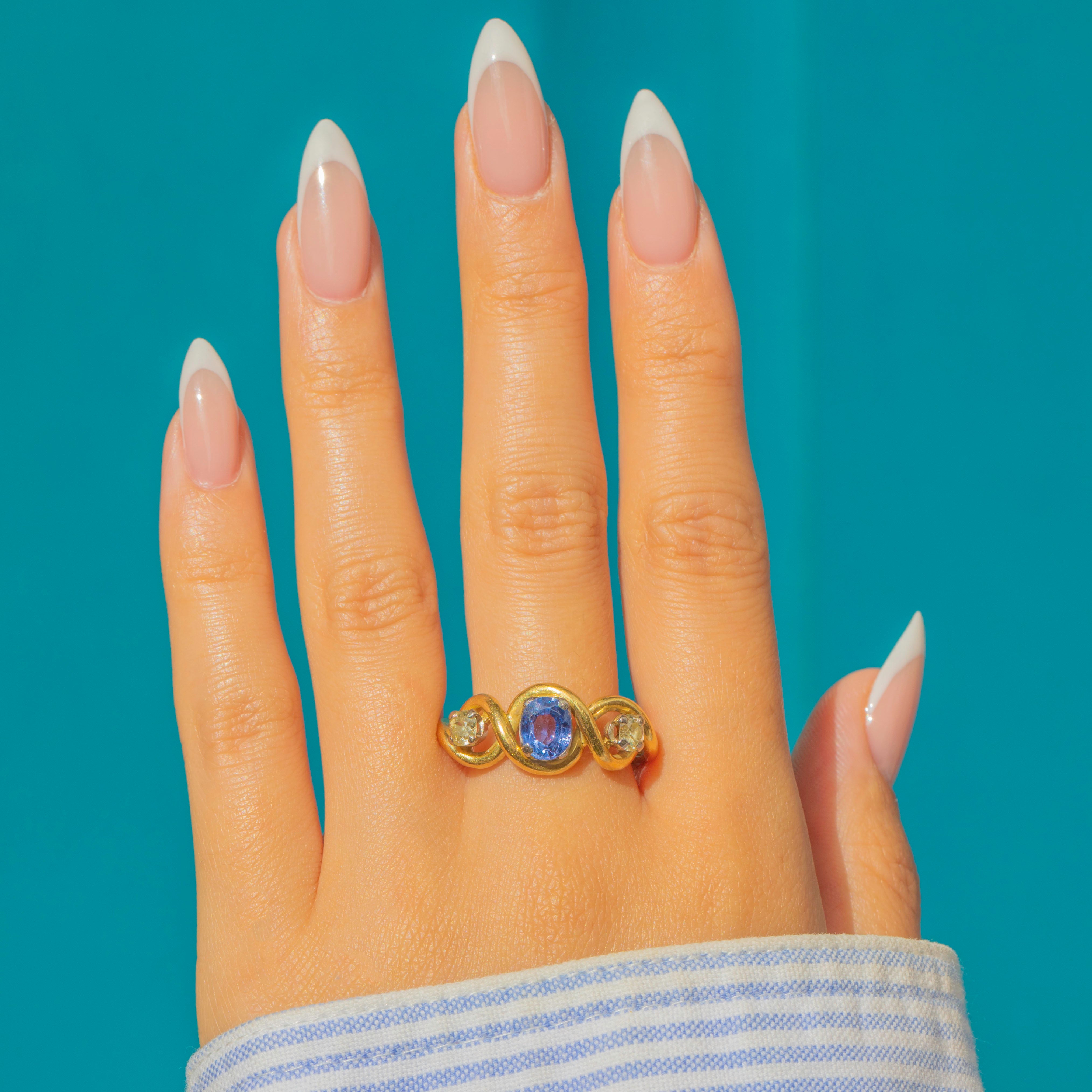 A charming late Victorian twist ring in rich 18ct Gold, featuring a vibrant oval Sapphire flanked by two Old Mine Cut Diamonds. The deeply cut Diamonds sparkle with antique fire, beautifully offsetting the Sapphire’s cool blue glow. The twisting Gold shoulders sweep gracefully around the stones, lending the piece a dynamic, romantic feel characteristic of the era.