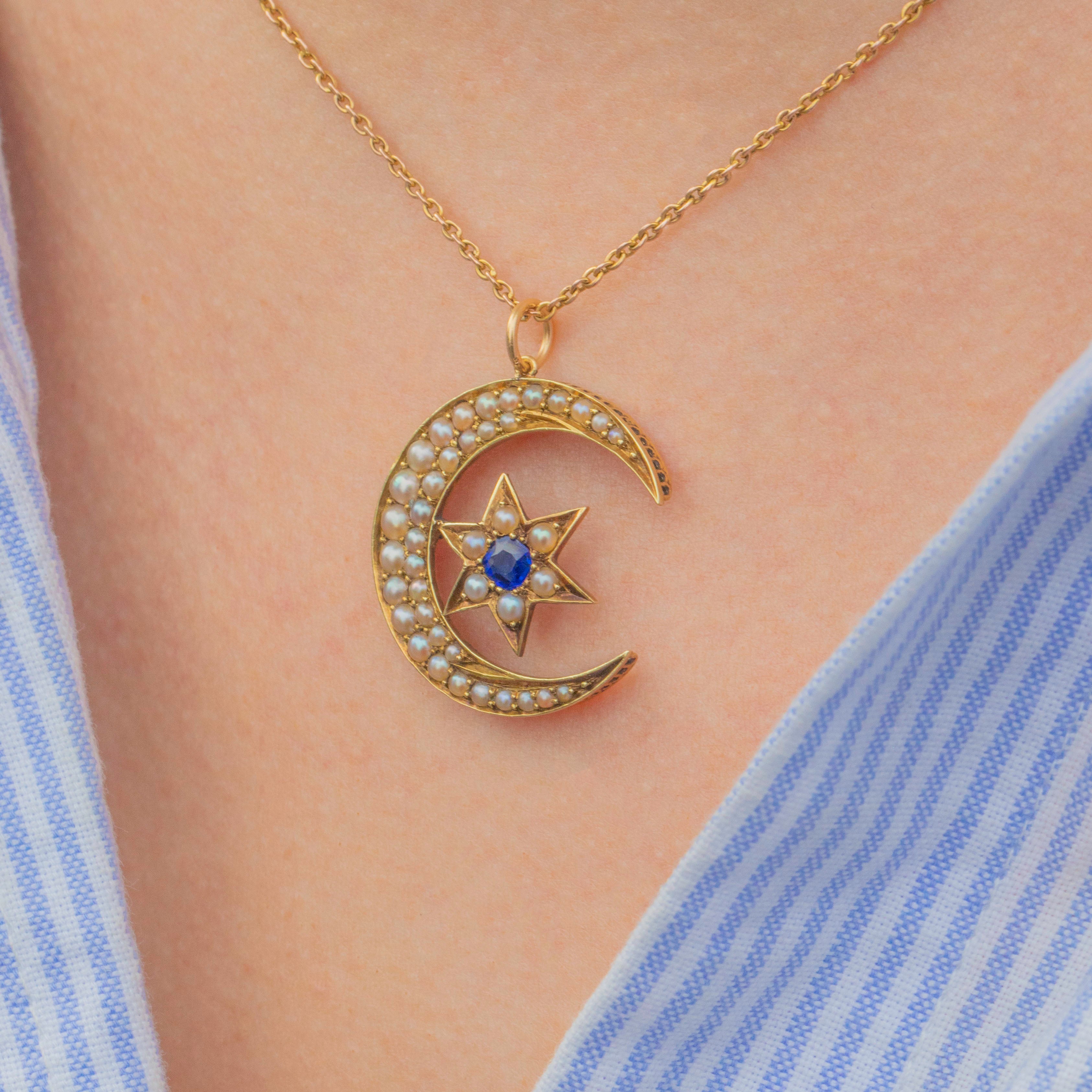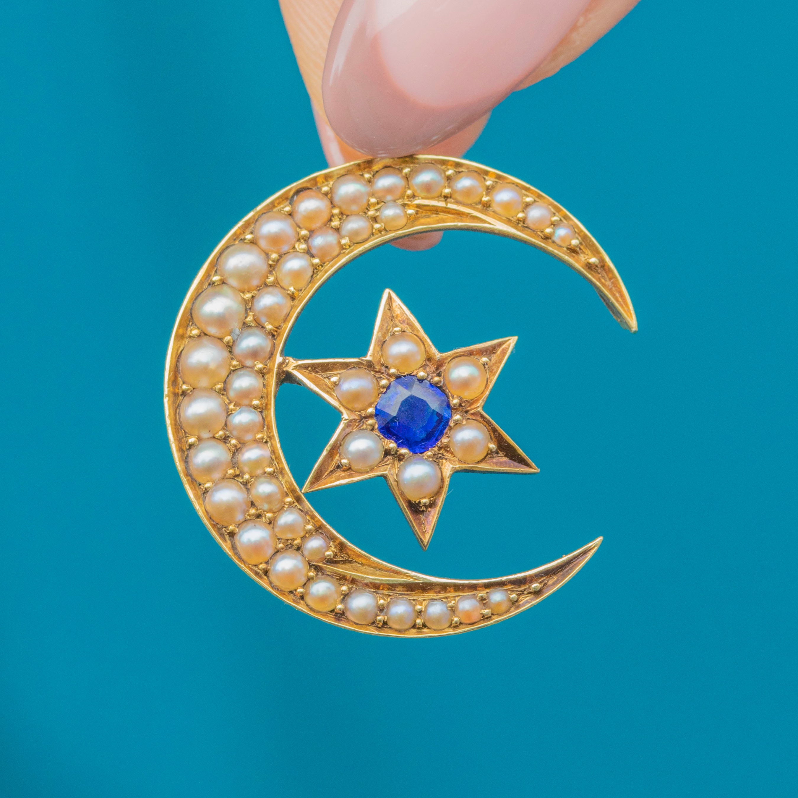 Victorian 18ct Gold Sapphire Pearl Crescent Moon & Star Pendant