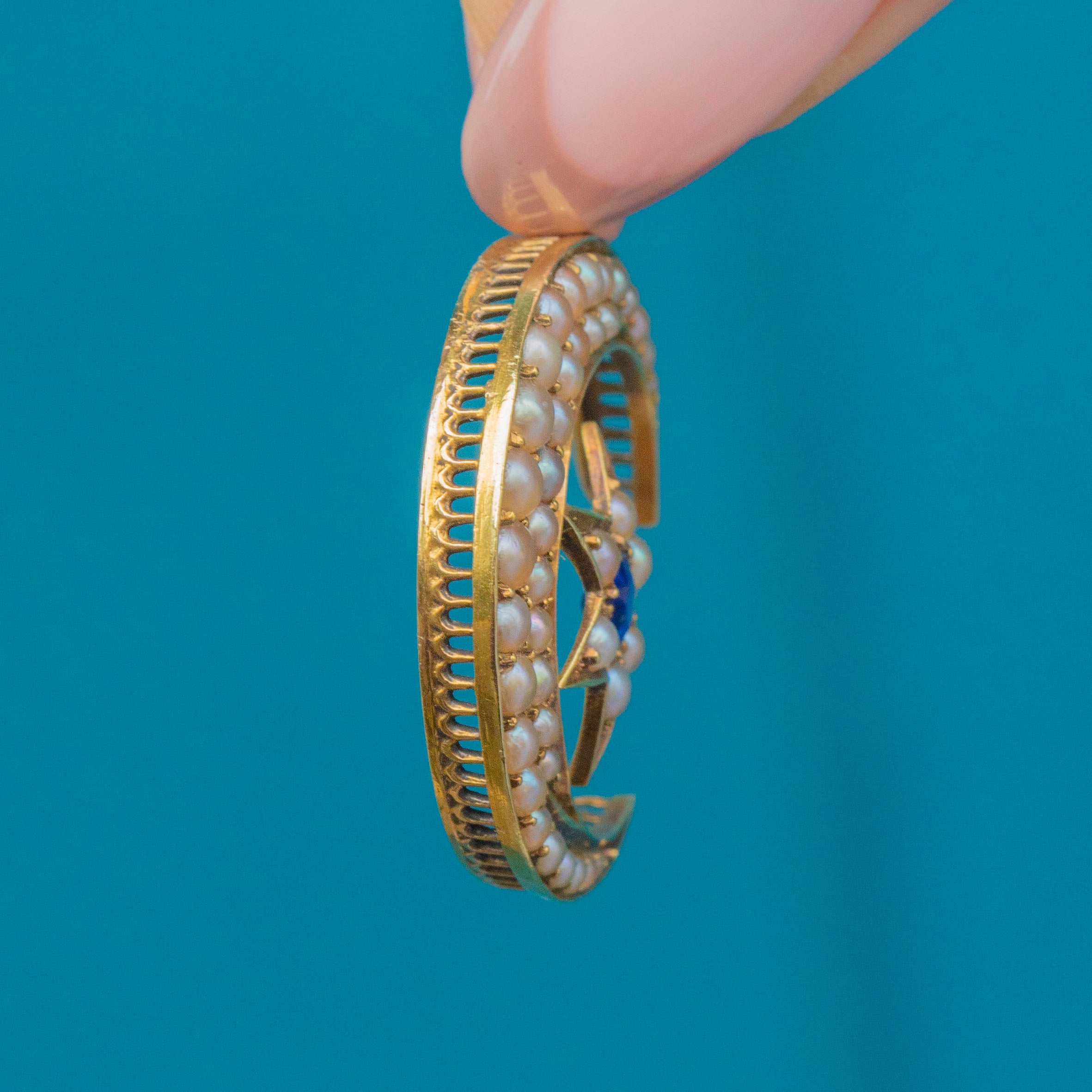 VERY GOOD. This Victorian 18ct Gold Sapphire Pearl crescent moon and star pendant is in very good condition. Her Sapphire is radiant, and her Pearls iridescent, free from any scuffs or scratches. They sit securely within their 18ct Gold setting which show some minor marks, commensurate with age. However this does not detract from her beauty or functionality, and she is the perfect elegant piece to add to your collection.