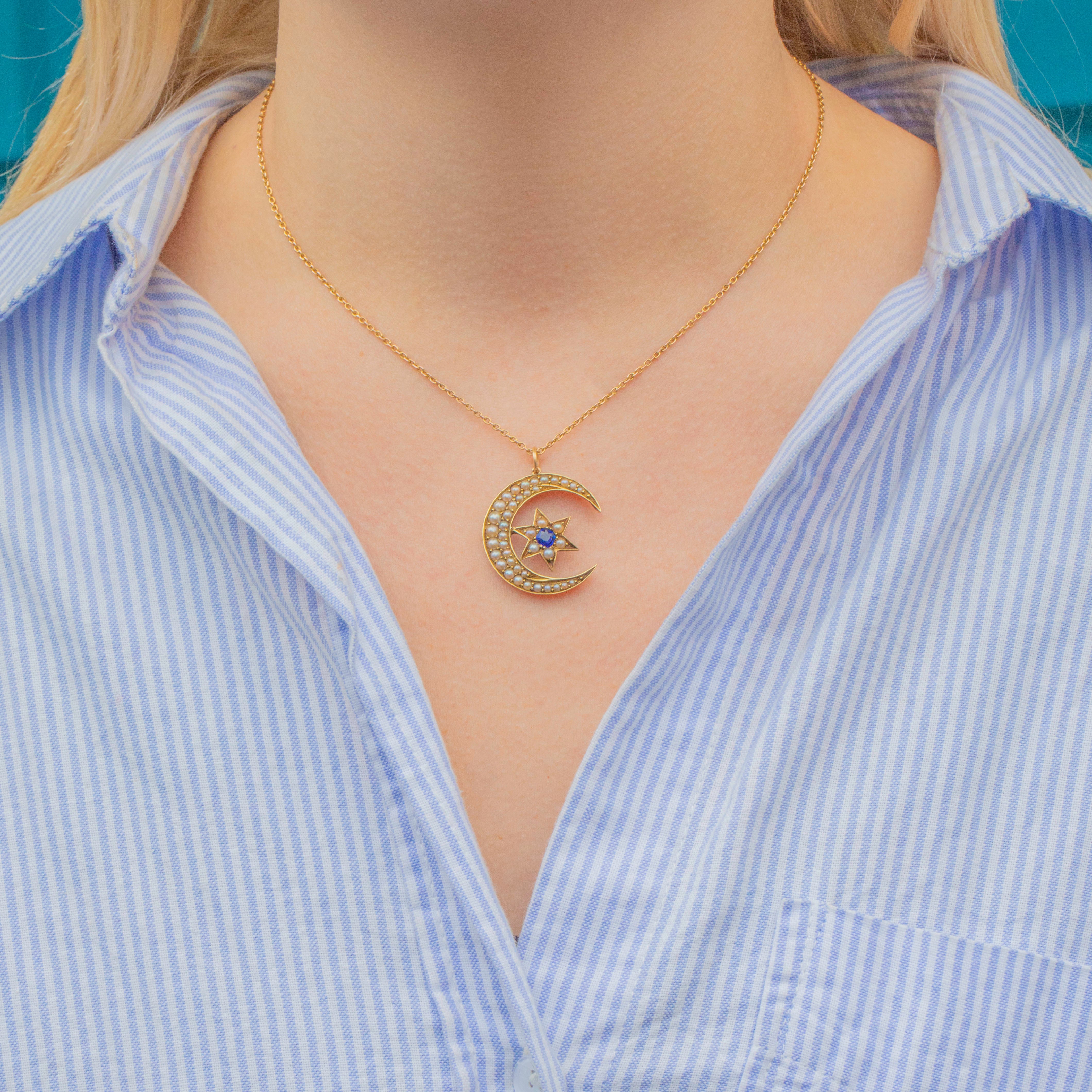 We adore this enchanting Victorian 18ct Gold Sapphire Pearl crescent moon and star pendant!