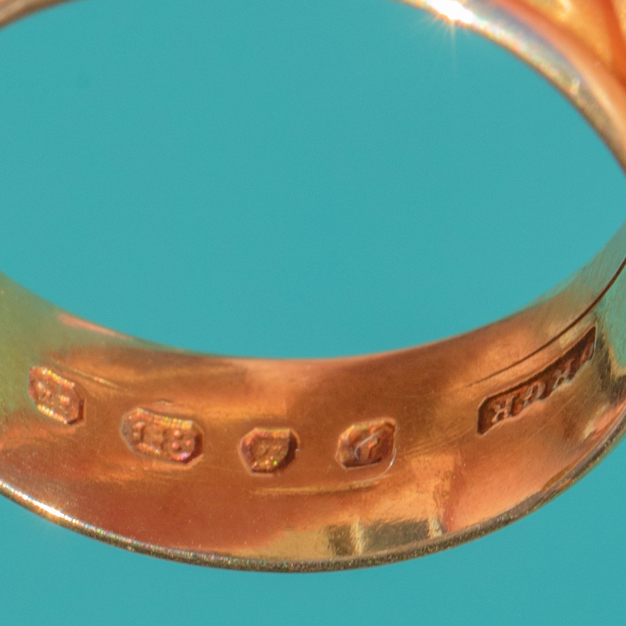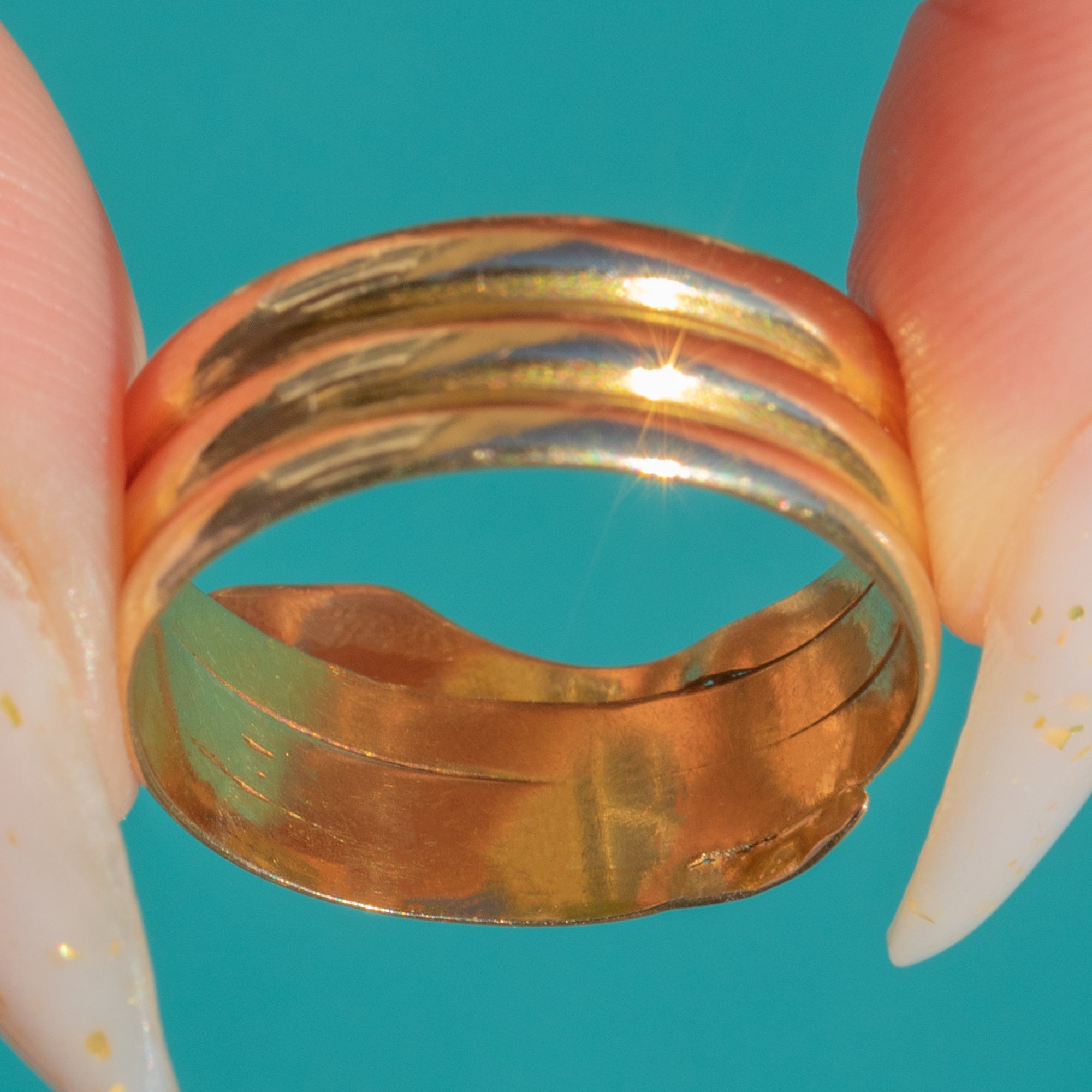 EXCELLENT: The Gold retains a bright, even polish with only light surface wear commensurate with age. The tiny eye details are pronounced and neatly finished. A historic resizing seam is visible on the inner shank; the triple-coil band remains strong and well-preserved overall.