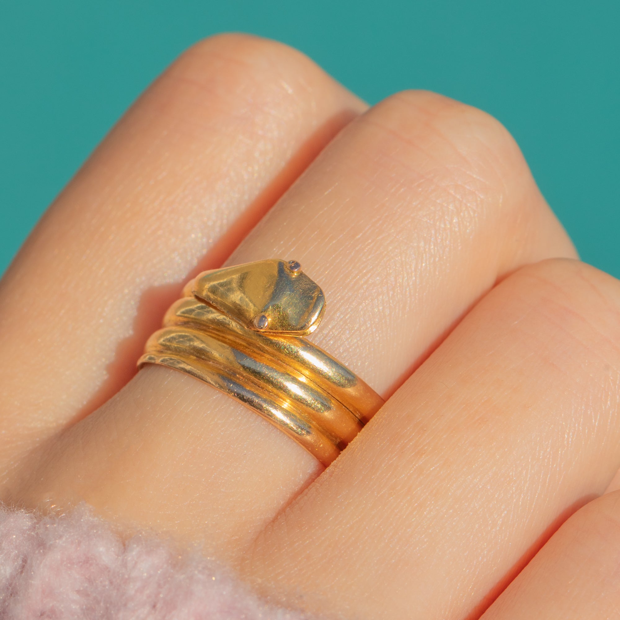 Sinuous and sculptural, this Victorian 18ct Gold snake ring coils three times around the finger with sleek, high-polish grace. Its stylised head is finished with two tiny eye accents, bringing the motif to life while keeping the profile low and eminently wearable.