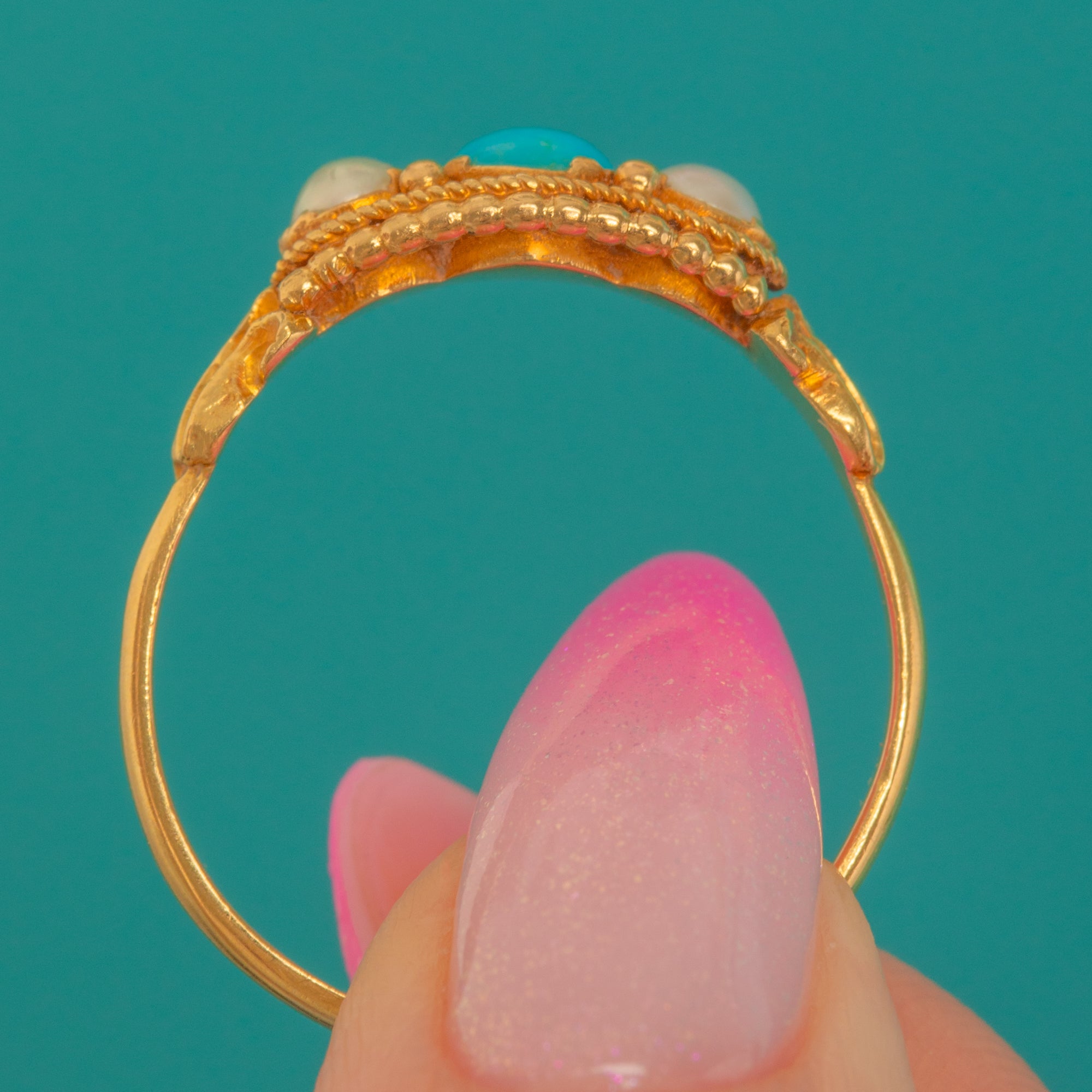 A delicate Victorian three-stone ring, gleaming in rich 18ct Gold with a bright sky blue Turquoise cabochon at the centre and creamy Pearls to each side. The trio is framed by a pretty rope border, with softly foliate, lightly ribbed shoulders lending an ornate, romantic finish.