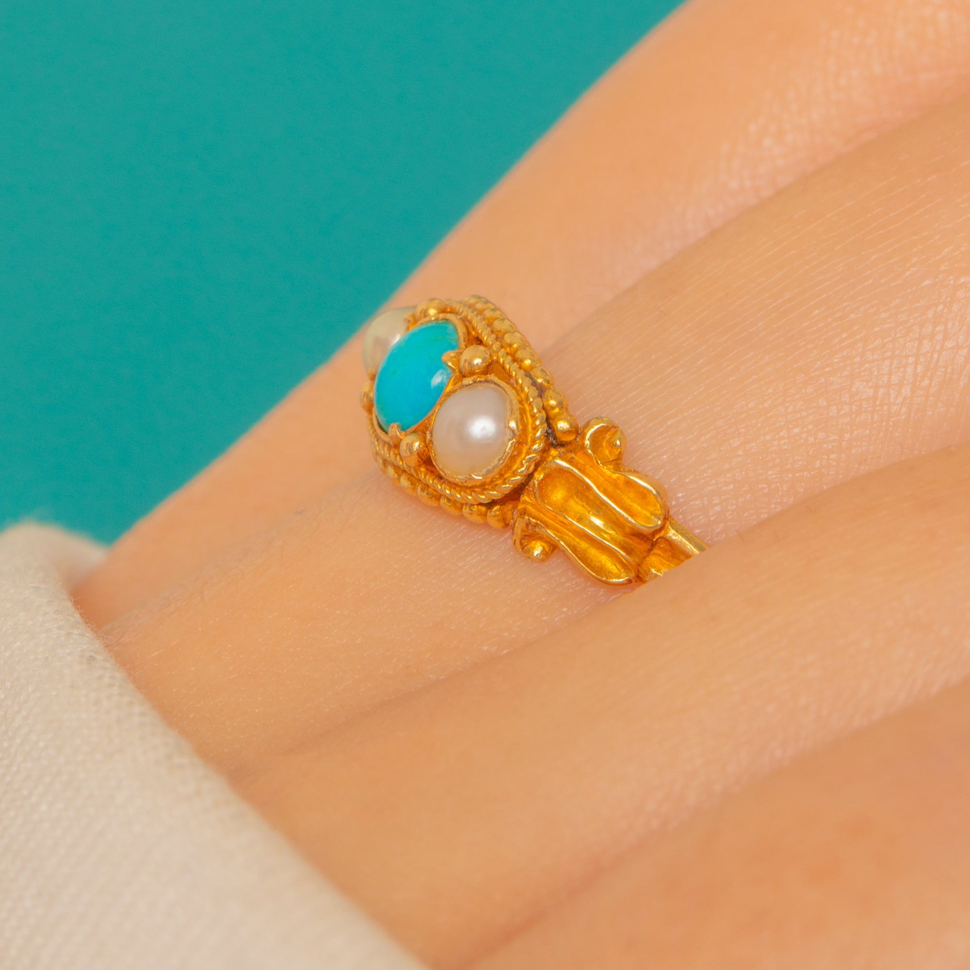 EXCELLENT: The Turquoise and Pearls are secure and display only the most minimal surface wear visible under close inspection. The Gold setting and shank are in excellent order with light age-related marks and a lovely patina; subtle solder/tool marks are visible near the head. Overall the ring has been well cared for, with wear commensurate with age and no notable damage.