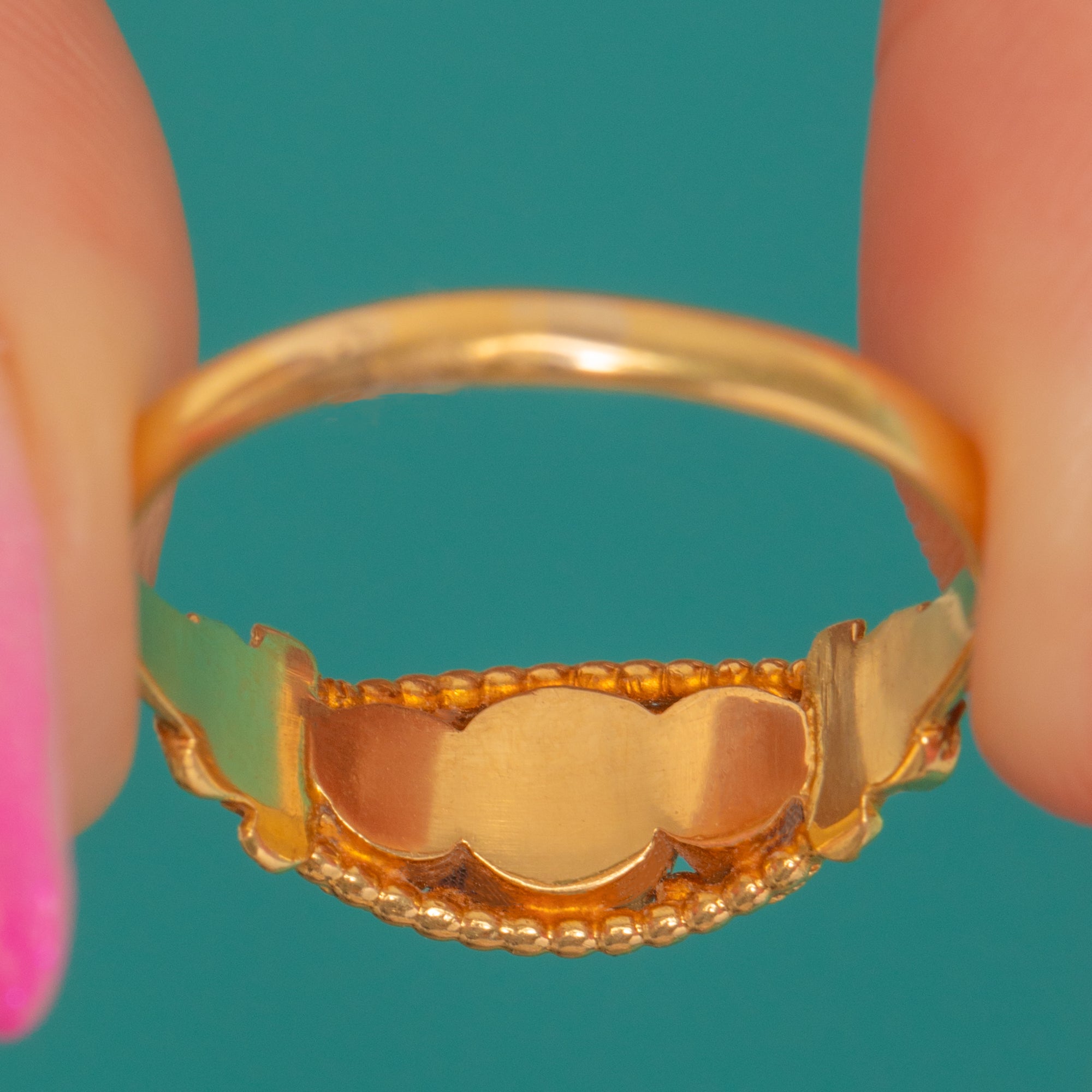 Low-profile and dainty, this piece blends charming colour with fine decorative detailing. Closed-back settings and applied granulation showcase the period craftsmanship, making it a beautiful choice to wear alone or stack with other favourites.