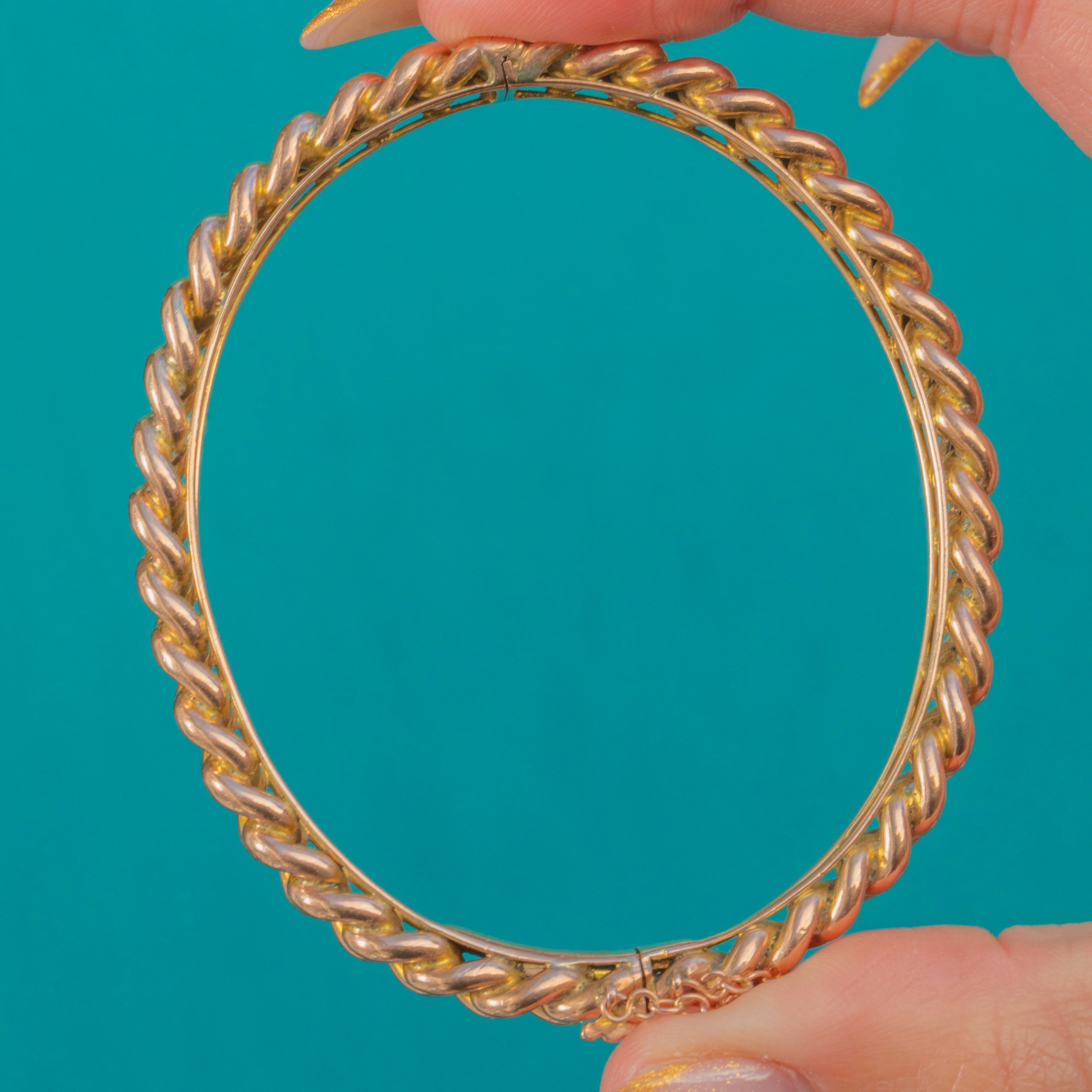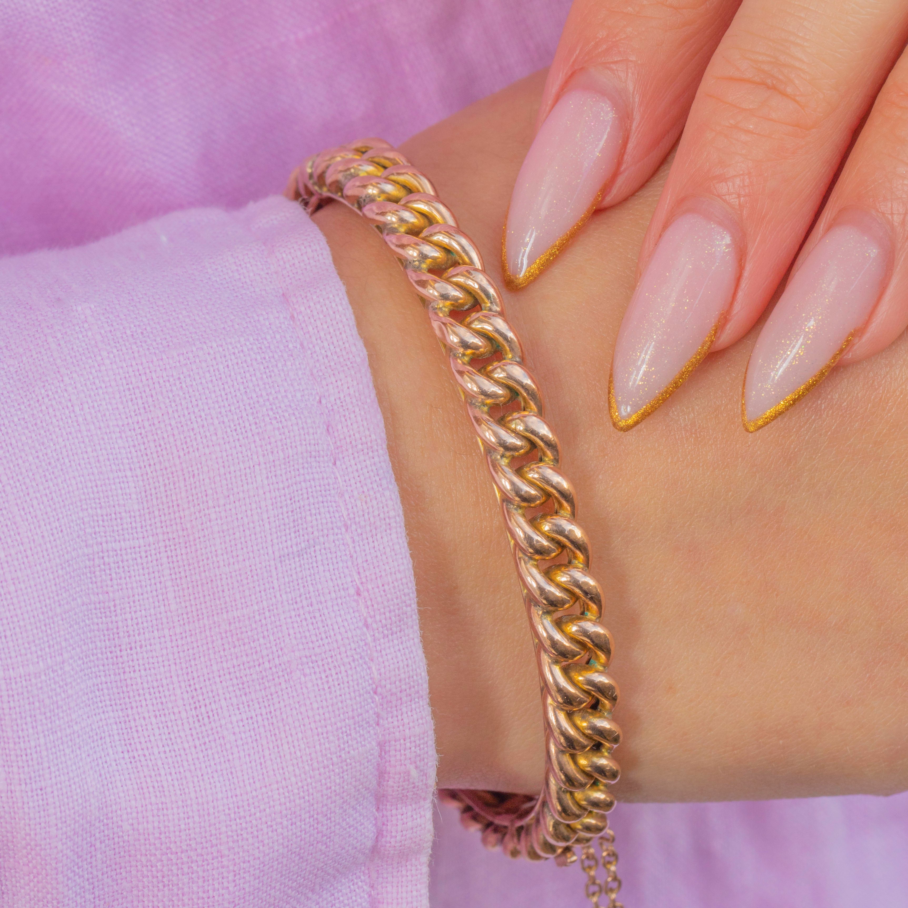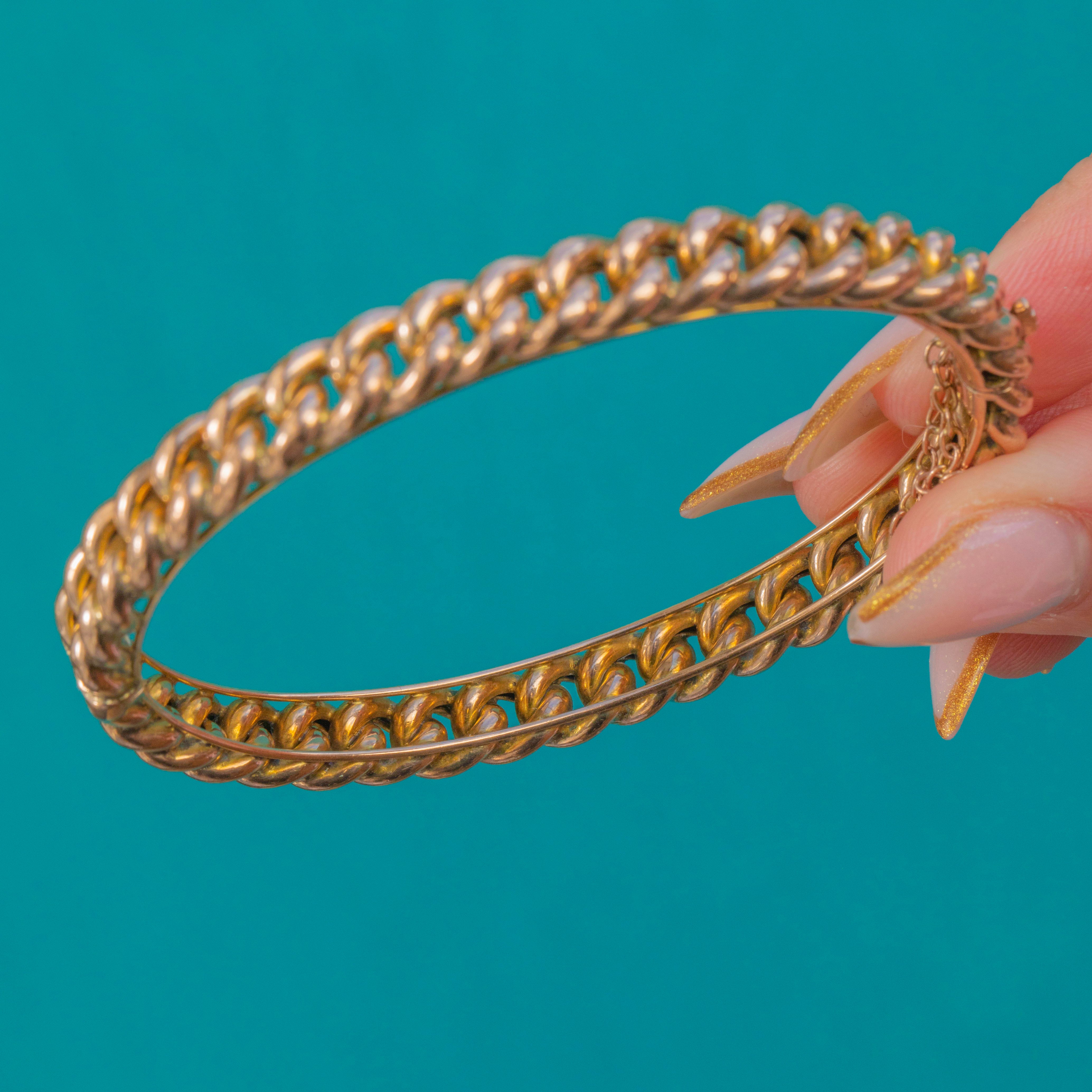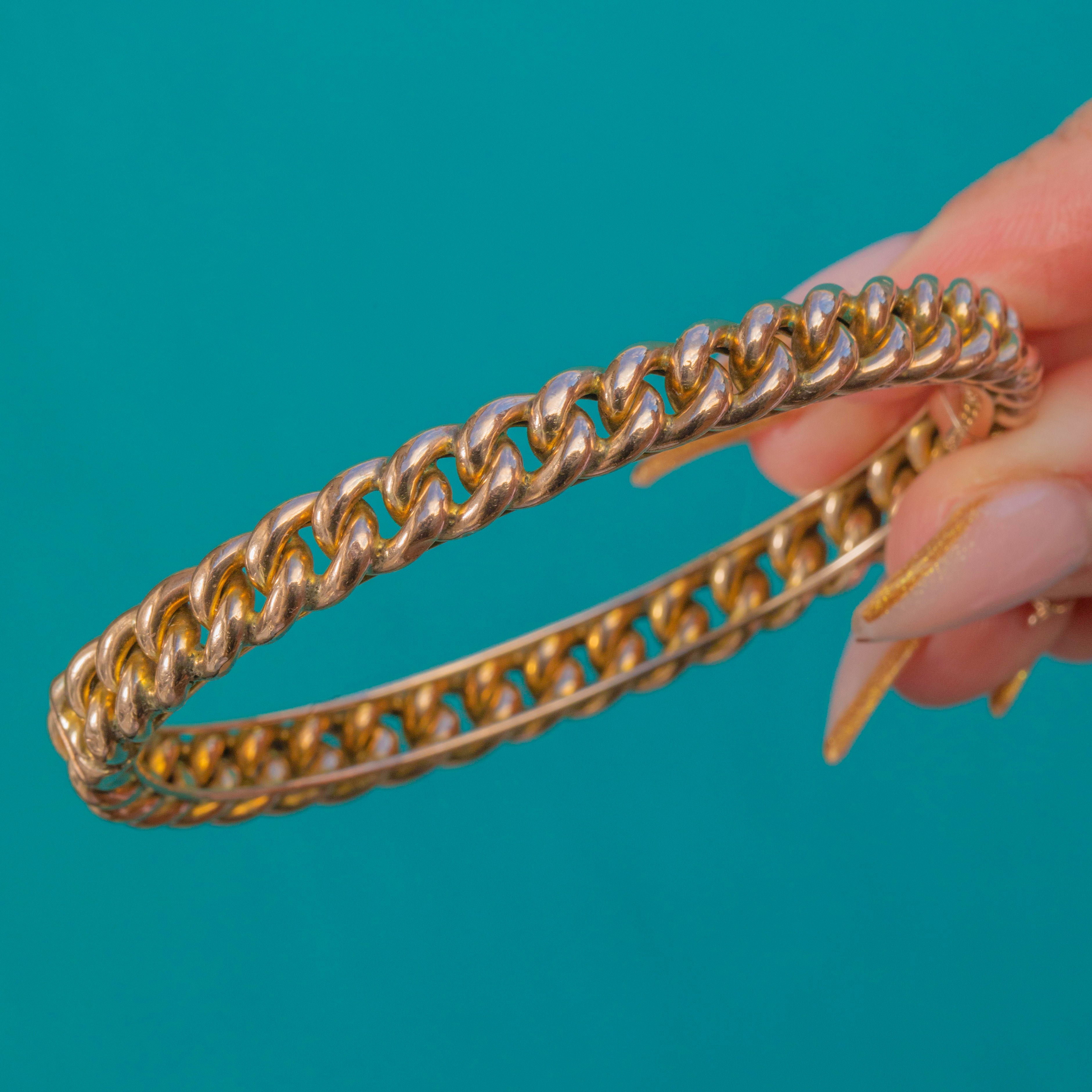 This antique 9ct Gold curb bangle is a gorgeous Victorian classic, dating to c.1900. The rounded curb links form a smooth, continuous row of Gold around the wrist, giving it a sleek yet substantial feel.
