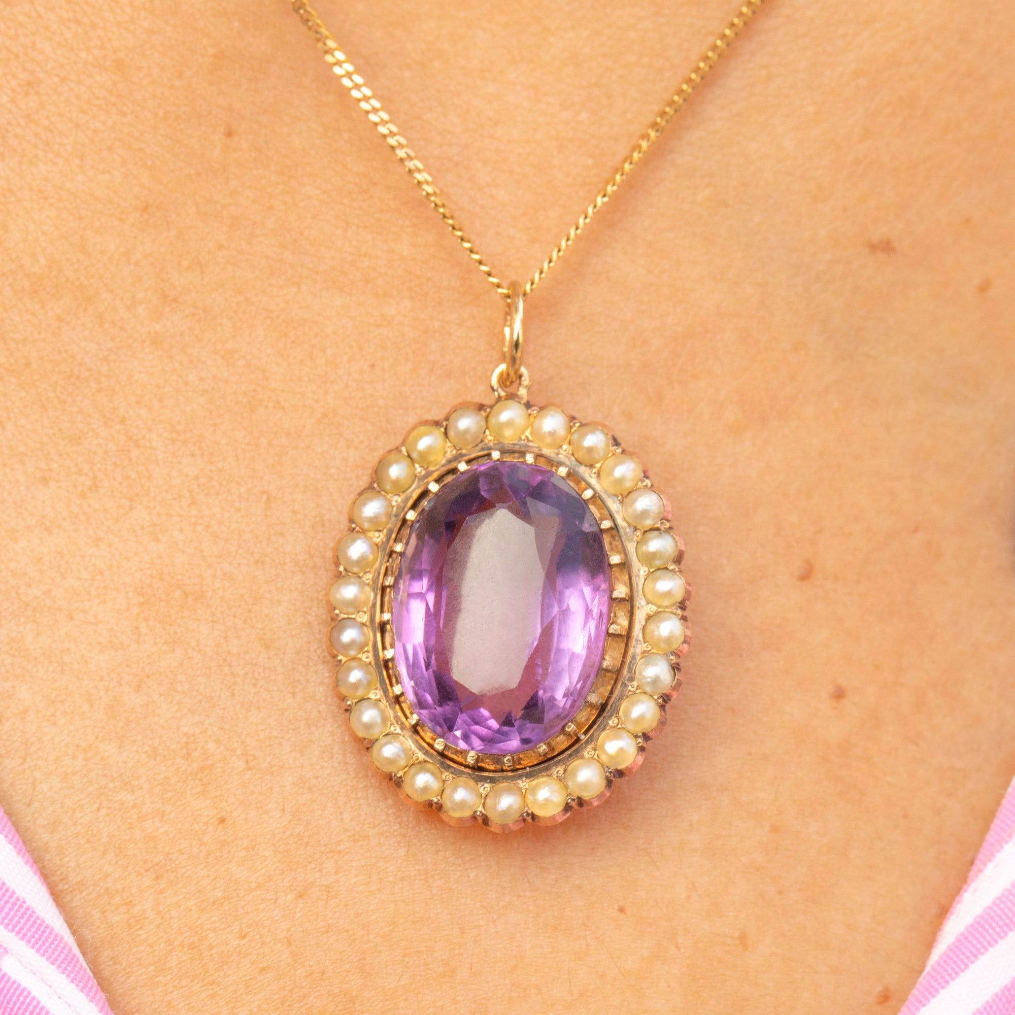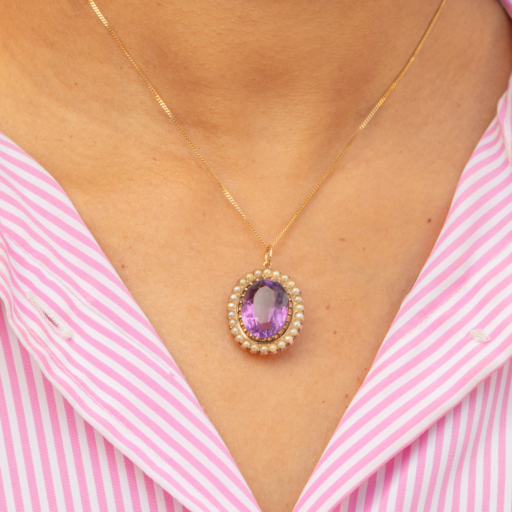 Victorian 9ct Gold Amethyst Pearl Oval Pendant, 9.00ct.