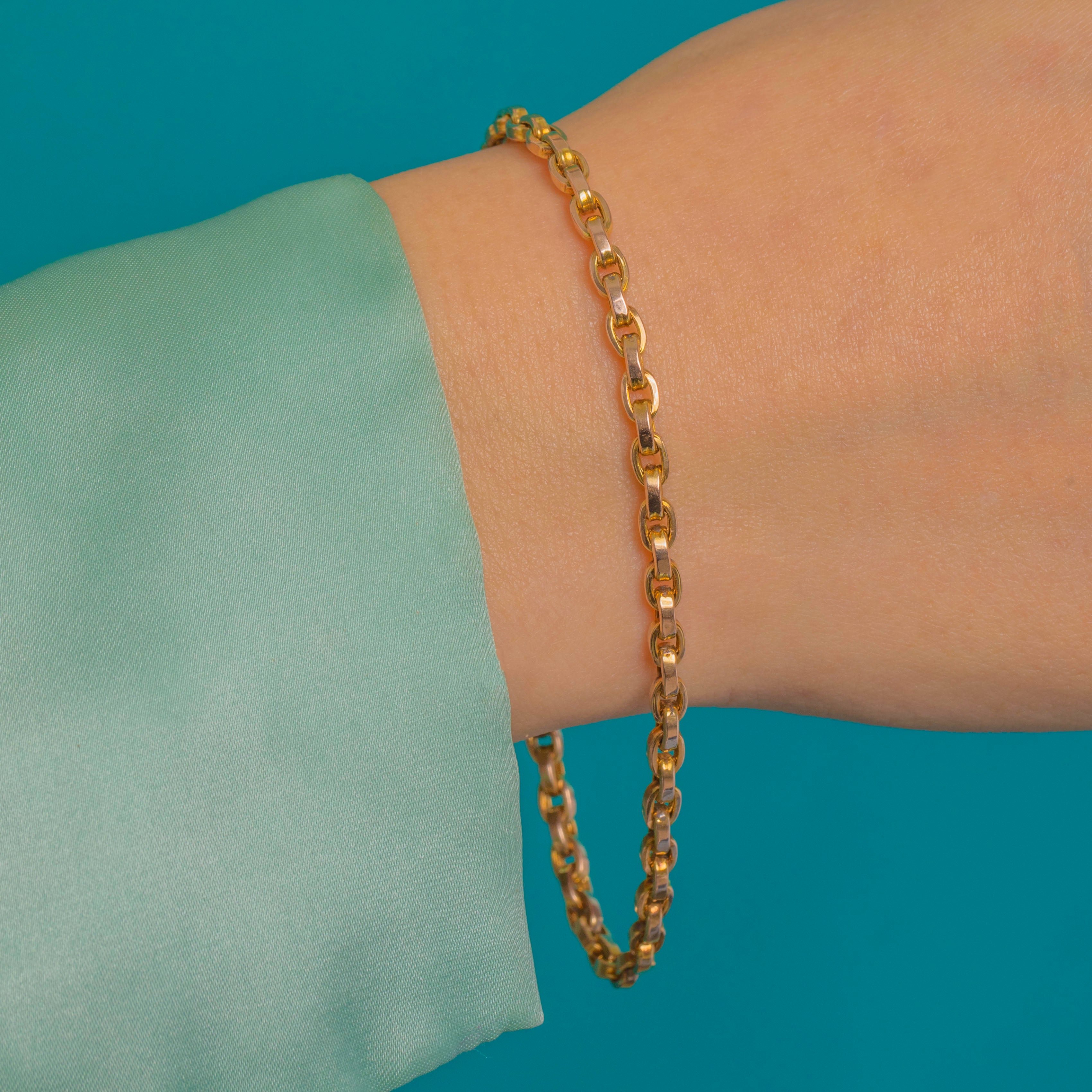 A classic Victorian 9ct Gold belcher bracelet, gleaming with a bright high-polish finish. The uniform oval belcher links have crisp, gently beveled faces that catch the light beautifully, creating a refined, minimalist silhouette.