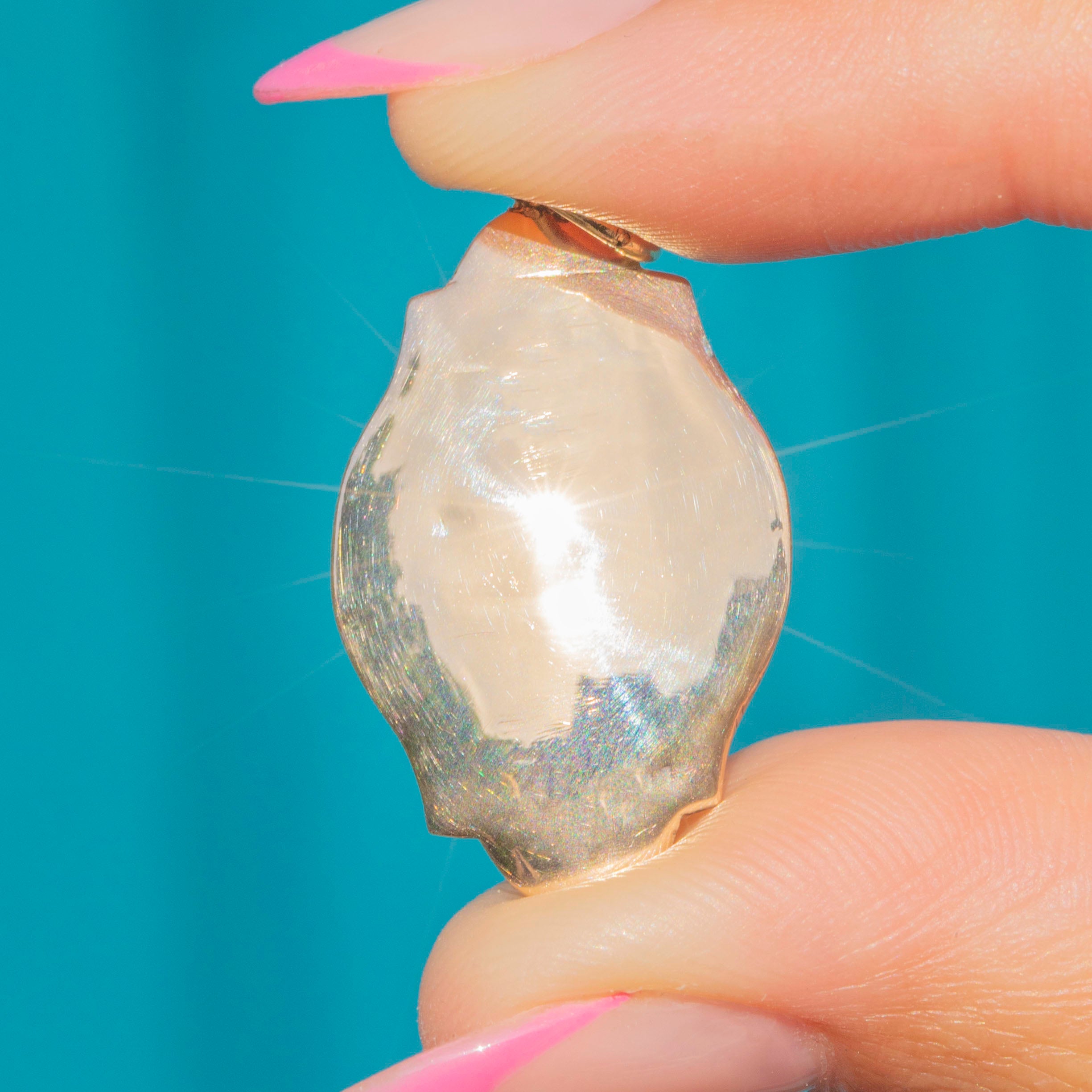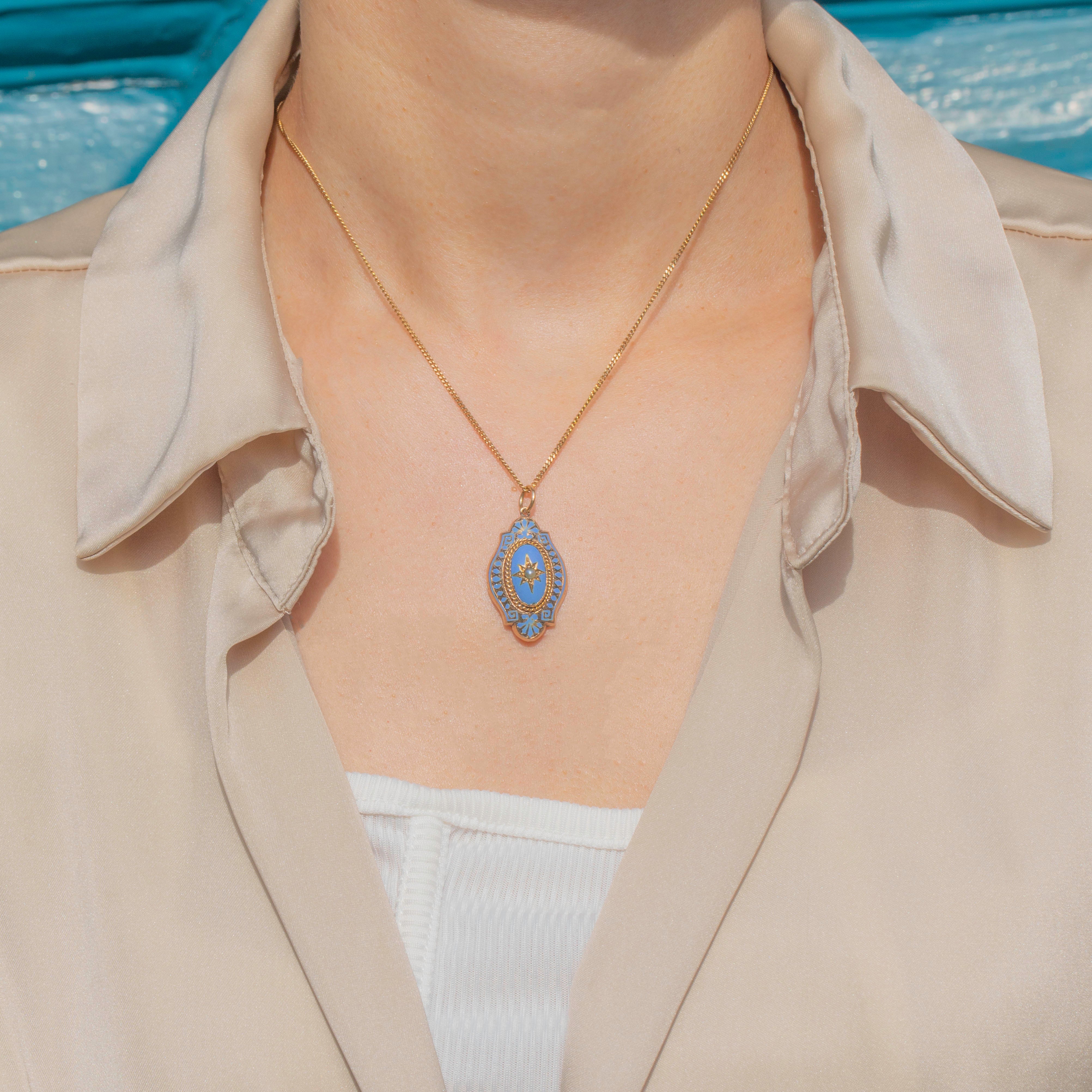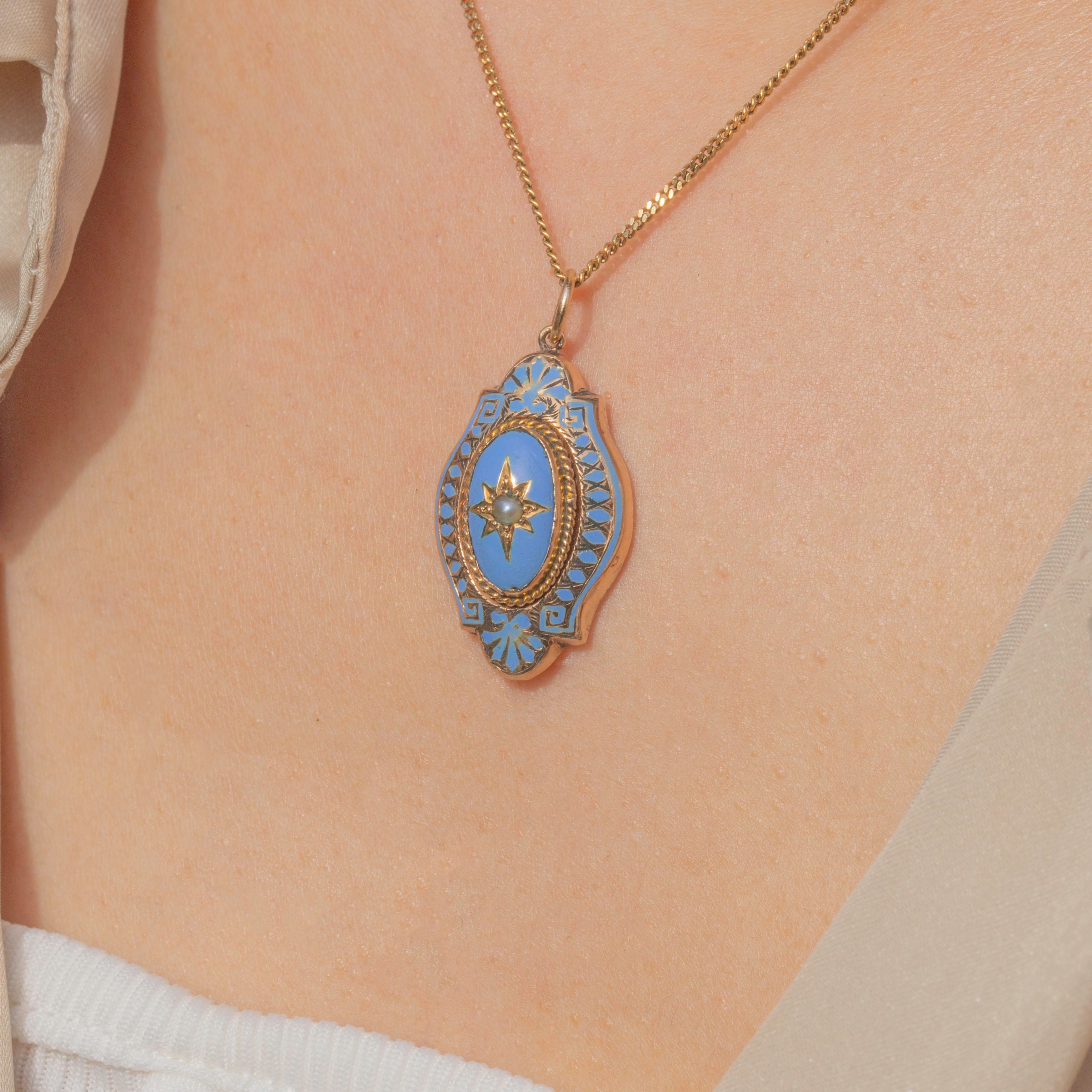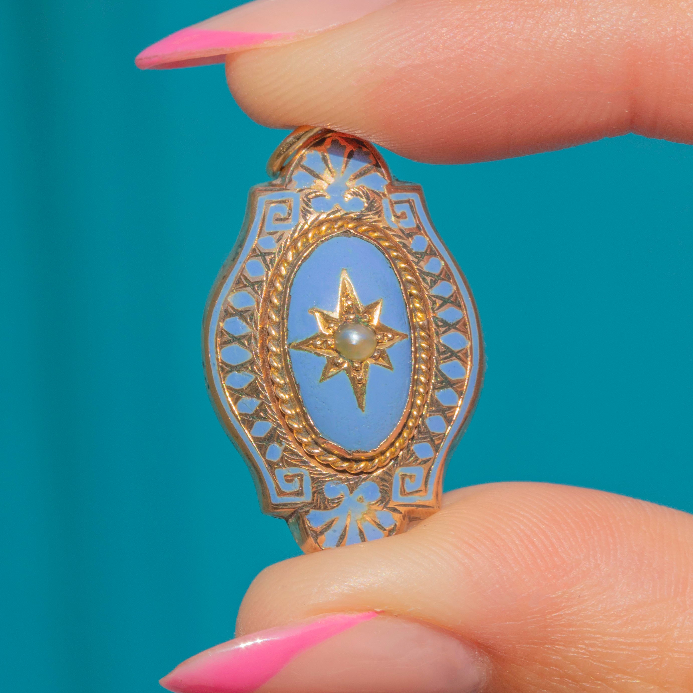 Displayed within a bold star setting, the lustrous Pearl shimmers, haloed by a twisted rope border and offset by powder blue Enamel. The Enamel has been inlaid into striking geometric Gold work, with intricate engravings that catch the light beautifully. If you have a penchant for unique treasures, don't hesitate to make this gorgeous Victorian Enamel pendant your newest acquisition!