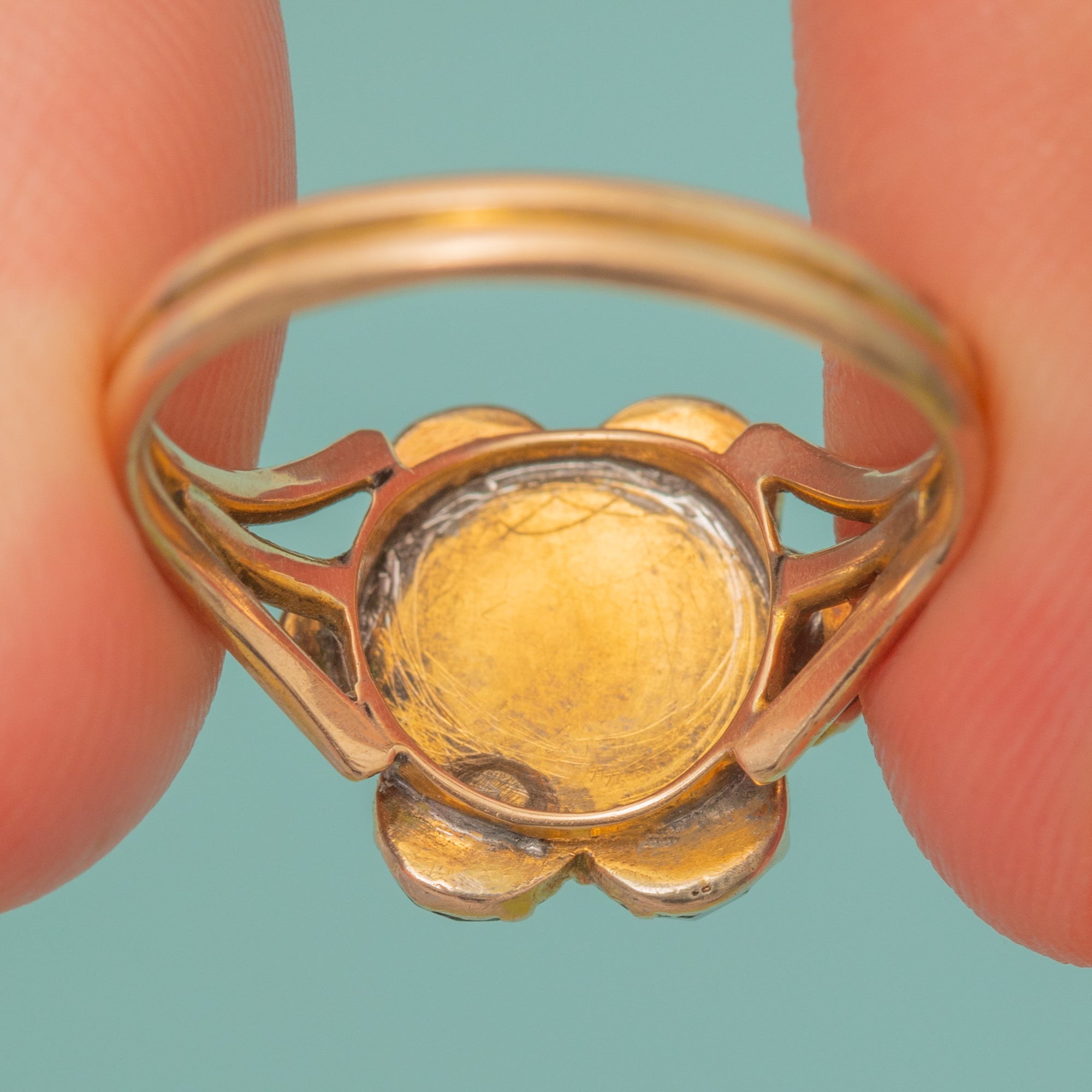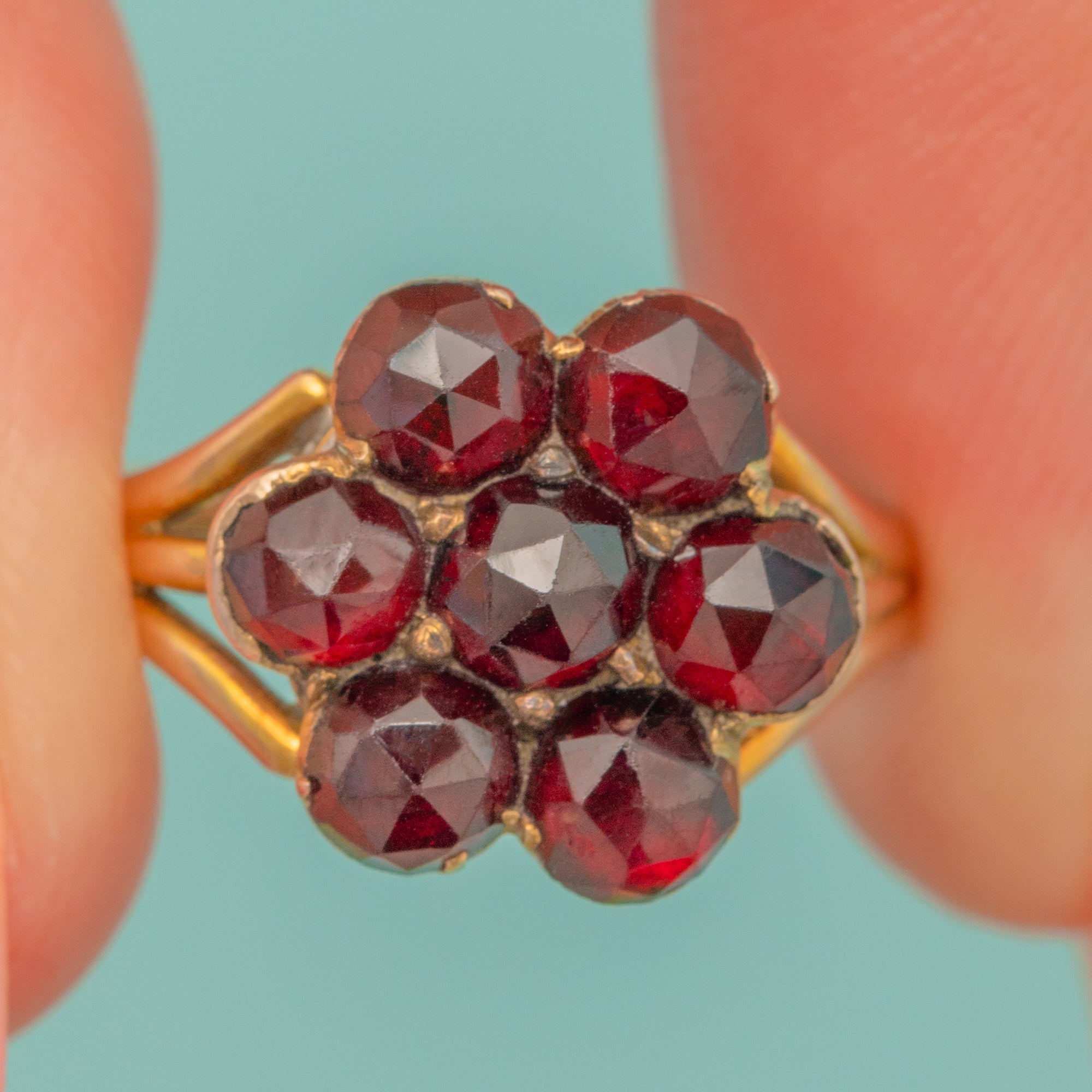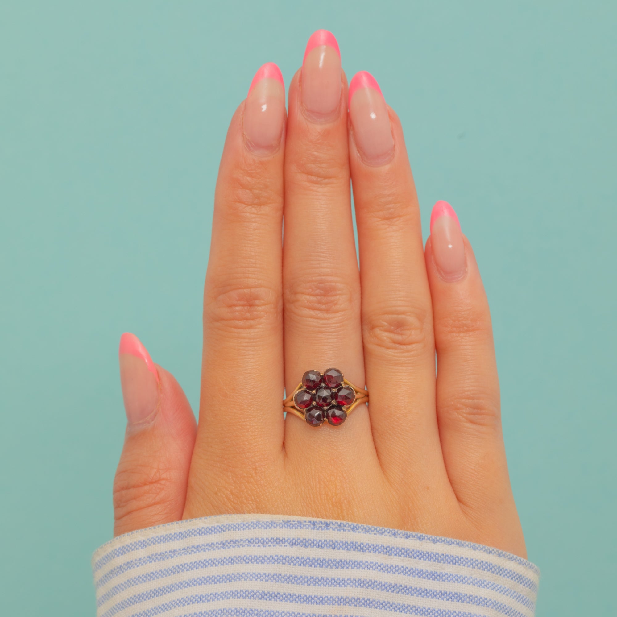 VERY GOOD: This Victorian 9ct Gold Bohemian Garnet flower cluster ring is in very good condition. The ring has plump and juicy gemstones neatly set, there is some mild wear to the stones, including a few abrasions to two of the Garnets - however this is nothing too untoward. The ring band is lovely and the piece wears like an absolute dream!