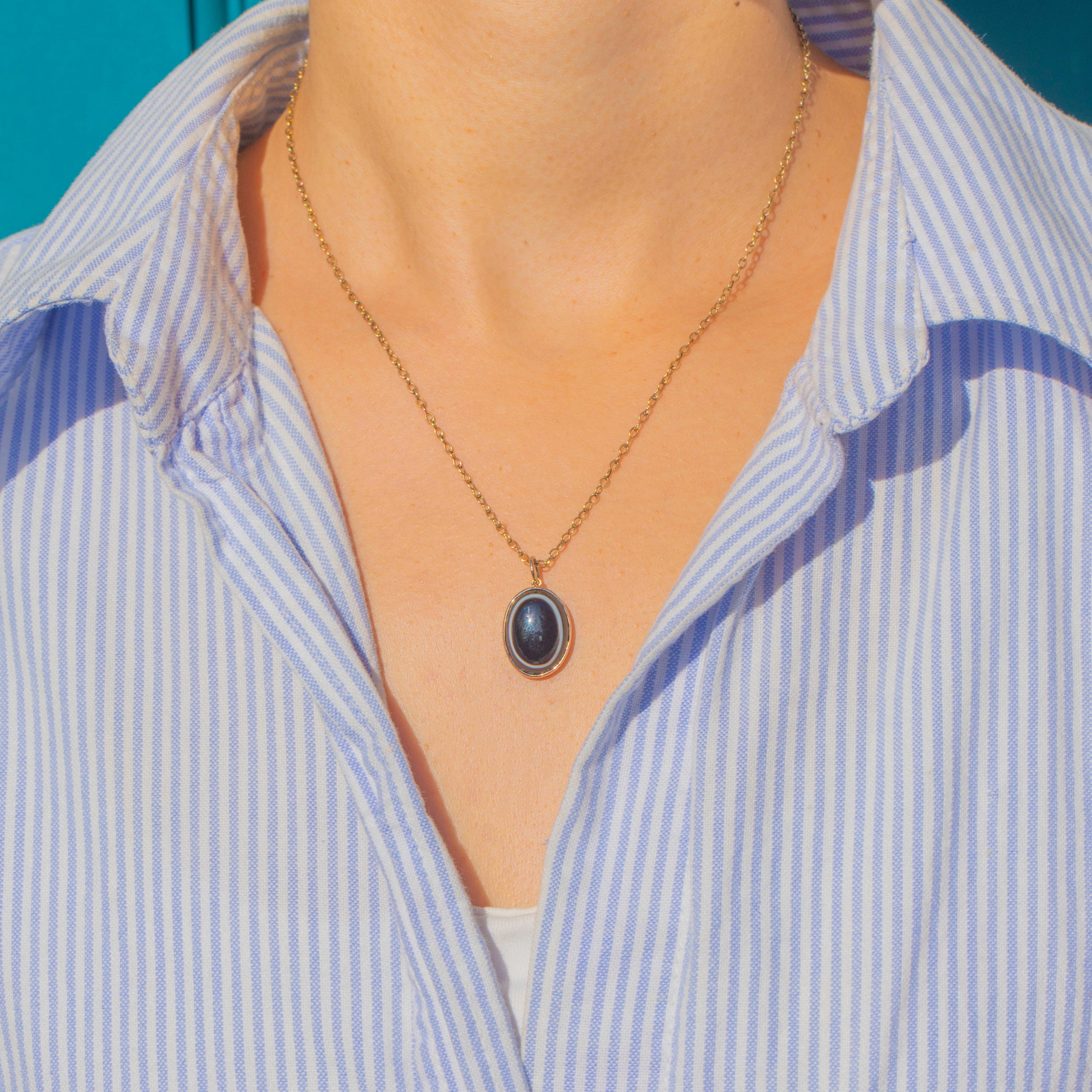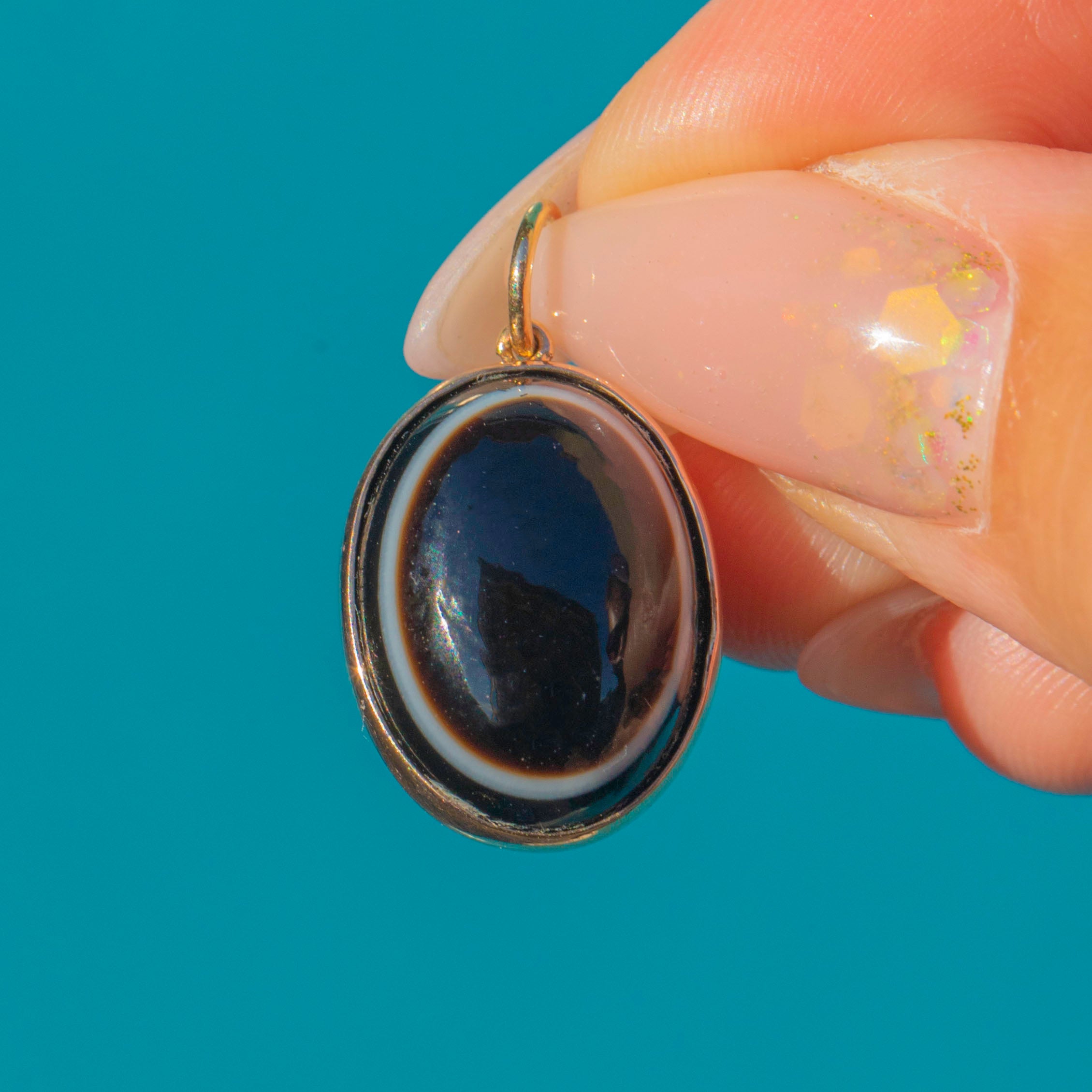 This antique pendant is crafted in 9ct Gold and set with a striking oval cabochon of Banded Agate. The natural layers of black, brown and white create a bold contrast, highlighting the beautiful concentric rings of the gemstone.