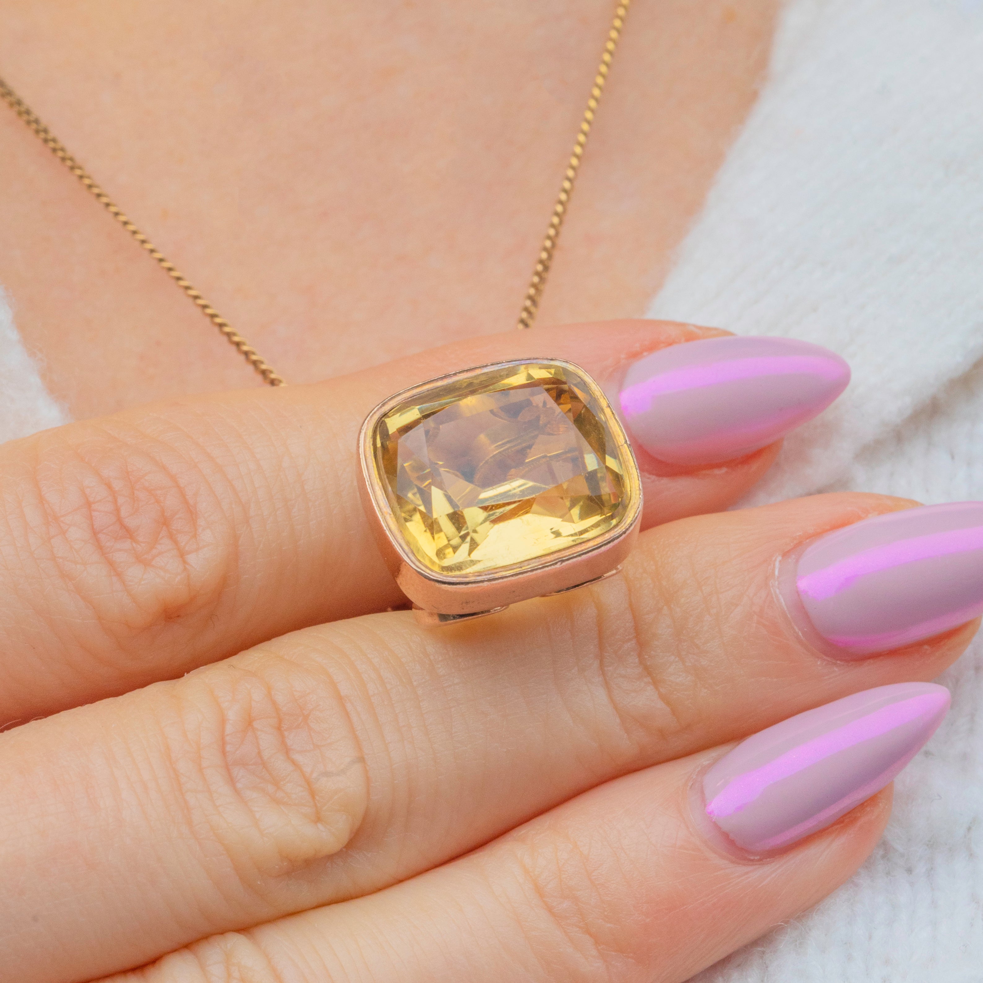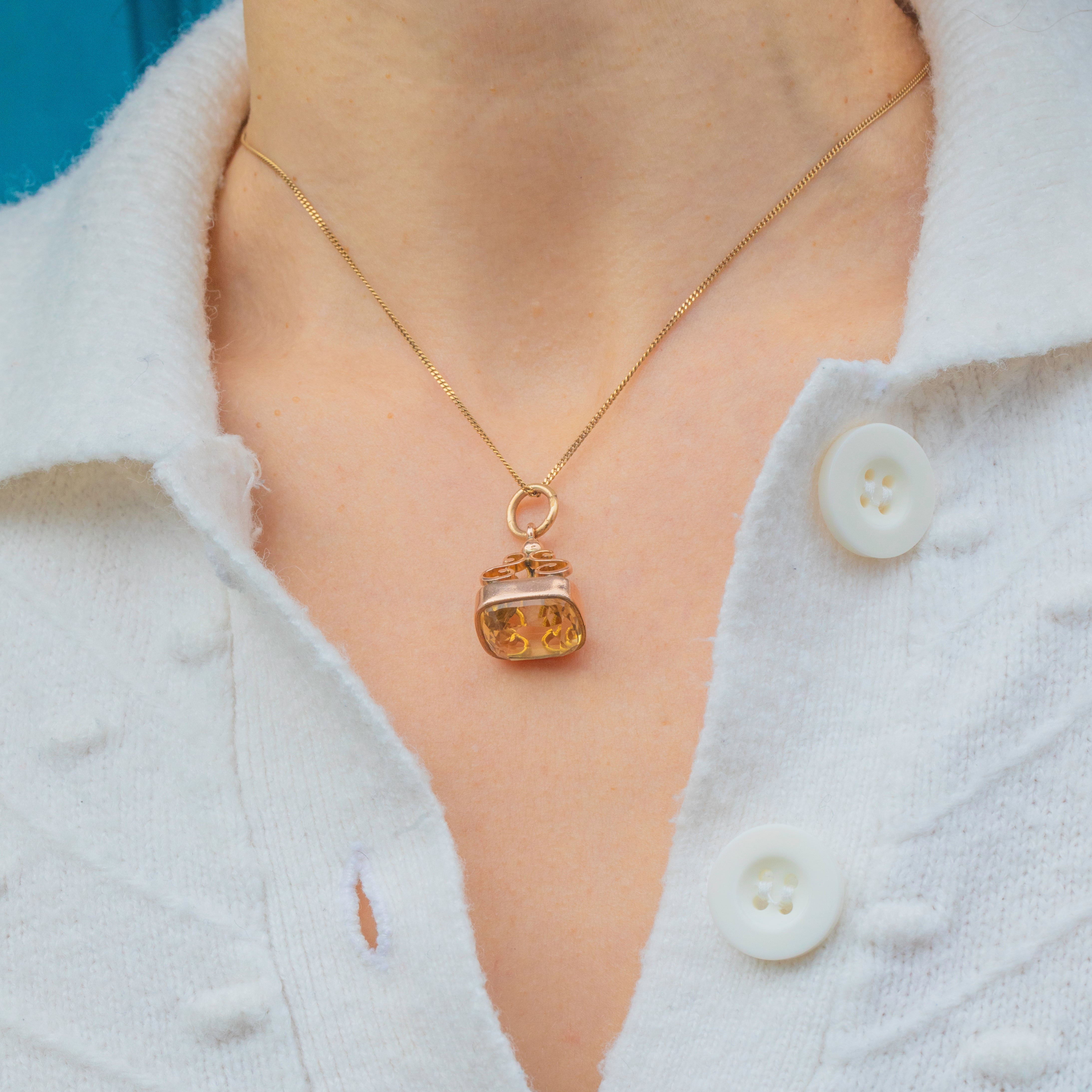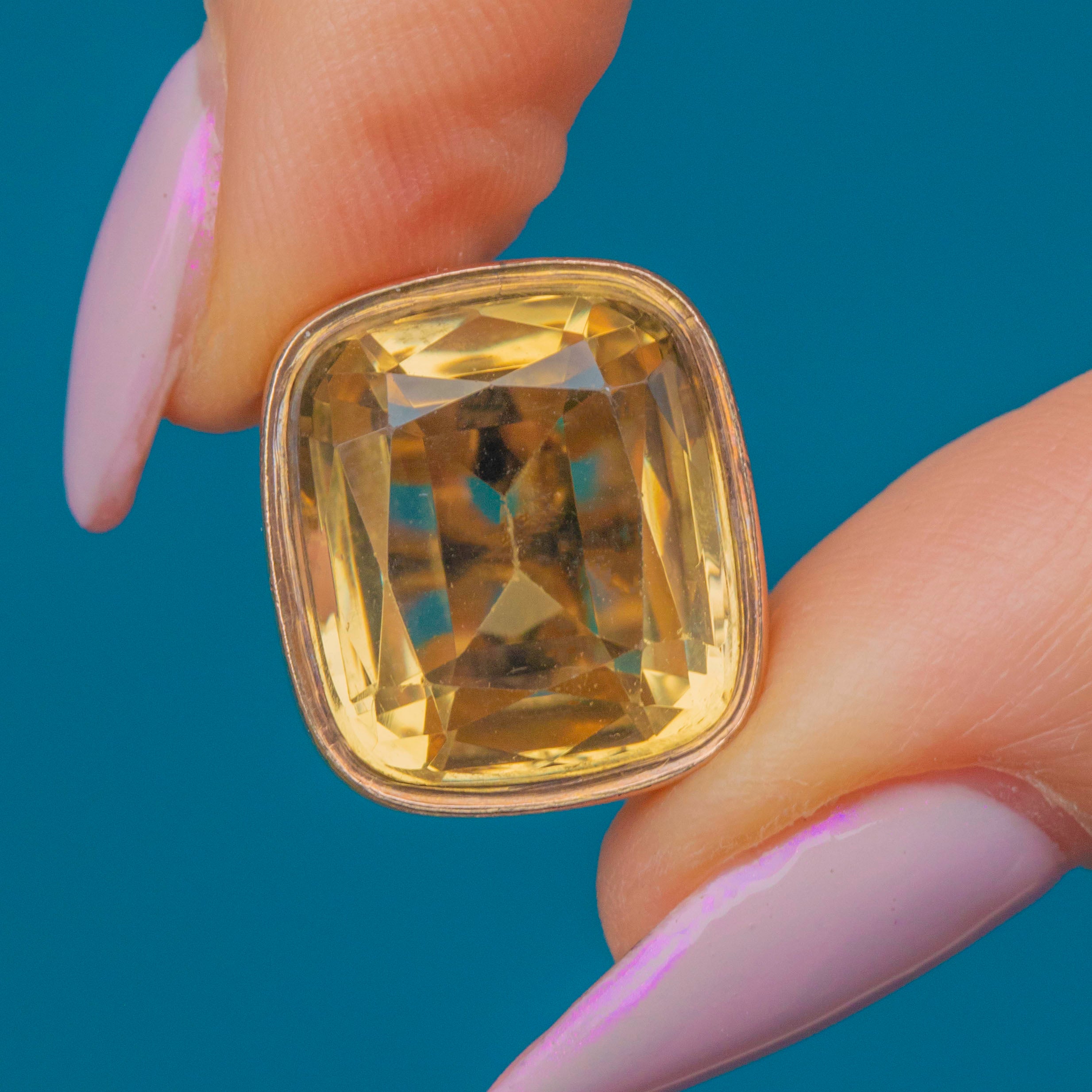 A striking Antique Victorian Citrine fob pendant crafted in solid 9ct Gold. The large cut Citrine glows with a rich golden hue, beautifully complemented by the warm tone of the Gold mount. Substantial and full of presence, it’s the perfect statement piece to wear on a chain or watch guard.