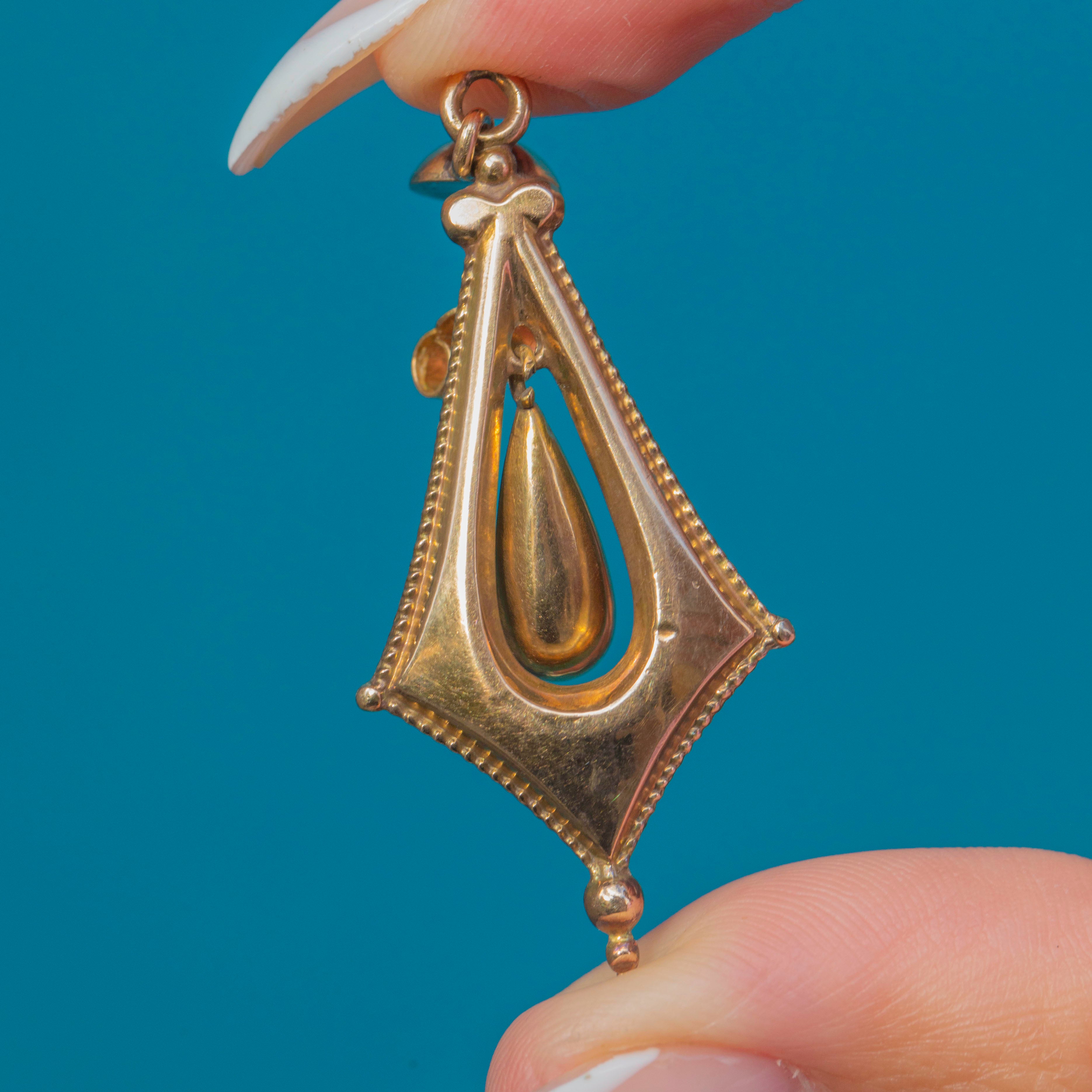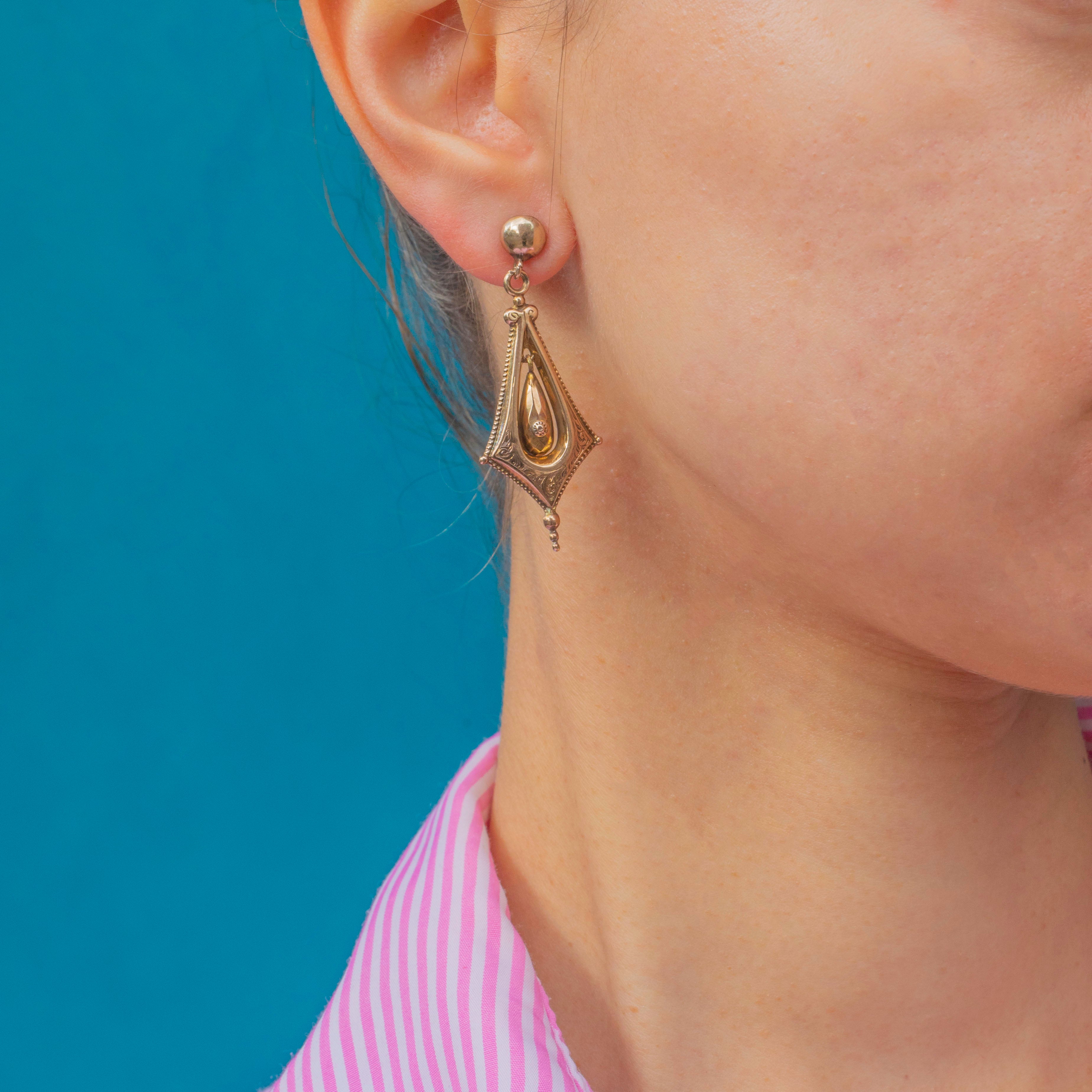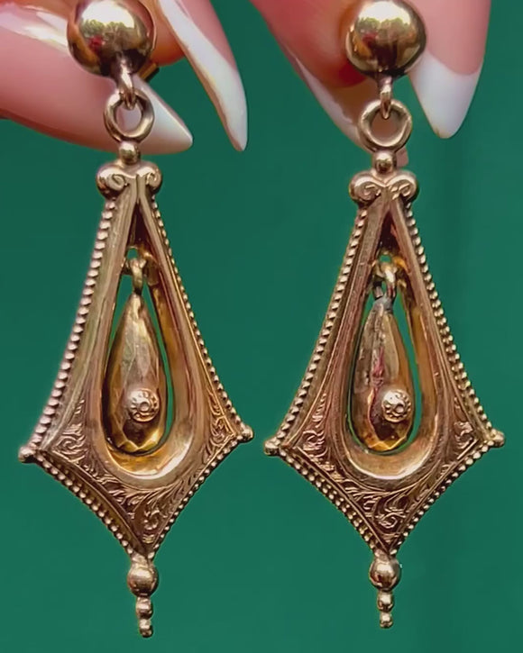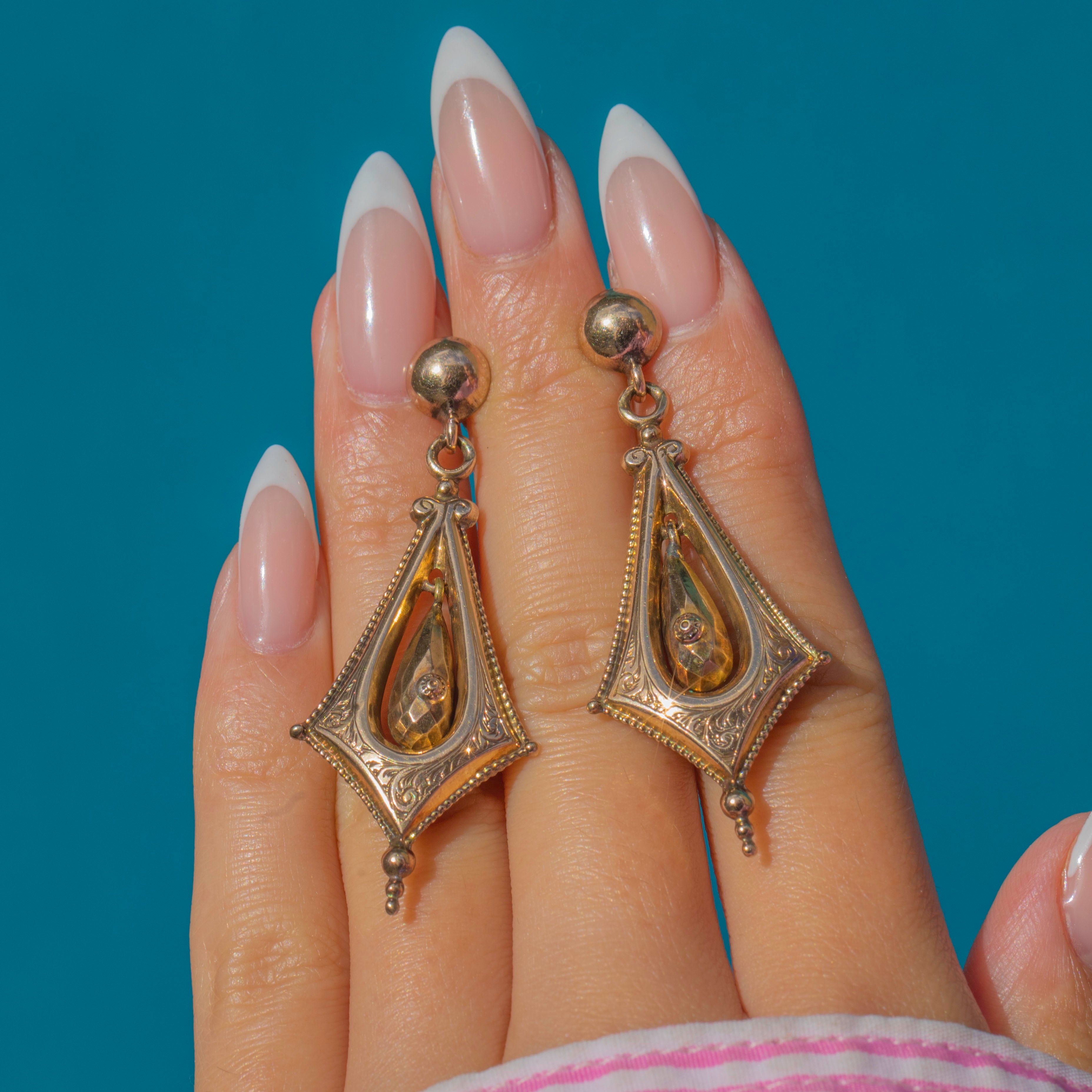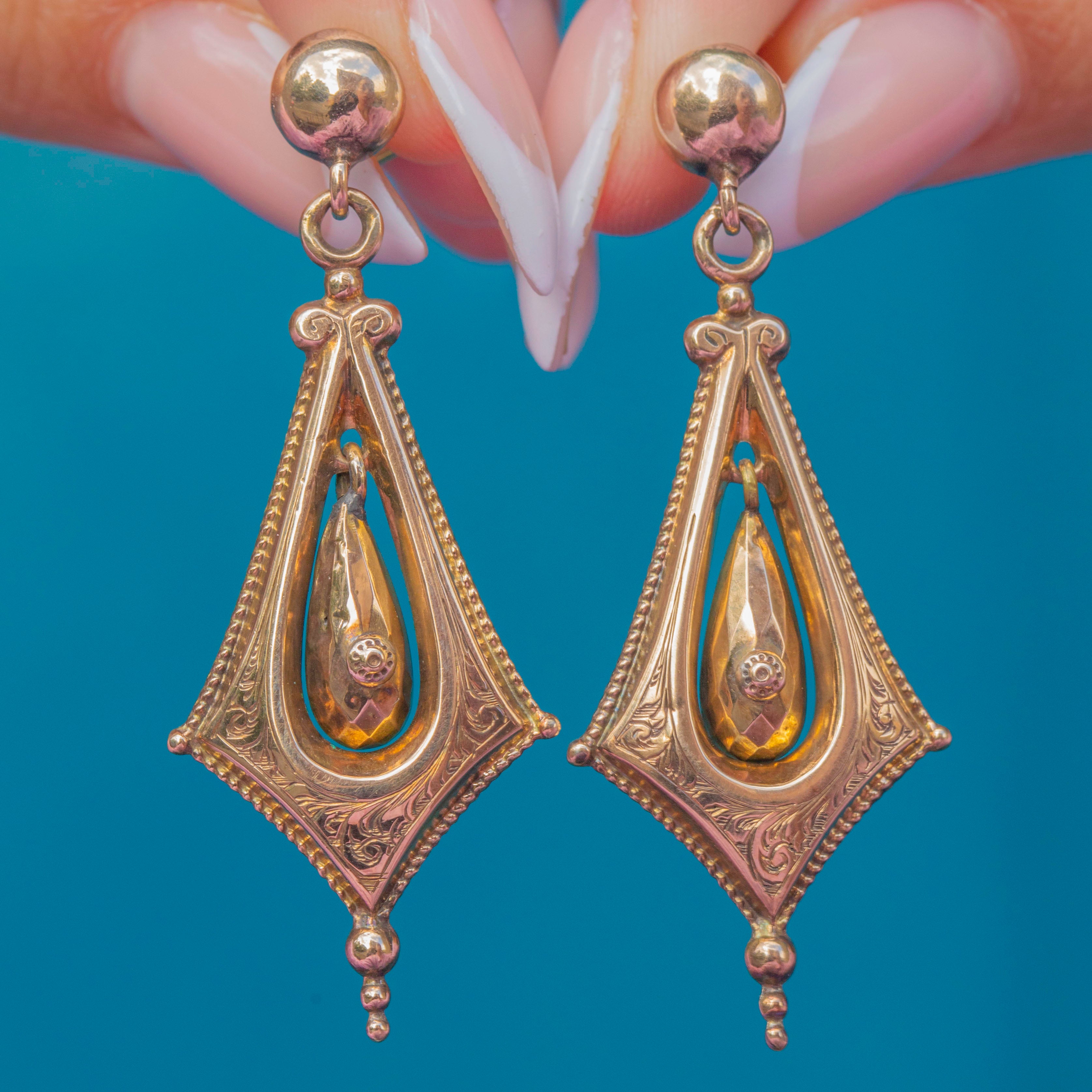 These ornate Victorian drop earrings are a striking example of 19th-century design. Crafted in 9ct Gold, they feature an elongated lozenge-shaped frame with delicate engraved detailing, showcasing a suspended teardrop-shaped Gold drop at the centre. The faceted and engraved design catches the light beautifully, giving these earrings an elegant sense of movement and texture.