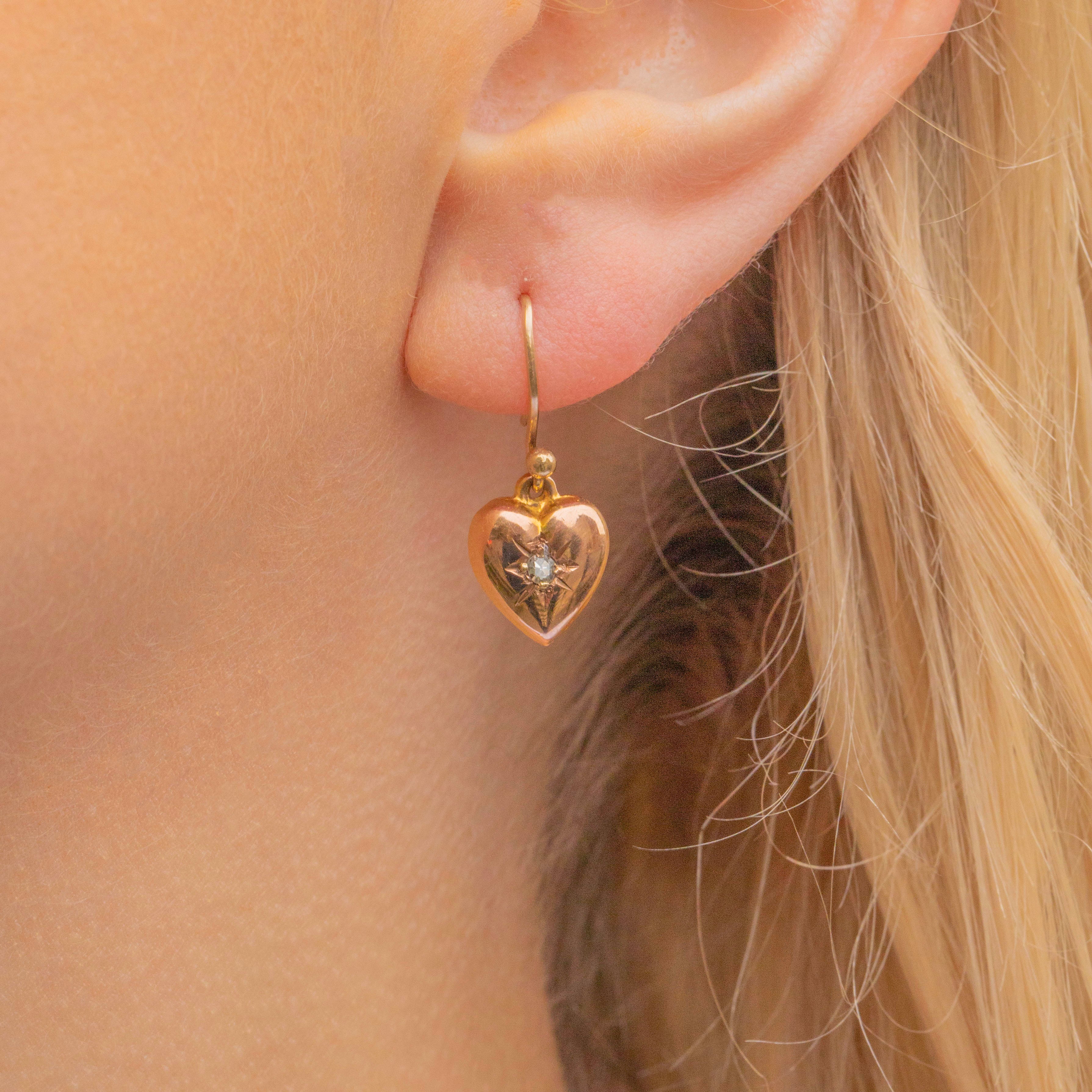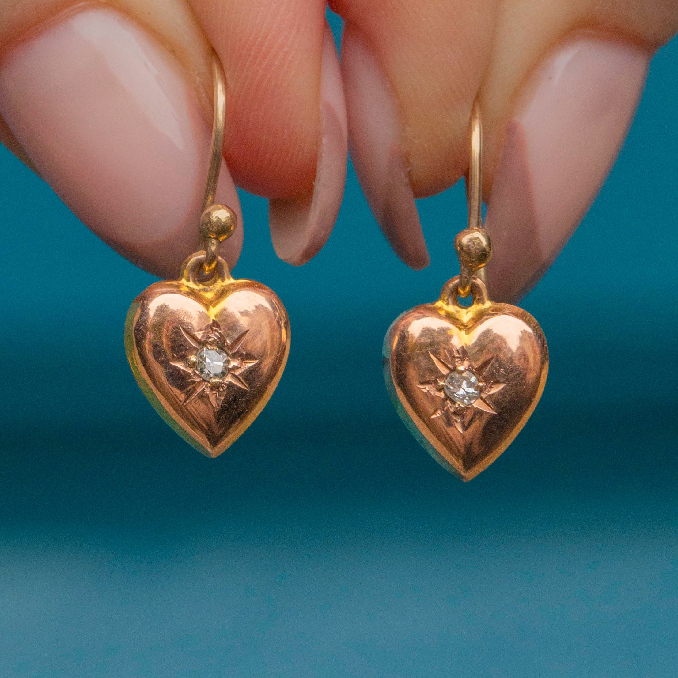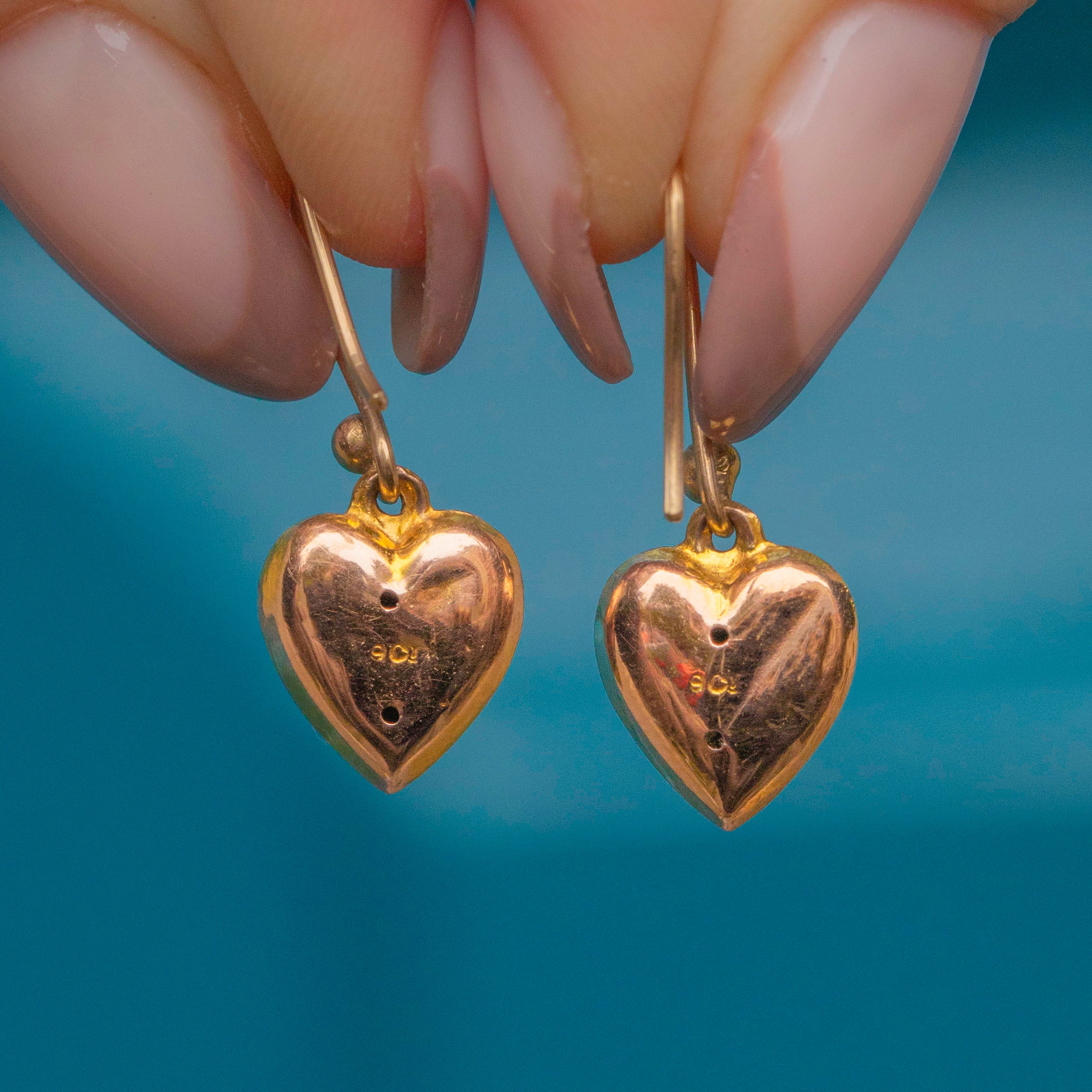 VERY GOOD-EXCELLENT. These Victorian 9ct Gold Diamond set puffy heart earrings are in superb condition. They are crafted beautifully and securely, and their central Diamonds are radiant. There are some minor dings on the back of the earrings commensurate with age, however, this is not noticeable during wear. They are a must-have!