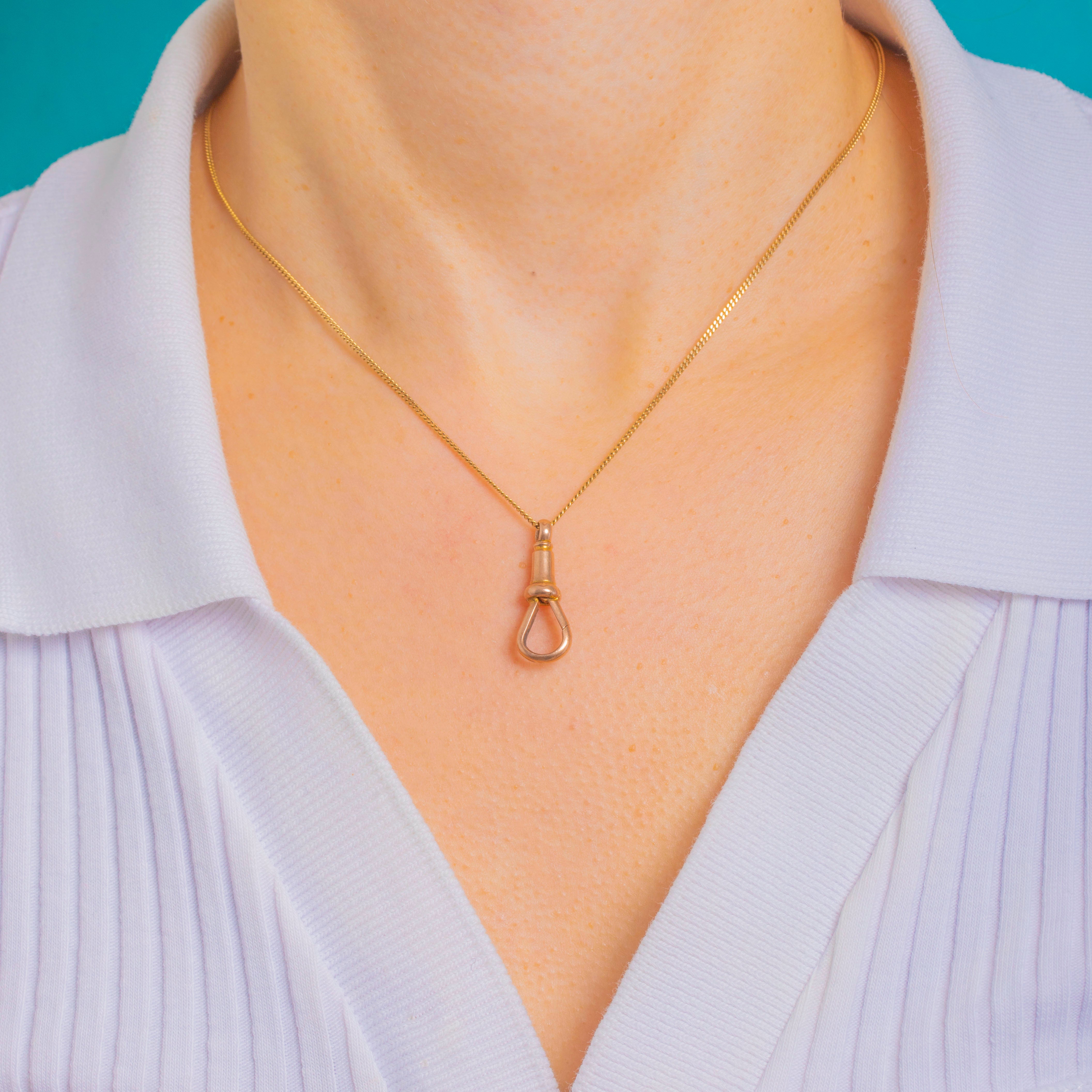 A quintessential Victorian 9ct Gold dog-clip clasp with that timeless blend of elegance and utility. Beautifully engineered, it features a lathe-turned, tapered barrel with a collar, a classic teardrop clip with a spring gate for effortless styling. The warm glow of 9ct Gold and smooth, polished surfaces make it a chic standalone pendant or the perfect charm holder.