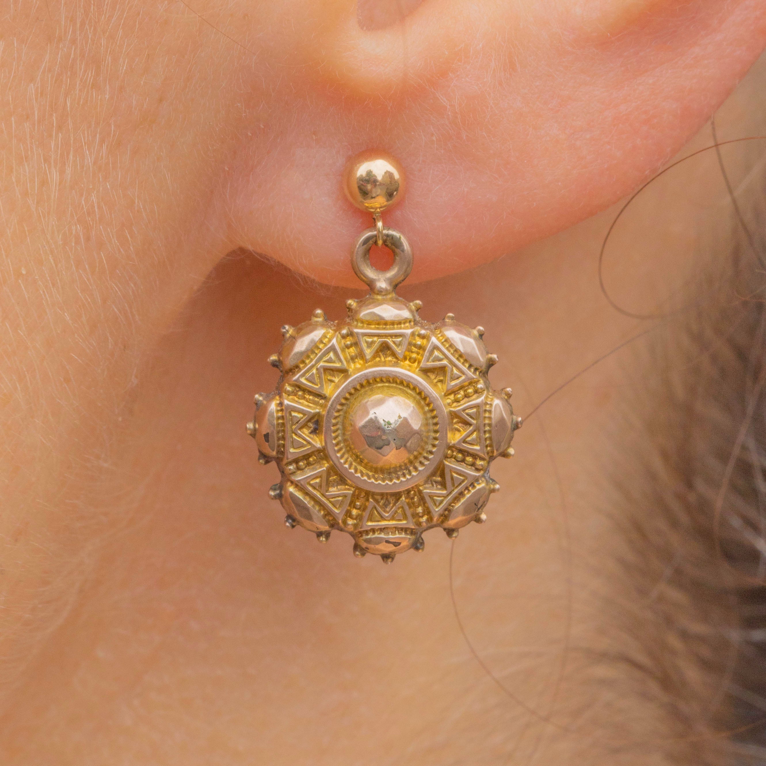 These antique Etruscan earrings feature round drops composed of brightly textured 9ct Gold attached to beaming 9ct Gold studs, they are a glossy treat to grace your lobes with!