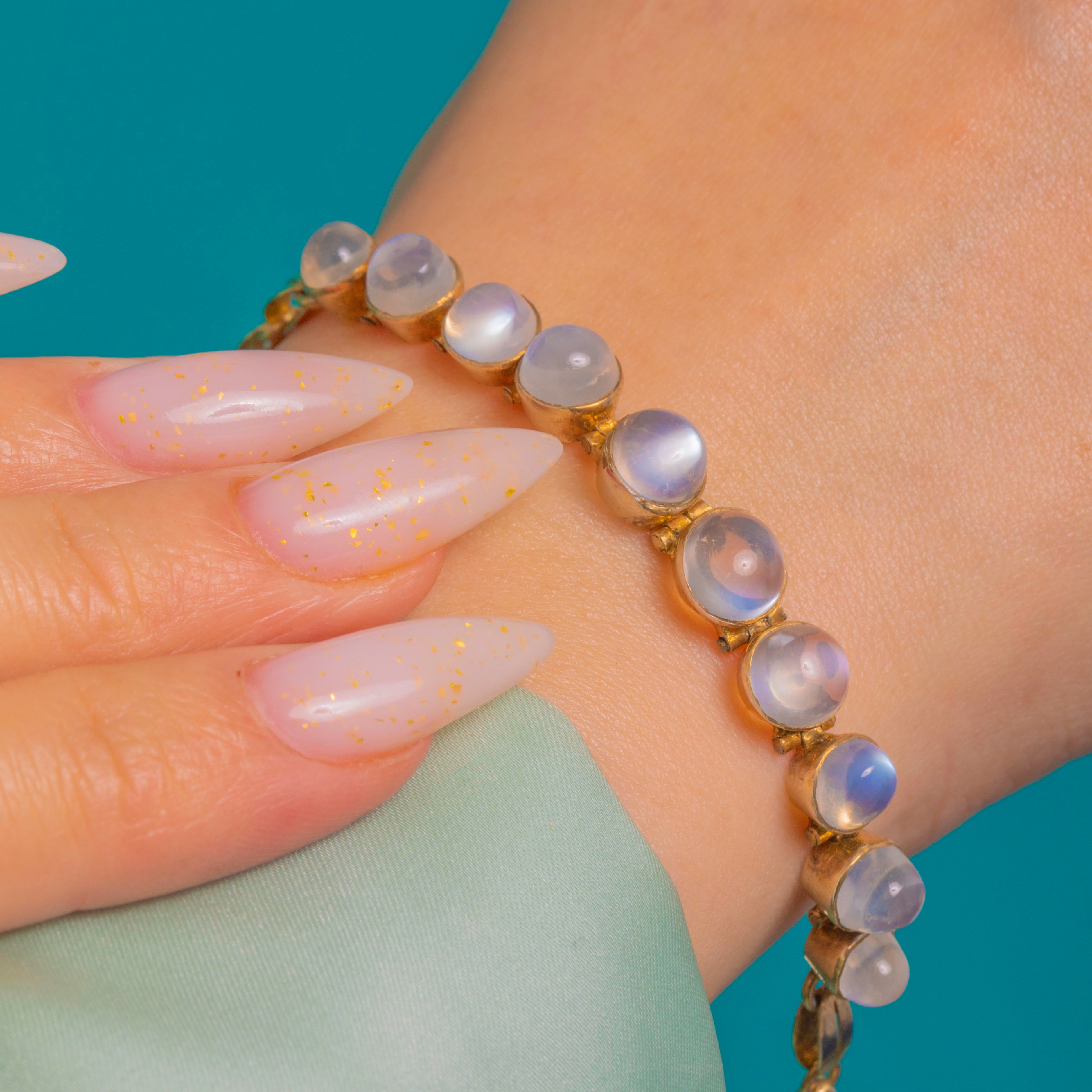 A luminous line of Moonstone cabochons graces this Victorian bracelet, each stone displaying a gentle blue-white glow. Individually collet-set and articulated, the cabochons form a refined rivière that sits slim and fluid on the wrist.