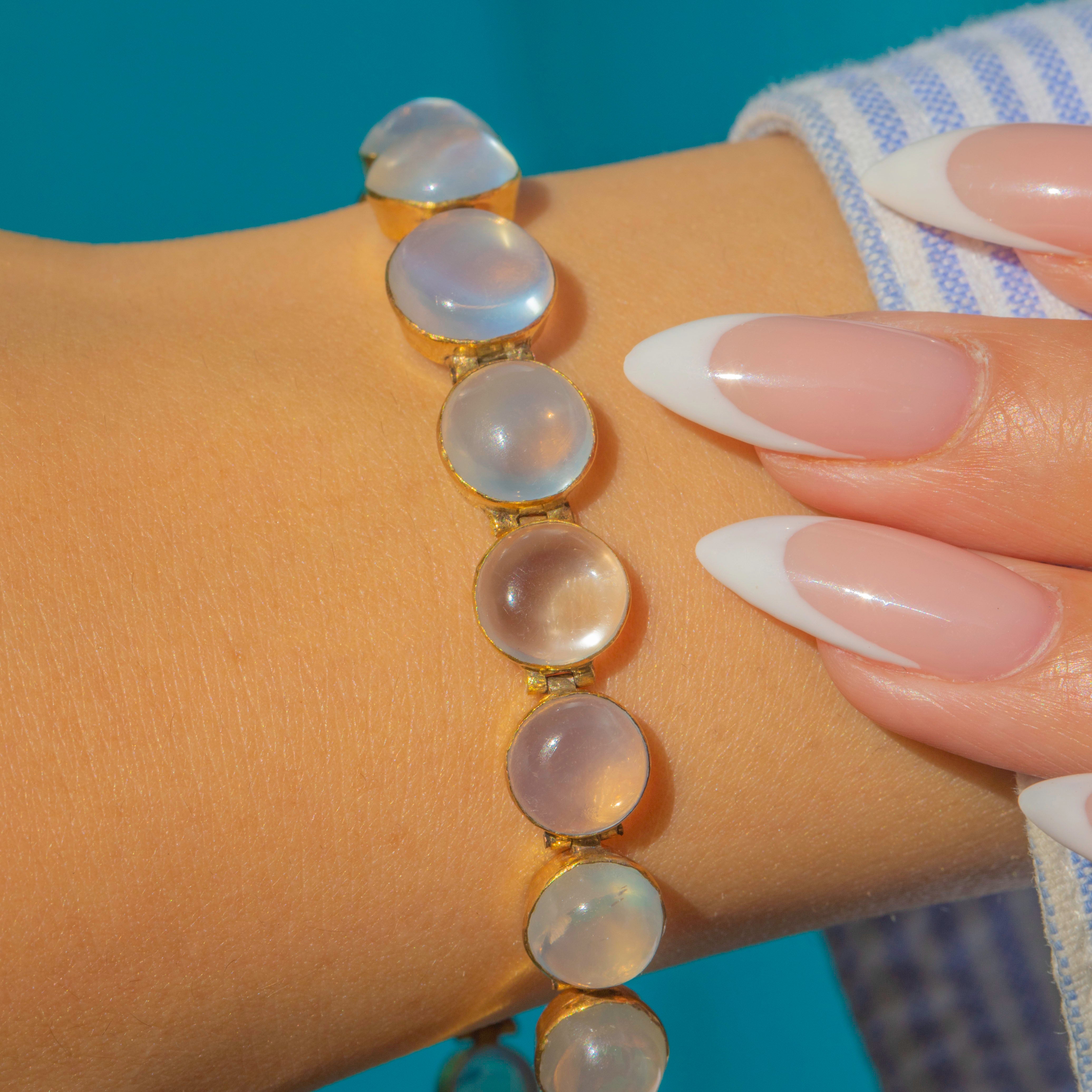 A luminous Victorian Moonstone bracelet in warm 9ct Gold. Round cabochon Moonstones are collet-set in a continuous line, each stone glowing with that ethereal blue sheen the era adored. Elegant on its own and effortless to stack—classic Victorian romance with everyday wearability.