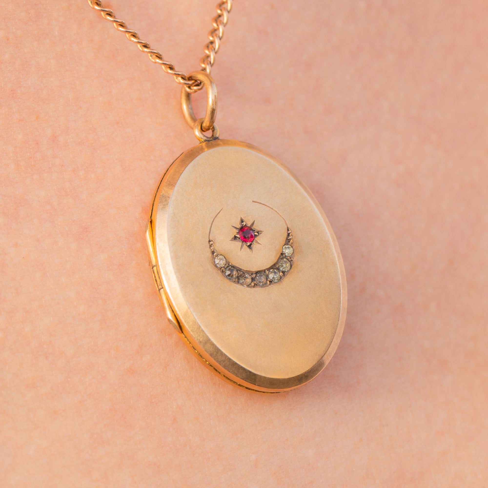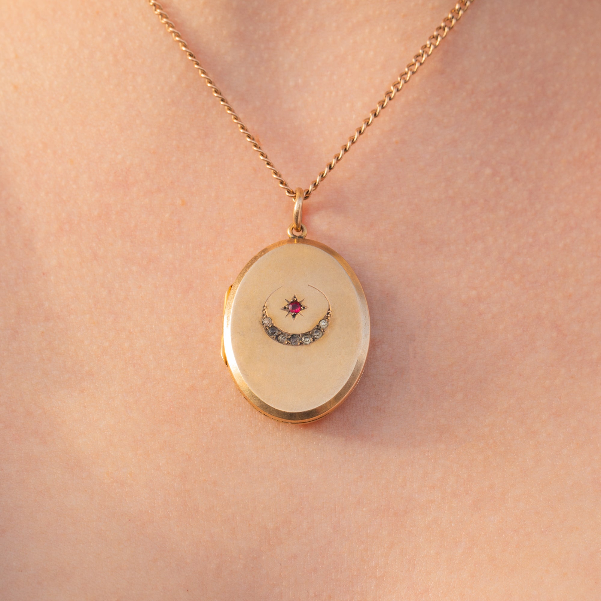 This Victorian 9ct Gold Paste crescent moon & star locket will make a striking addition to your antique jewellery collection! The front of the locket is inlaid with a Ruby Paste within a star setting, accented by a Diamond Paste encrusted crescent, each one exquisitely cut to catch the light.