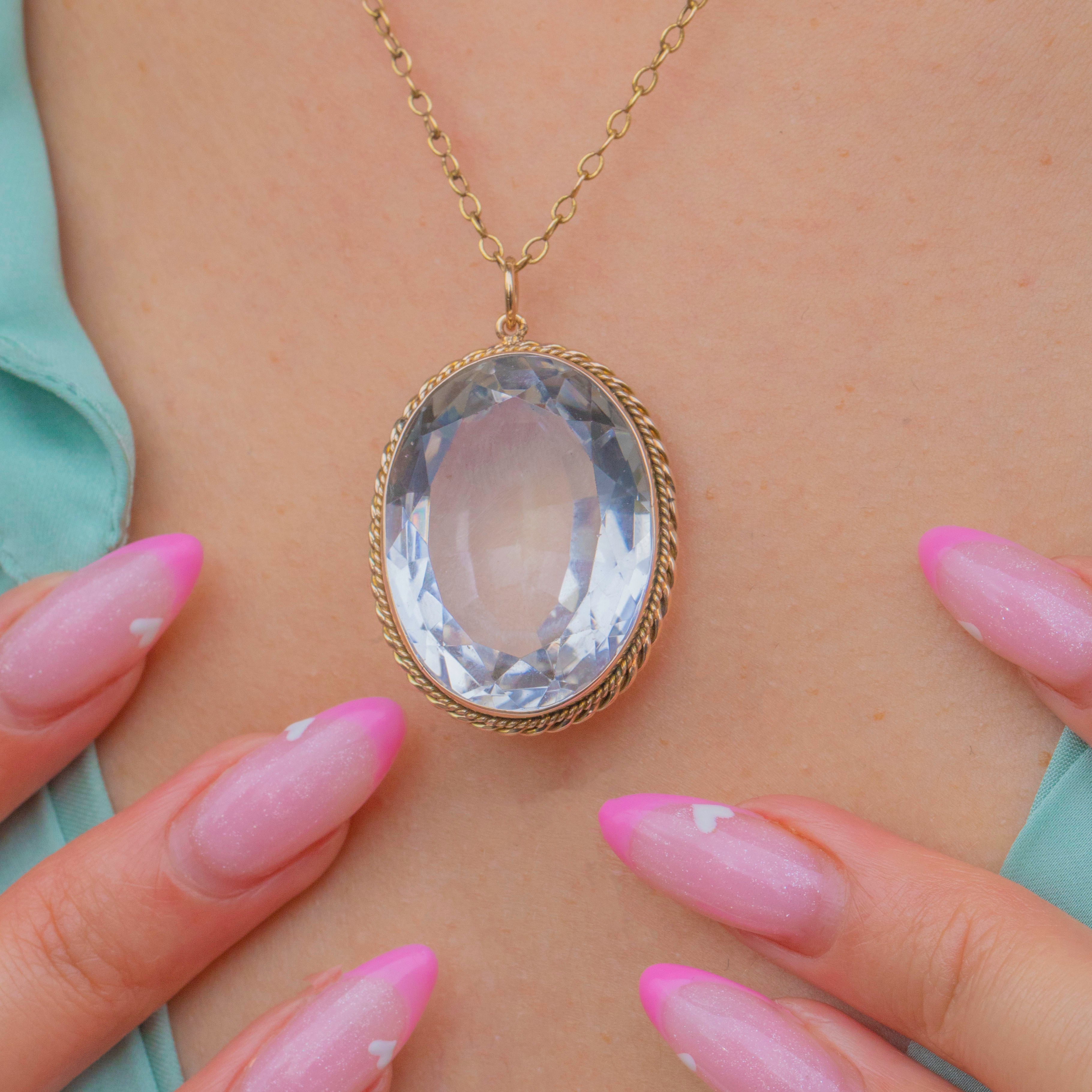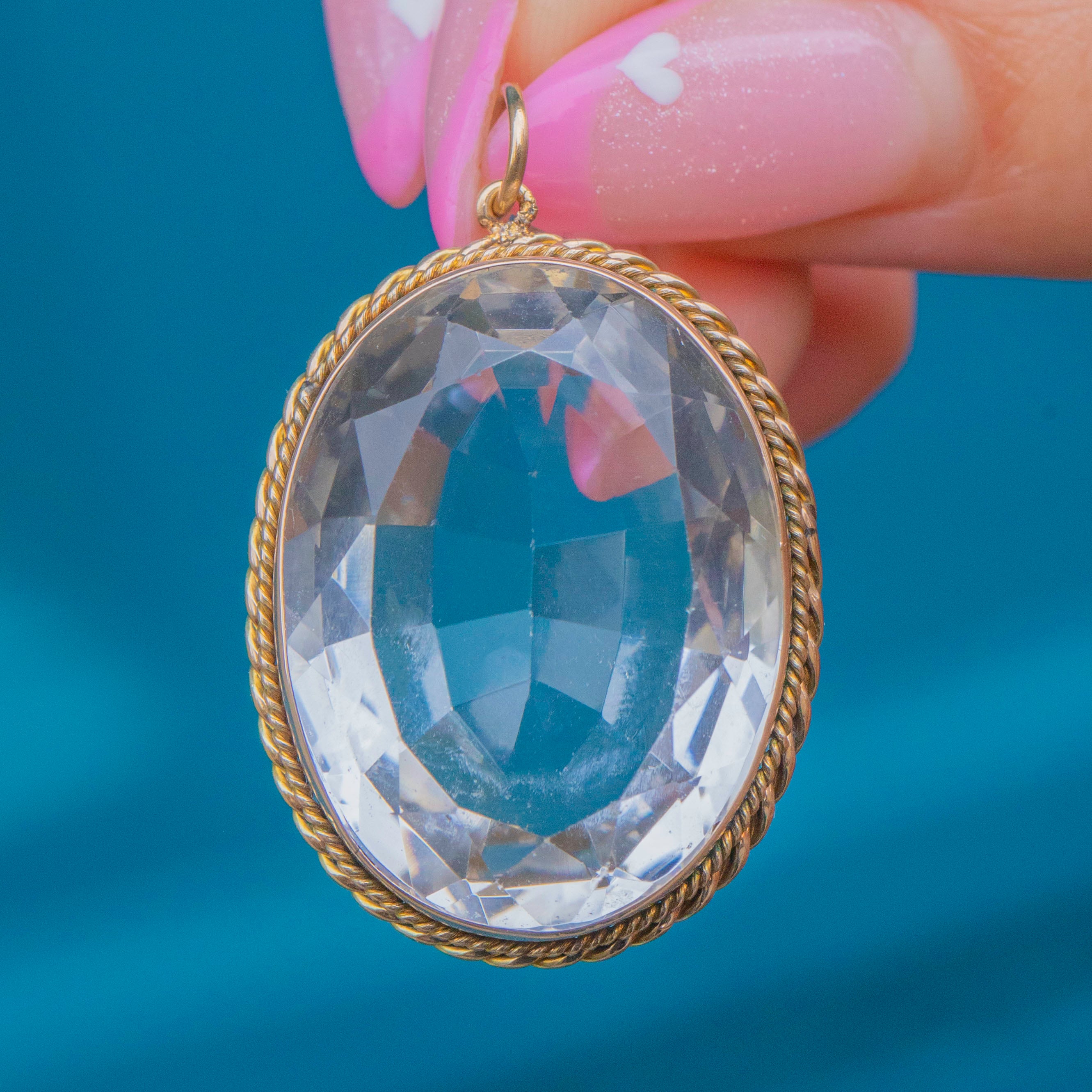 This impressive Victorian pendant features a beautifully clear 26.00ct Rock Crystal, expertly cut to catch and reflect the light with striking brilliance. The gemstone is securely set in a warm 9ct Gold mount, its clarity and precision faceting creating a captivating play of light from every angle.