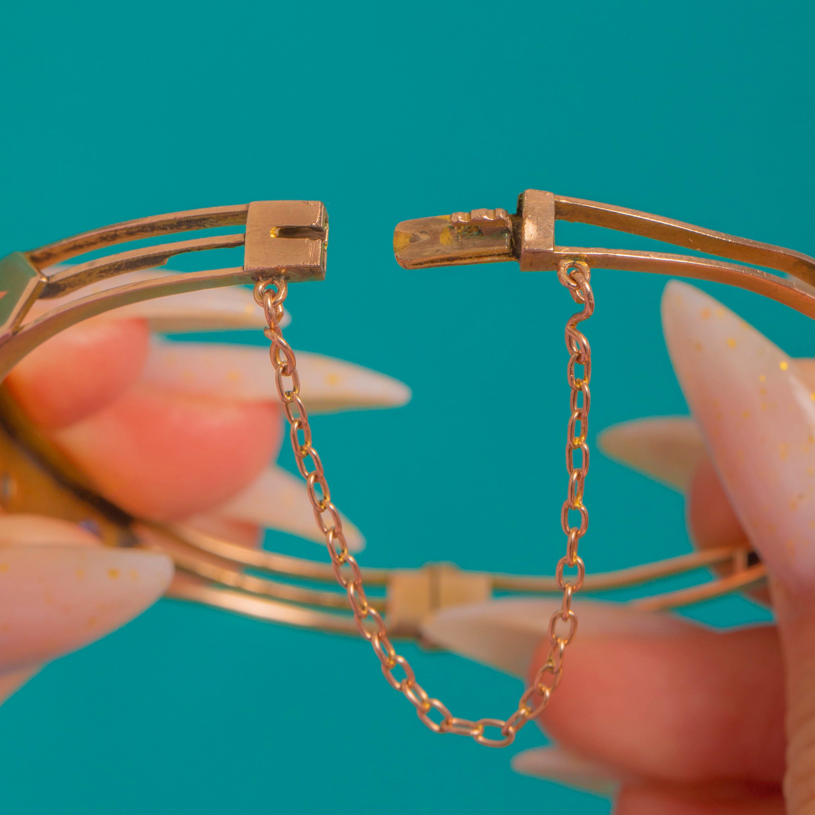 The oval form is elegantly engineered with split rails to the sides, balancing delicacy and presence on the wrist. Finished with a tongue/box clasp and safety chain for peace of mind, this timeless treasure layers beautifully or shines solo—an effortless nod to Victorian romance and restraint.