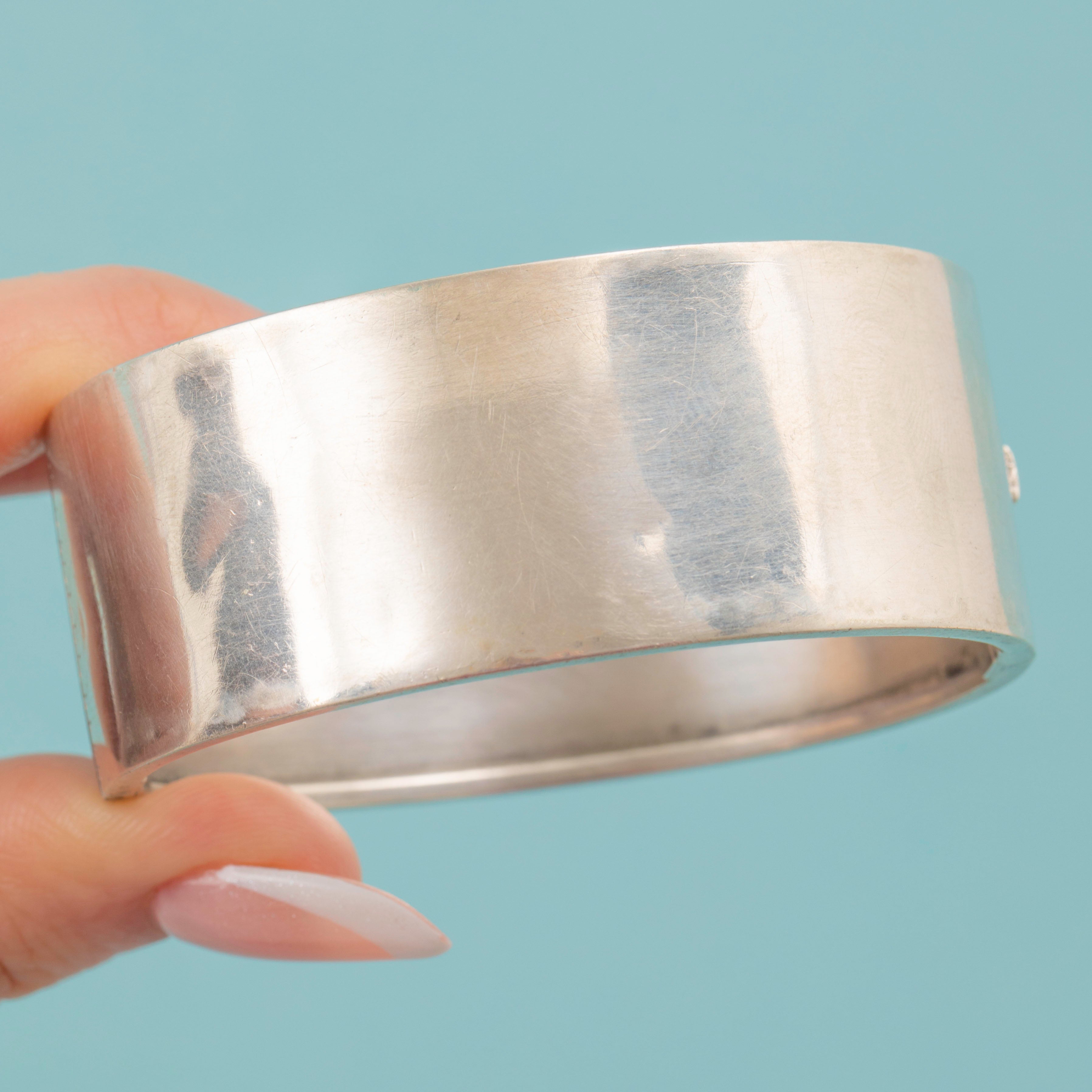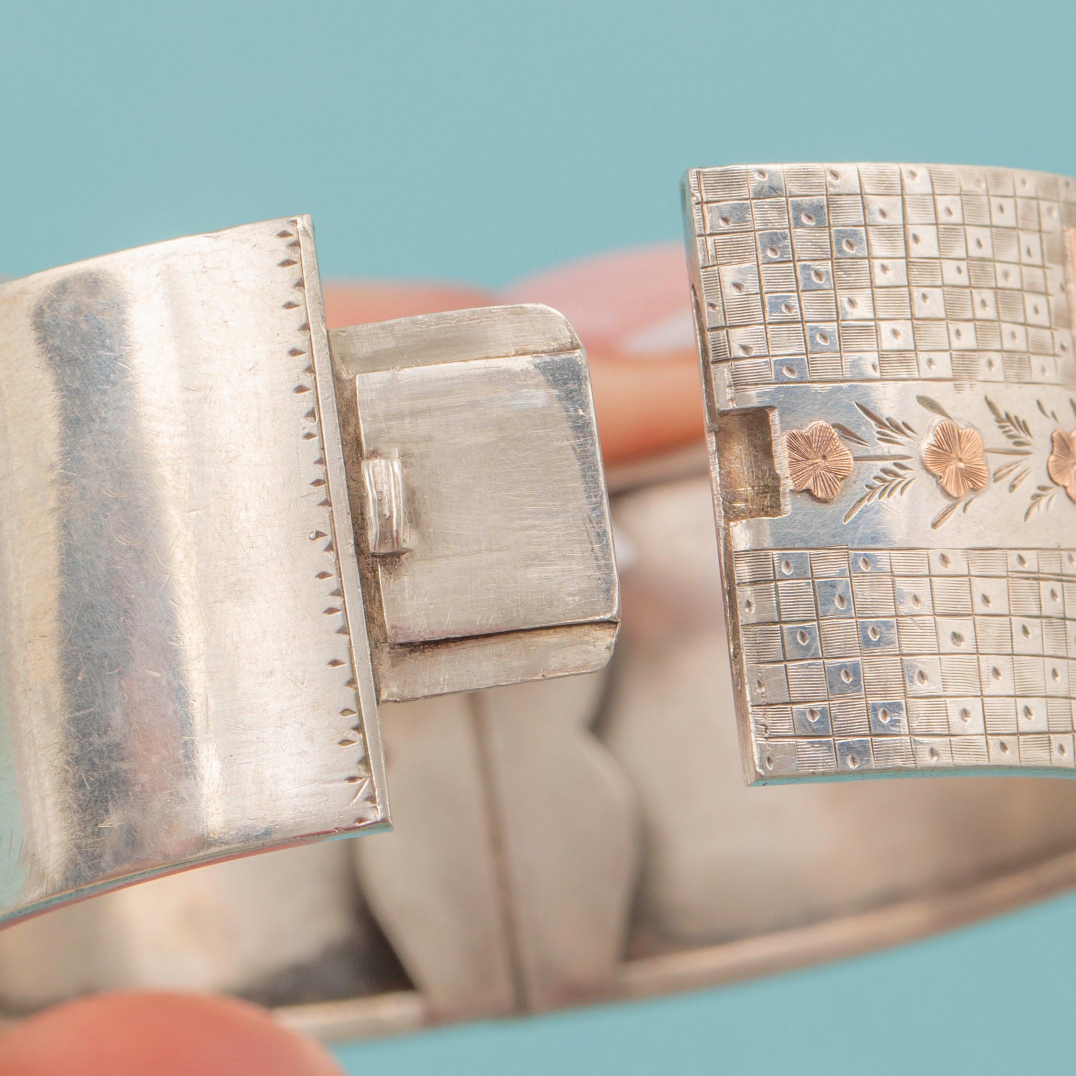 VERY GOOD: This Victorian Aesthetic Silver & 9ct Gold floral engraved bangle is in lovely condition throughout. Her Rose Gold roses with Yellow Gold leaves stand out wonderfully from her lustrous Sterling Silver, with no signs of wear to note. There are some signs of wear on the inside of the bangle and a few dings on the back, but these cannot be seen when worn. Each engraving has also remained crisp and clear. Her clasp shuts with a 'click', allowing you to wear this eye-catching Victorian cuff bracelet with utmost confidence!