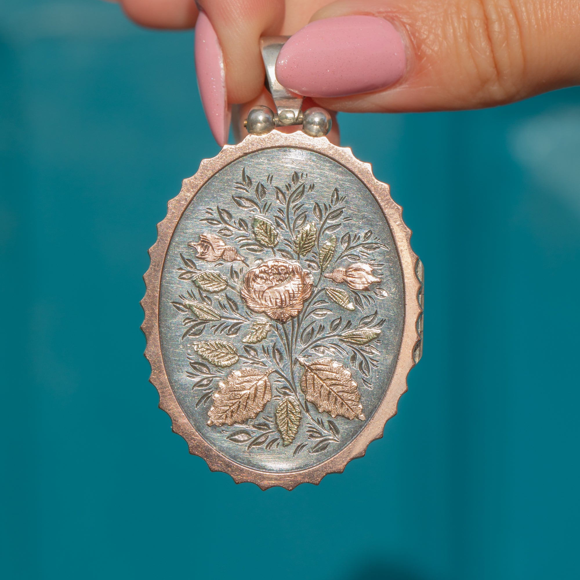 VERY GOOD-EXCELLENT: This Victorian Aesthetic Silver & 9ct Gold floral locket is in wonderful condition. The front of the locket is immaculate with all details remaining crisp and defined. The Silver has accrued a light patina creating a lovely contrast against the Gold details and enhancing the engraved details. There are a few light dings on the back of the locket, commensurate with age, which are not noticeable from the front. The locket closes securely and the large bale allows you to suspend it from a chain and wear it with the utmost confidence!