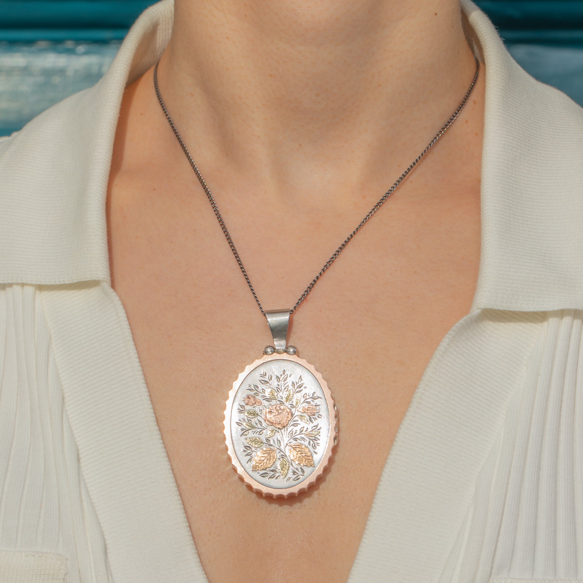 A true celebration of Victorian craftsmanship, the level of detail achieved is next to none, displaying ornate 9ct Gold roses and leaves adorned with intricate hand-engraved details, bringing this piece to life. Framed by a 9ct Gold scalloped border adding a distinct, eye-catching finish, this Victorian Aesthetic locket will make a statement wherever she goes!