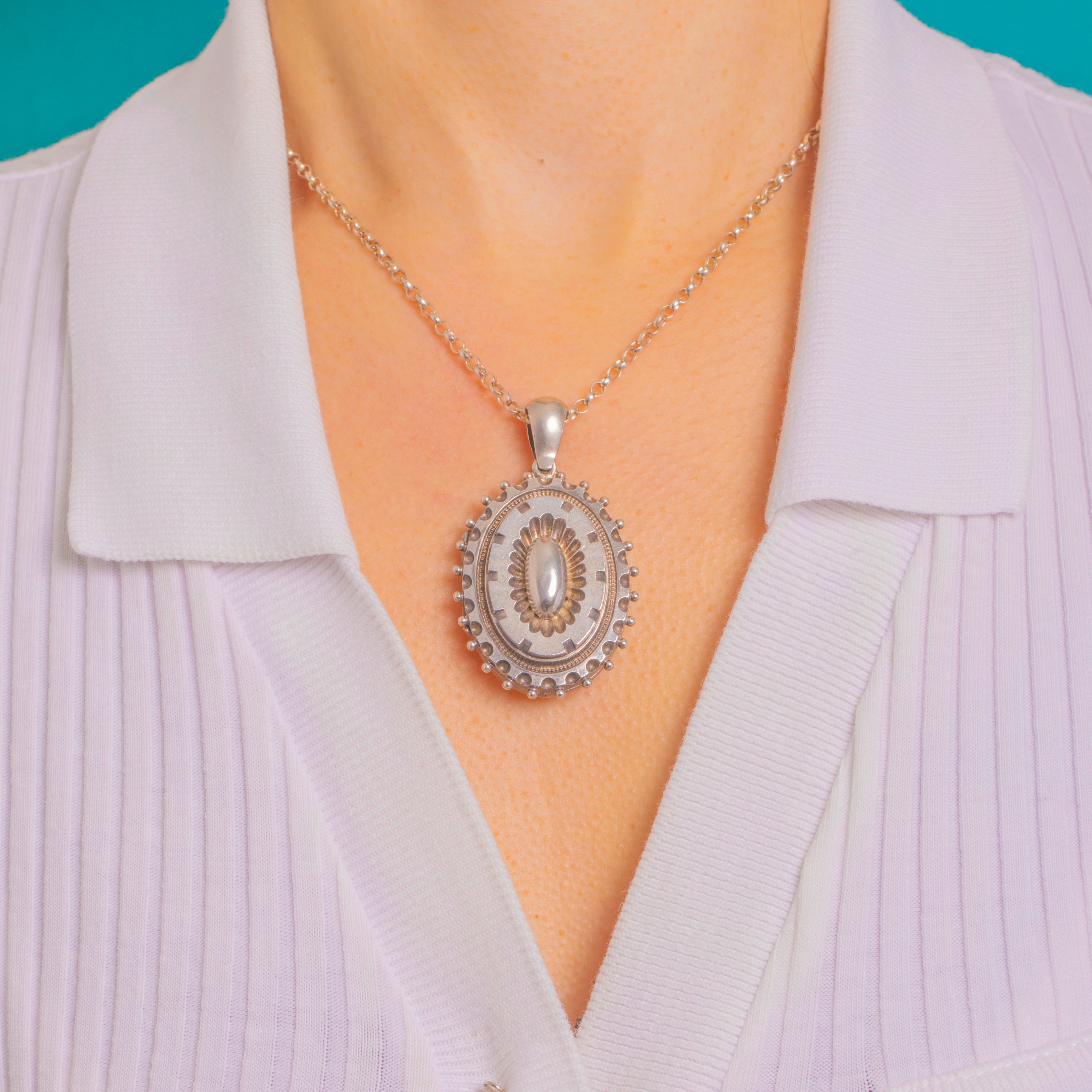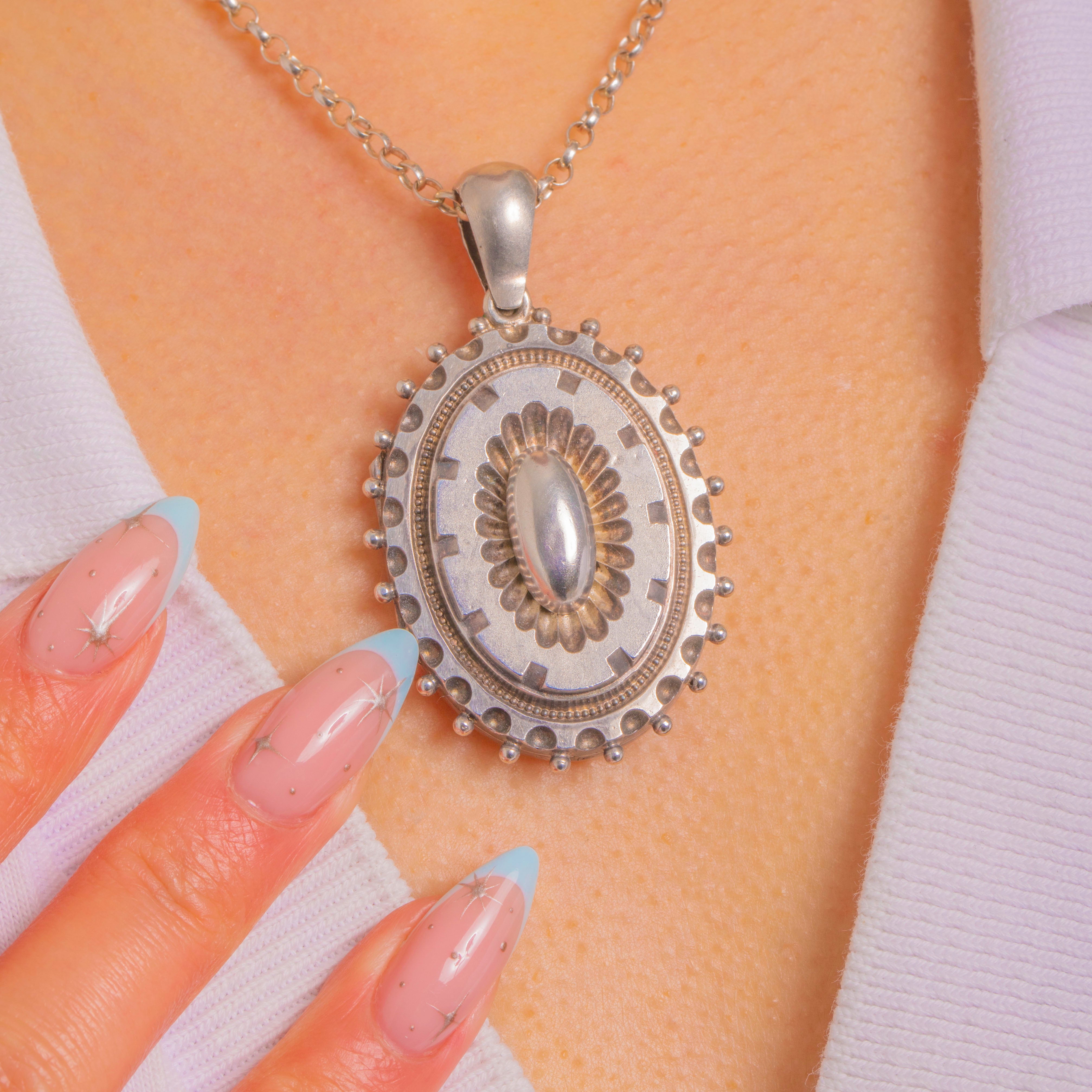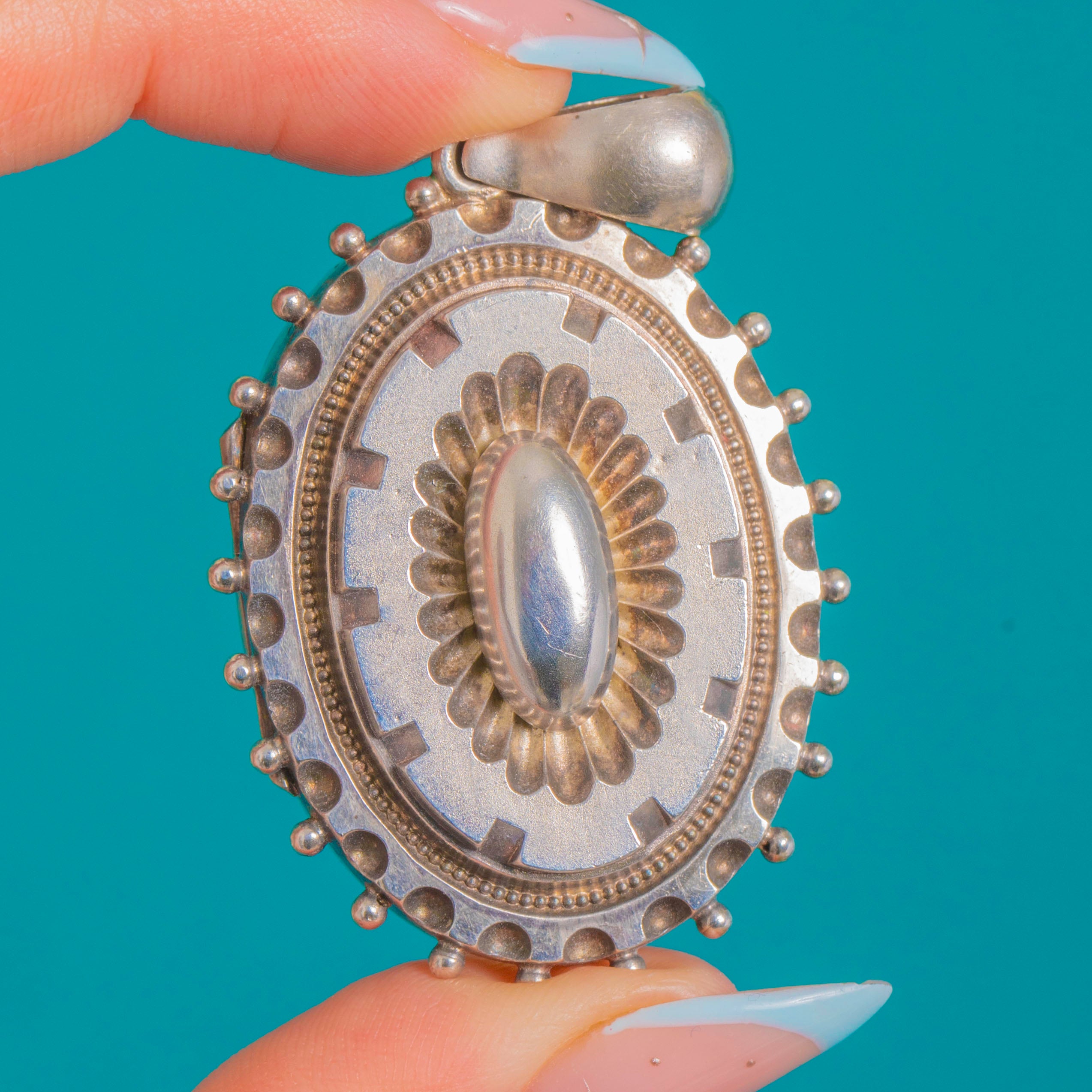 Richly detailed and beautifully sculptural, this Victorian Aesthetic locket in Sterling Silver showcases a bold oval medallion framed by concentric ornament. A raised domed boss sits at the heart of a radiating rosette, enclosed by a crenellated ring, a fine beaded band, and an outer row of neat pellet studs—an architectural, Etruscan‑revival flourish that feels both opulent and refined. A substantial tapered bale completes the silhouette.