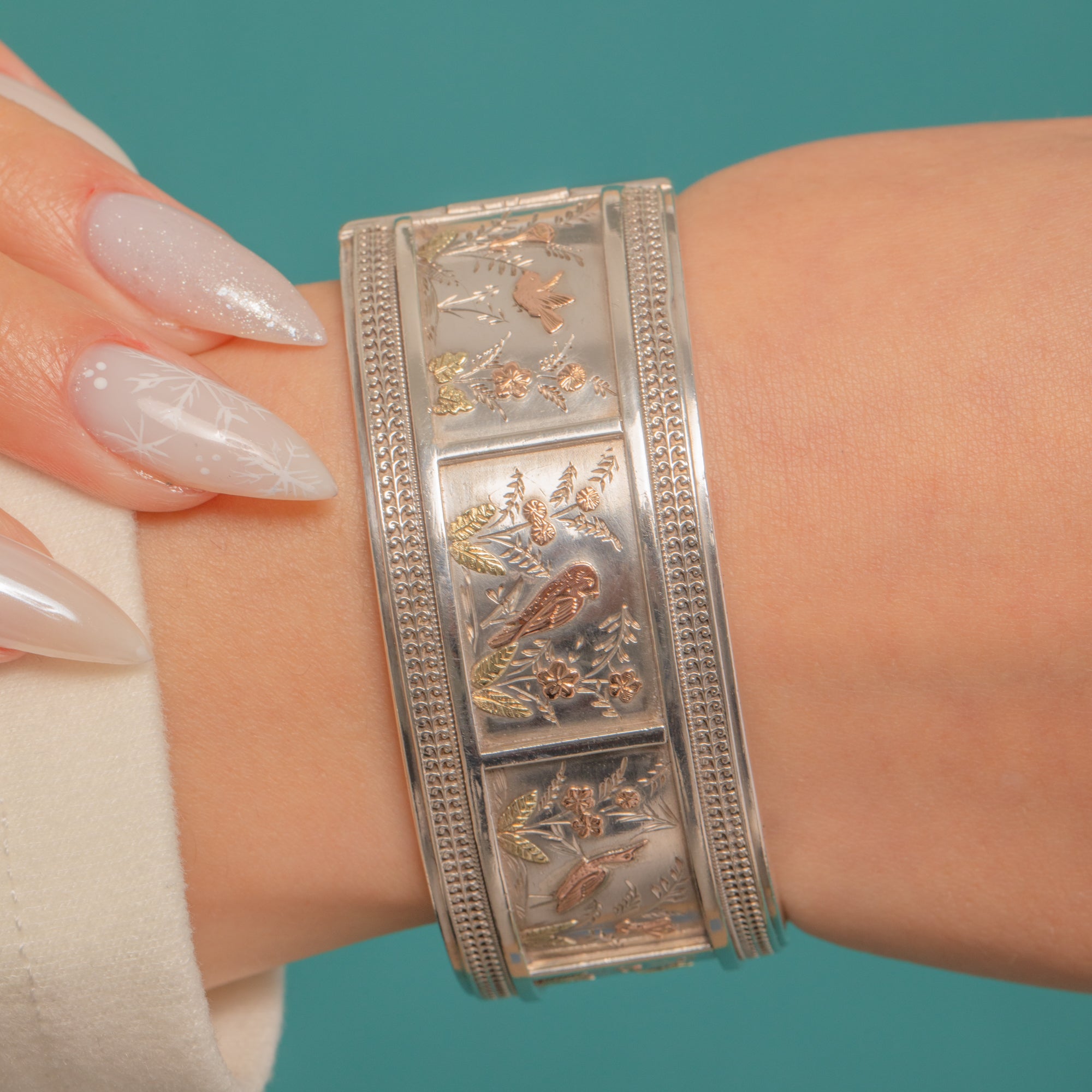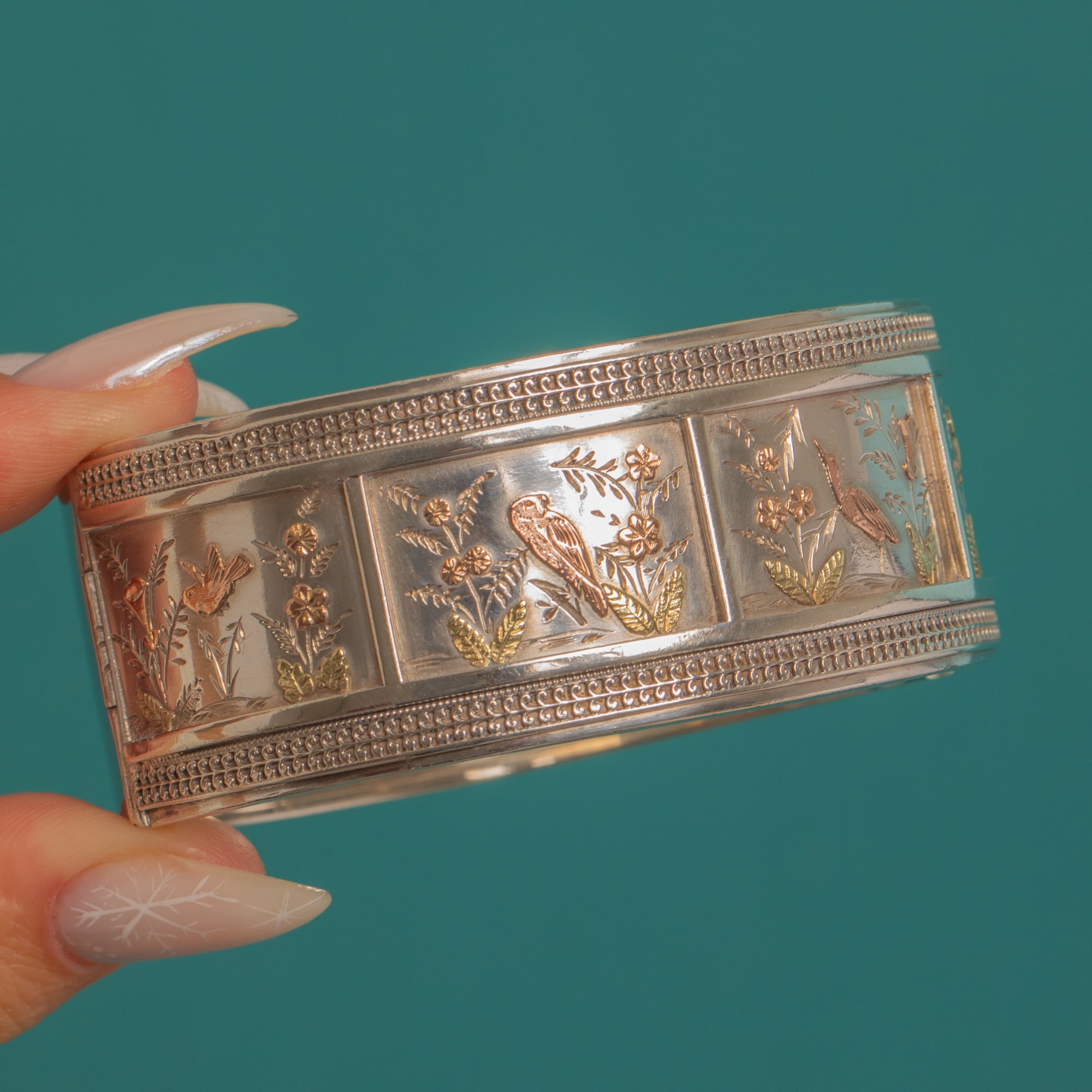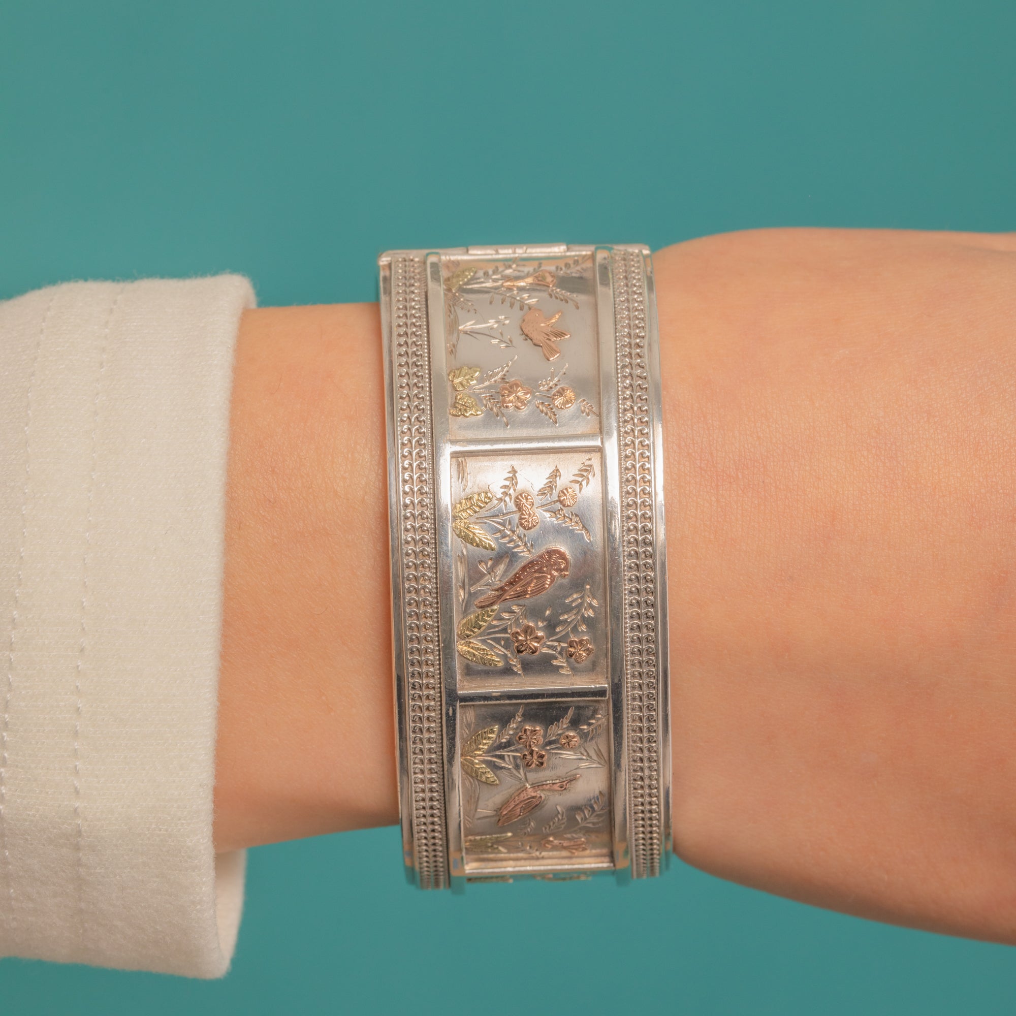 A striking Victorian Aesthetic hinged bangle, richly worked in Silver with Rose and Green Gold detail. The recessed central band is adorned with birds nestled among foliage and blossoms.