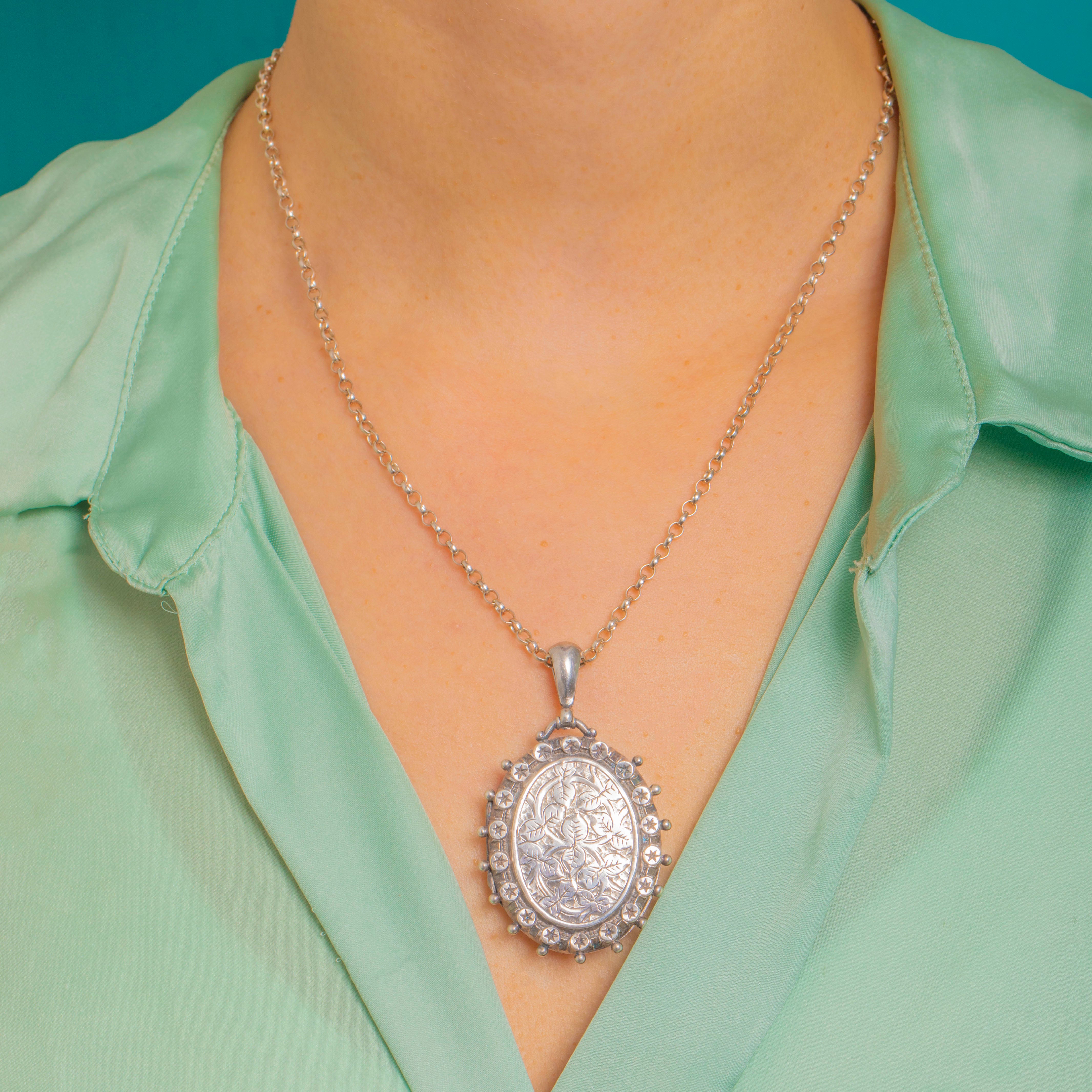 A beautifully characterful Victorian locket, crafted in Sterling Silver and finished with crisp Aesthetic-era star motifs, framed by a decorative beaded border. It’s the kind of piece that feels instantly collectible—ornate without being fussy, and perfect for everyday layering.