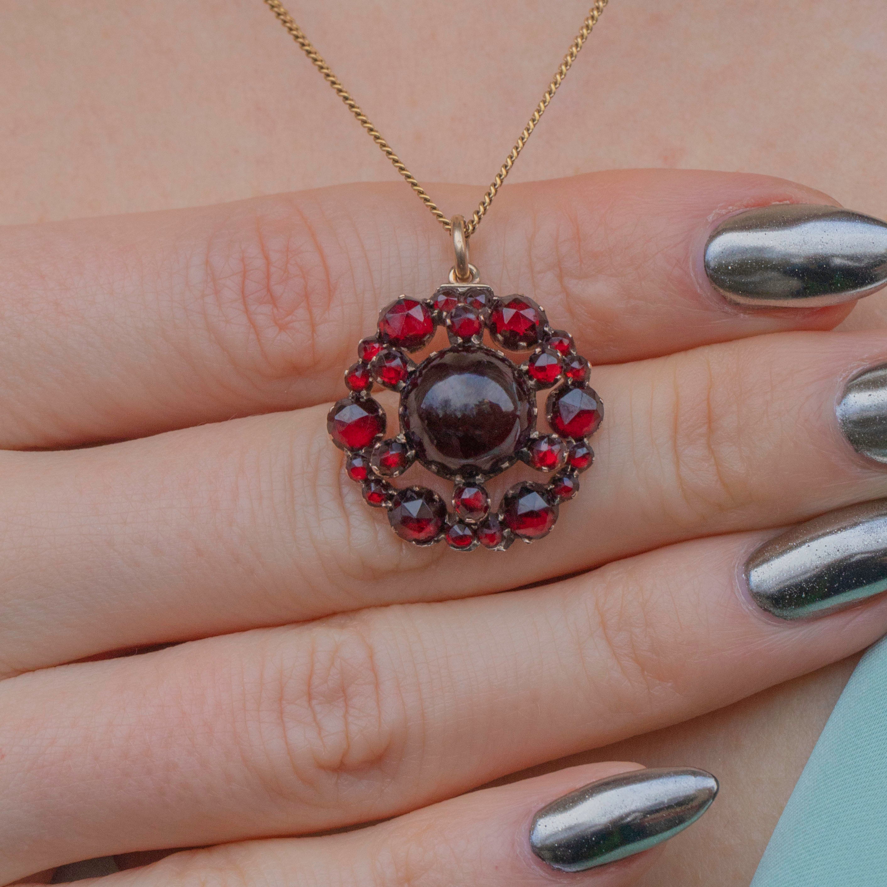 A stunning Victorian Bohemian Garnet flower pendant! This pendant is bursting with rich cranberry hues, with a central cabochon-cut Garnet surrounded by glistening rose-cuts.
