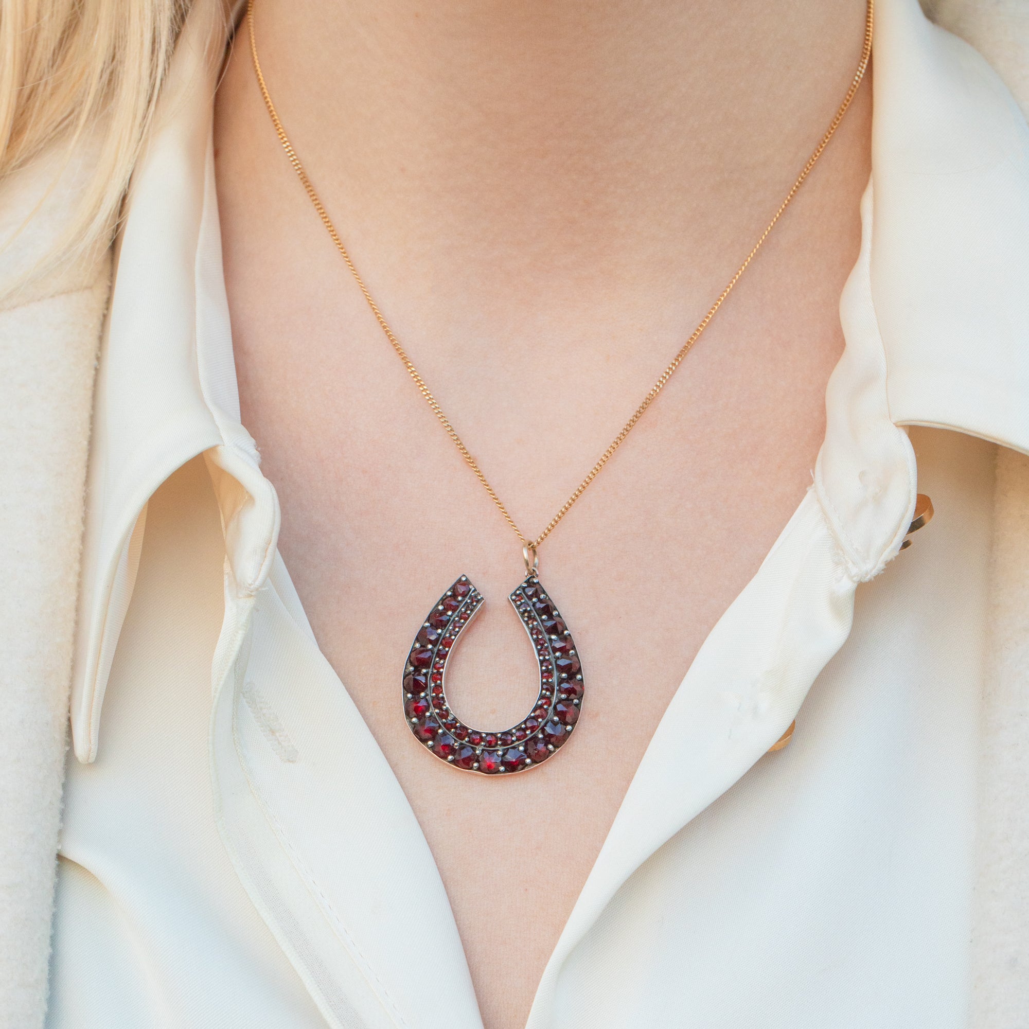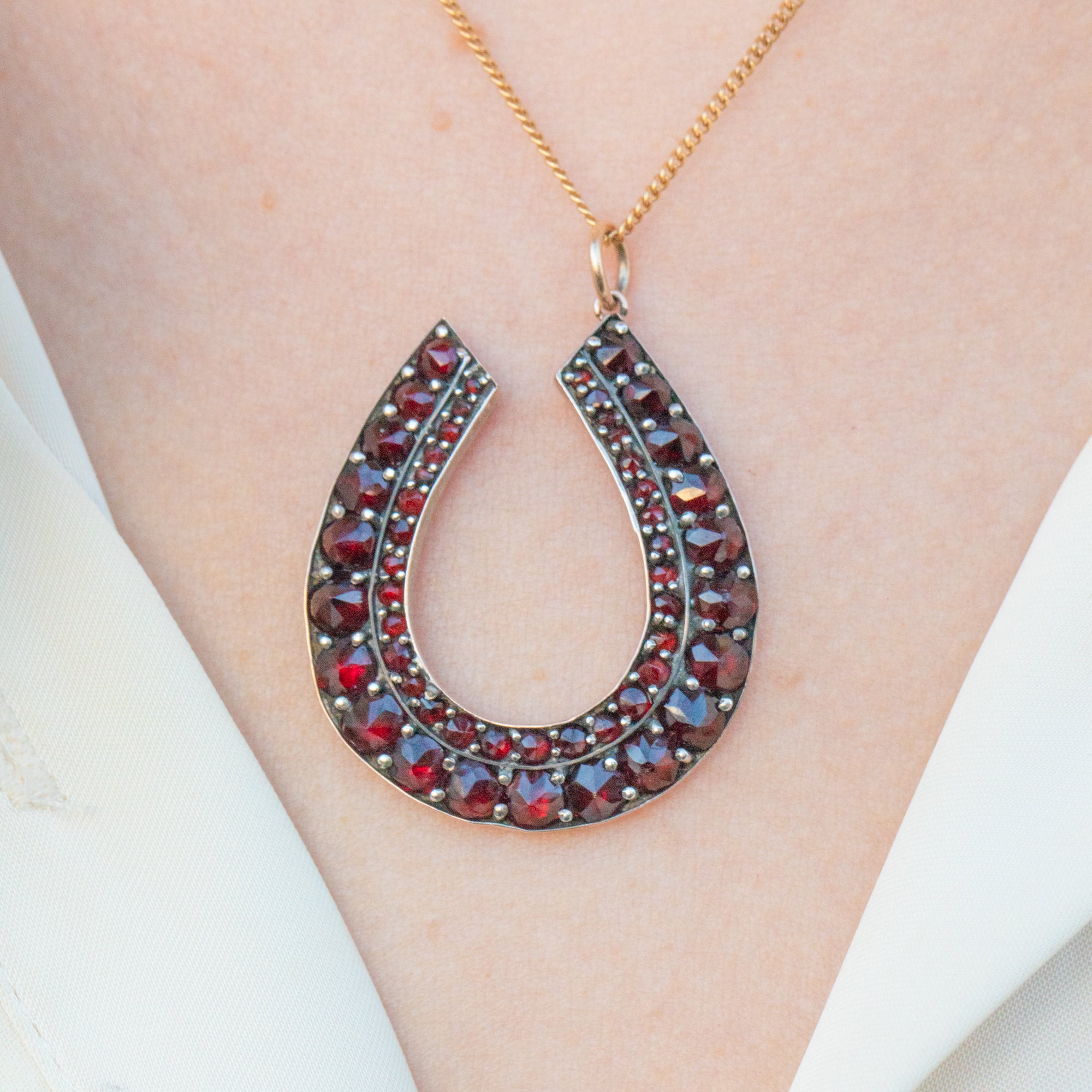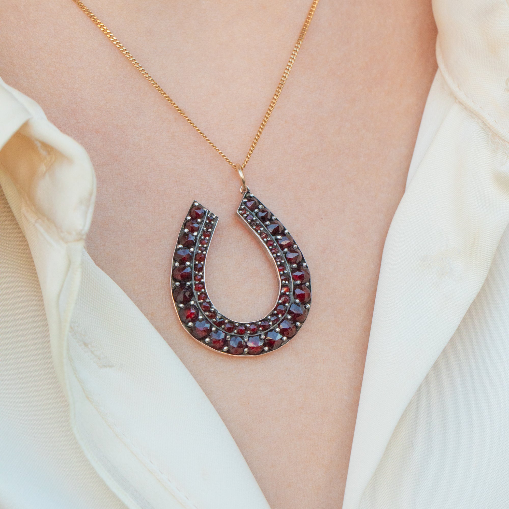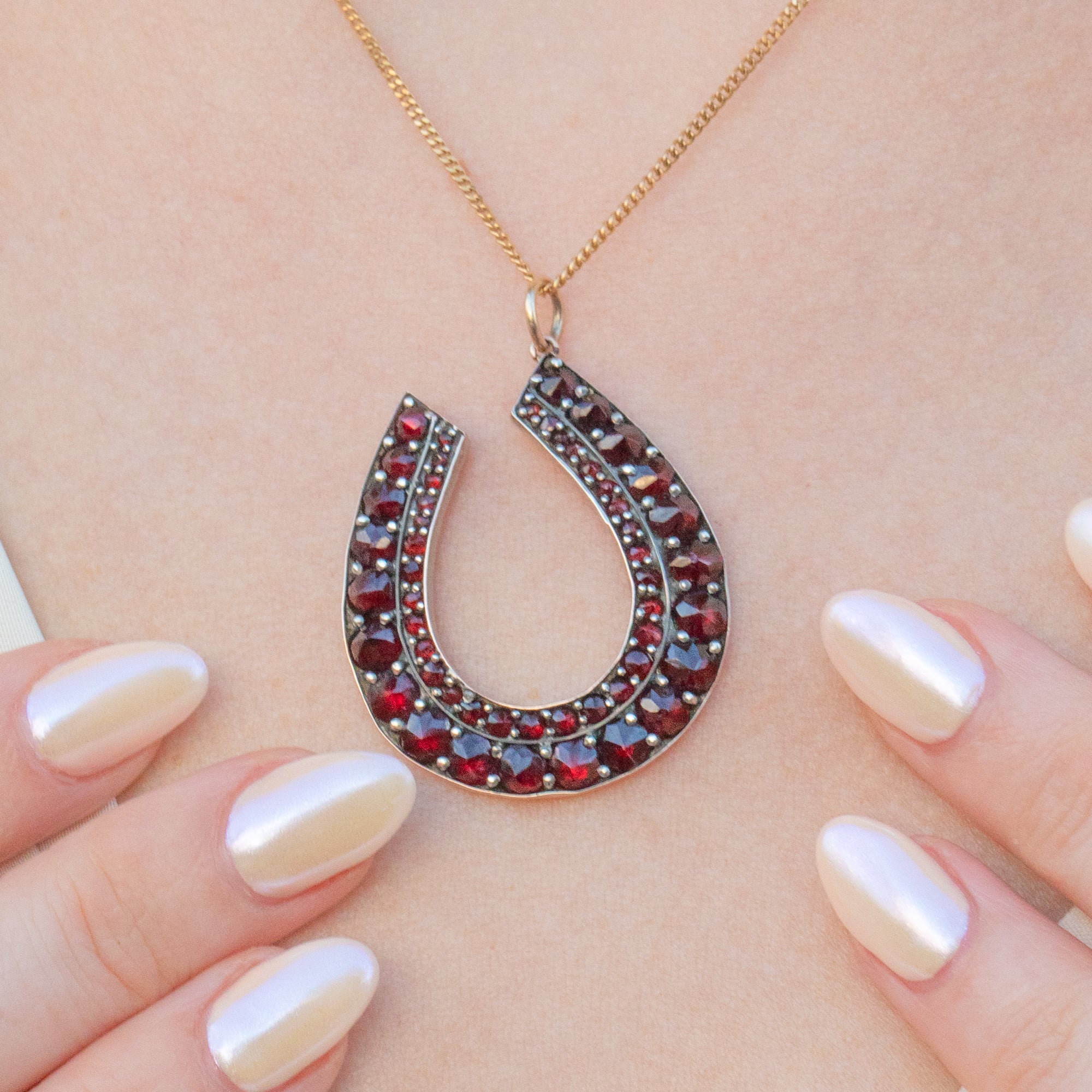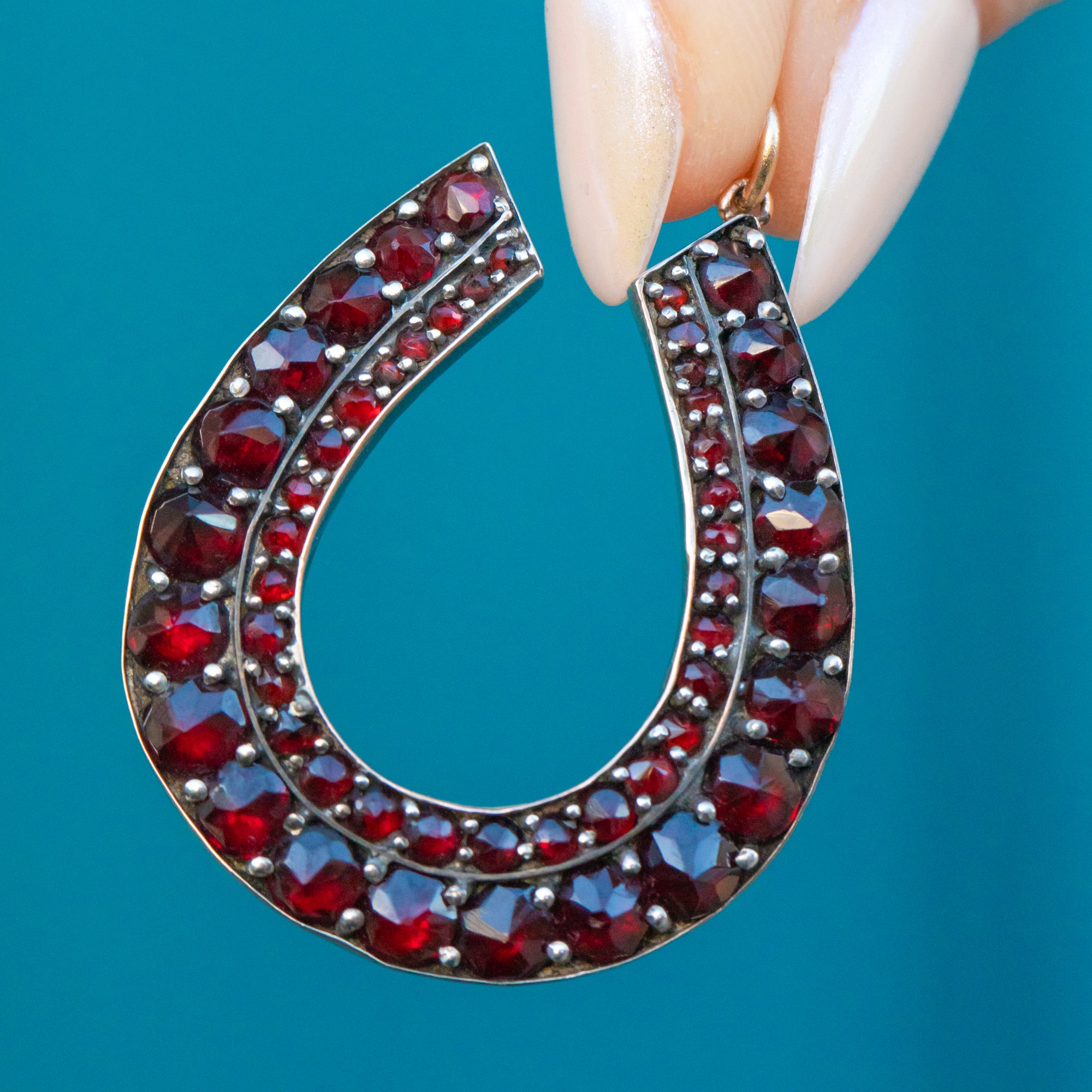 Add a touch of gothic glamour to your repertoire with this outstanding Victorian Bohemian Garnet horseshoe pendant! Set to become your new lucky talisman, this antique horseshoe pendant boasts an exquisite display of Bohemian Garnets, revered for their deep red hue and unmissable inner glow.