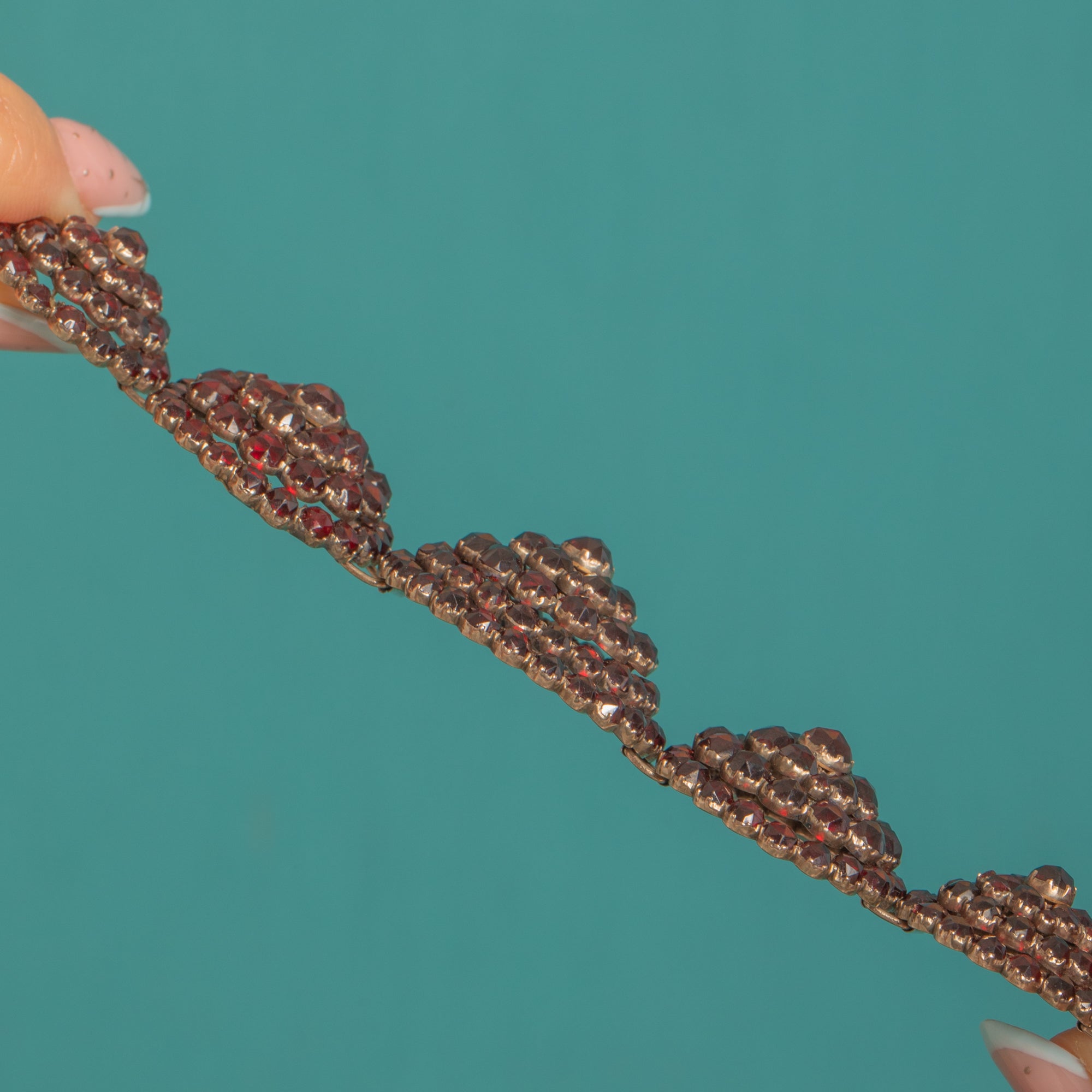 Bold yet refined, this bracelet showcases the ornate, textured beauty collectors adore in Bohemian Garnet work. Its deep, even colour and high-sparkle profile make a luxurious statement, with a pleasing weight in the hand that speaks to its quality.
