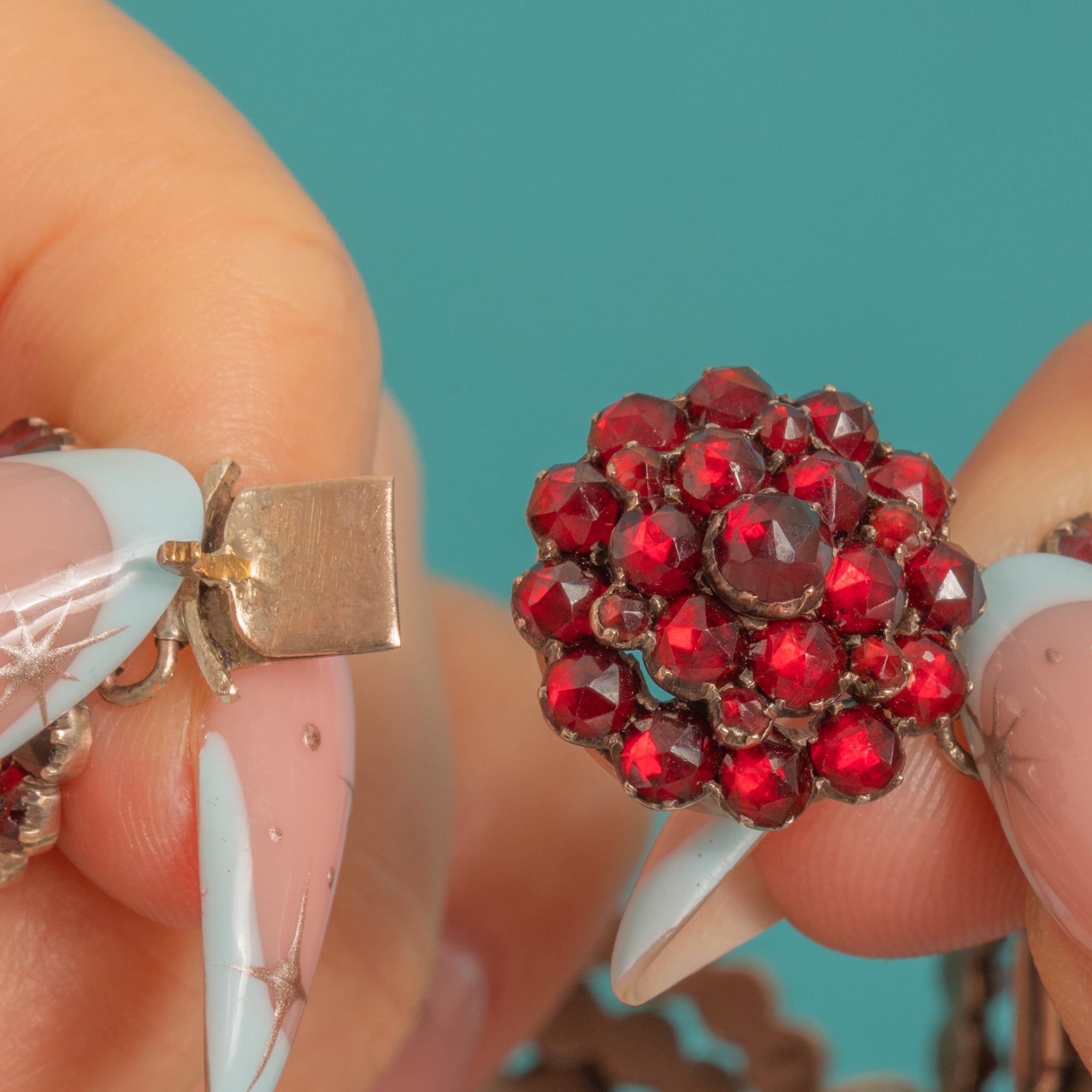 EXCELLENT: The Garnets are bright and well-matched with only minor facet abrasions commensurate with age. The domed cluster settings and articulated links are secure, with the box clasp and side safety in good working order; light dings to the sheet backs and subtle solder reinforcement are in keeping with hand-made Victorian construction. Overall wear is minimal with a pleasing antique patina.
