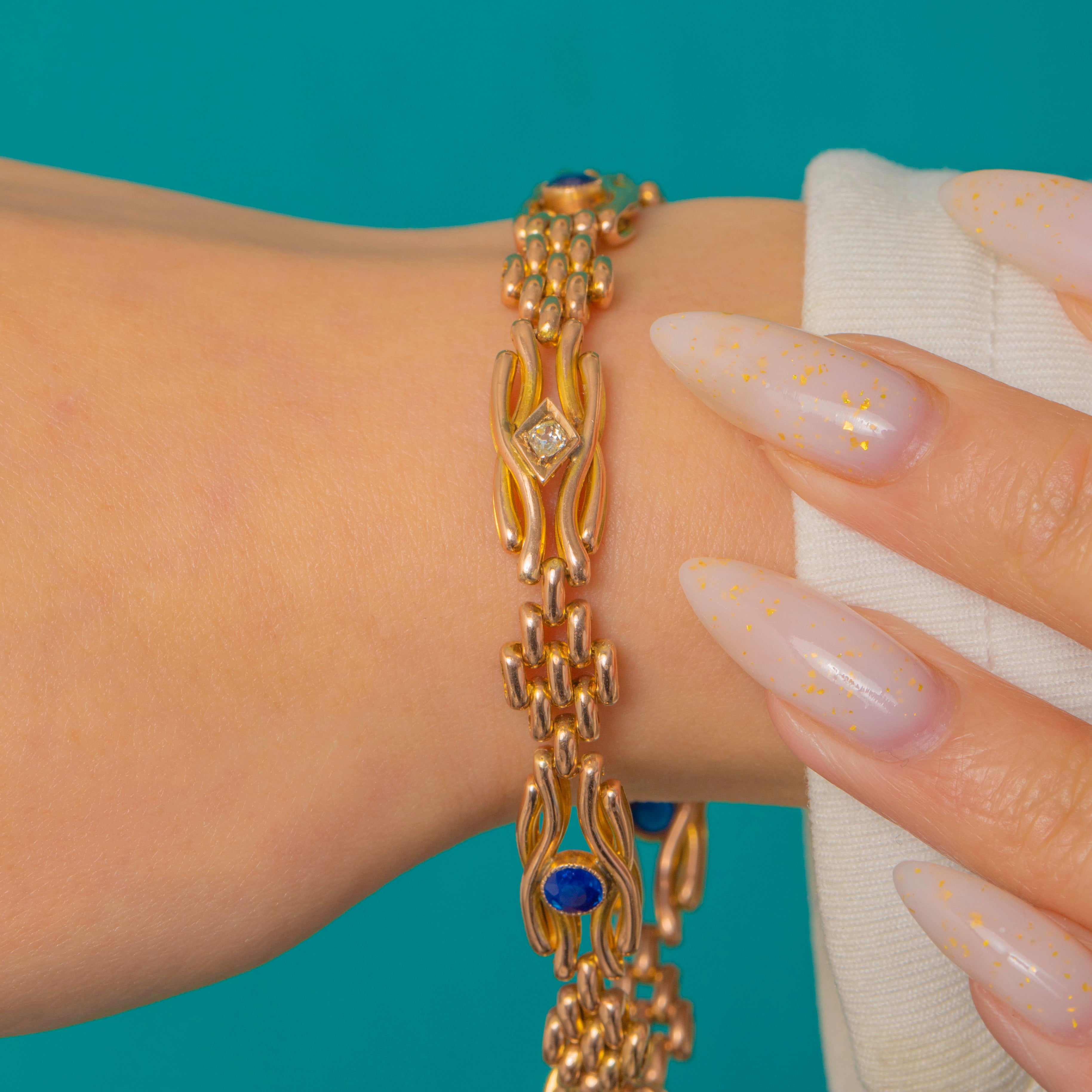 This refined Victorian bracelet is crafted in solid 9ct Gold with gracefully articulated openwork panels punctuated by geometric lozenge accents. The design is elegantly composed with a trio of deep blue Natural Sapphires alternating with three bright old mine cut Diamonds, creating a timeless play of colour and light.