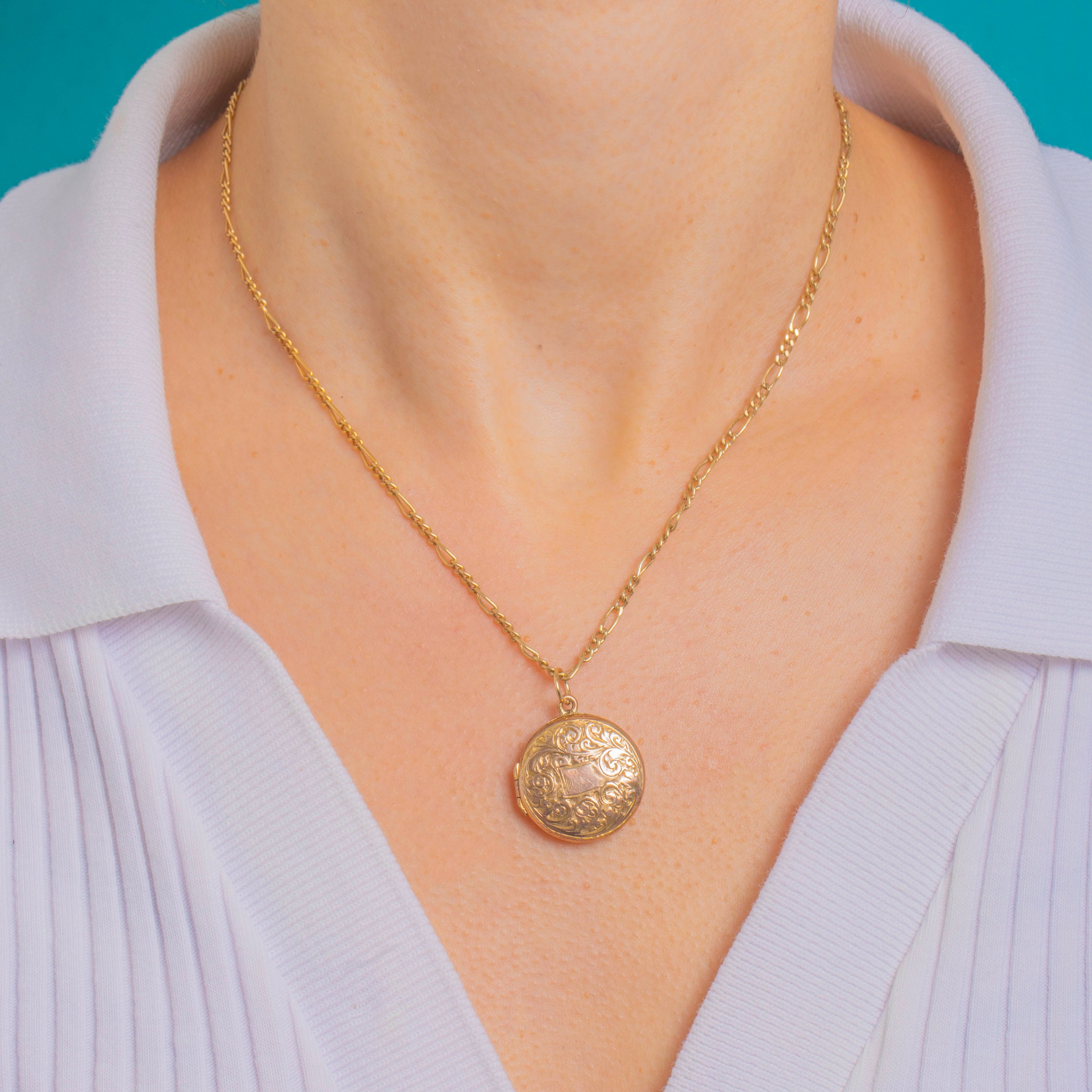 Ornate and romantic, this Victorian round locket is richly embellished with scrolling foliate engraving that curls around a central blank shield cartouche. Its warm, golden-toned brass hue and softly domed profile give it that quintessential turn-of-the-century charm.