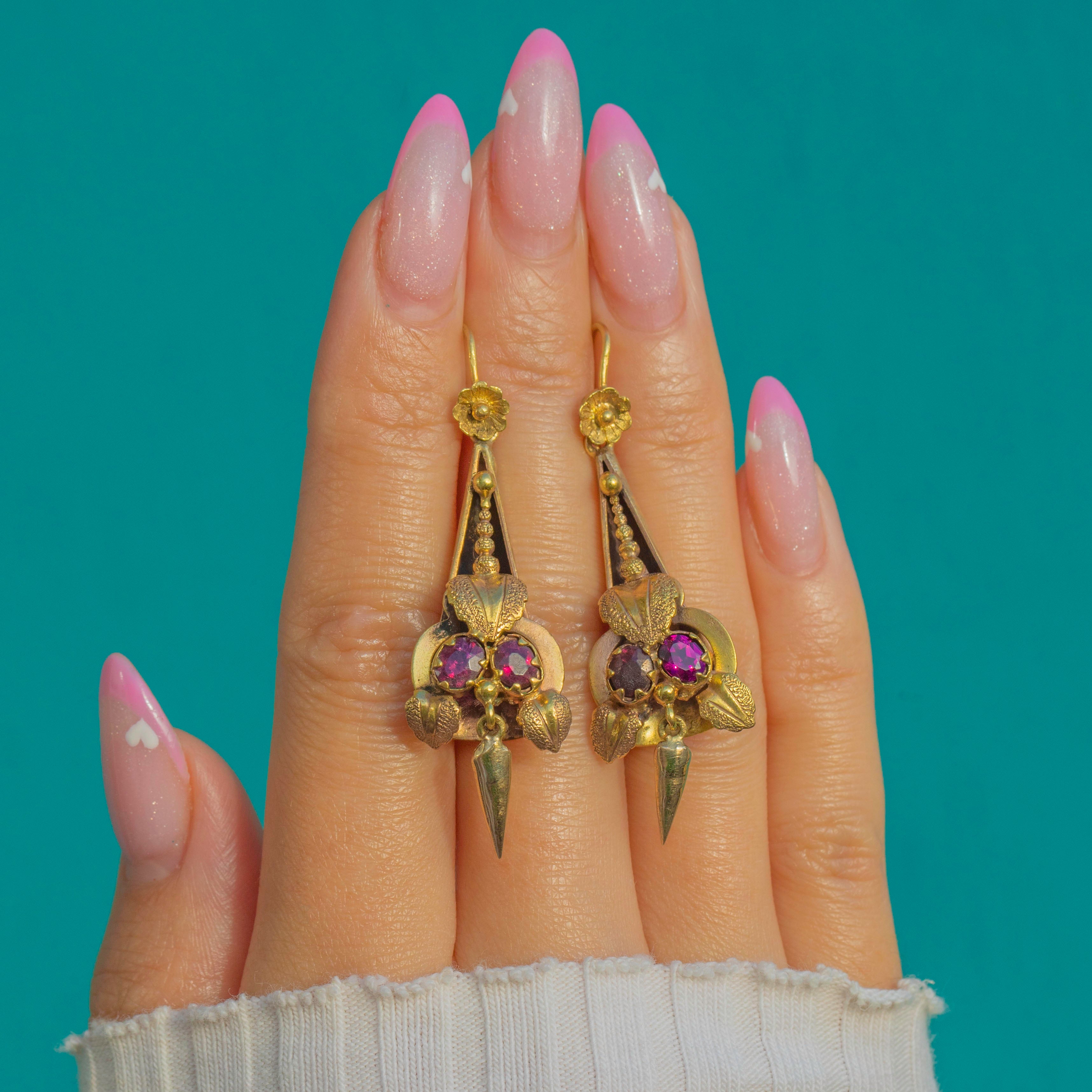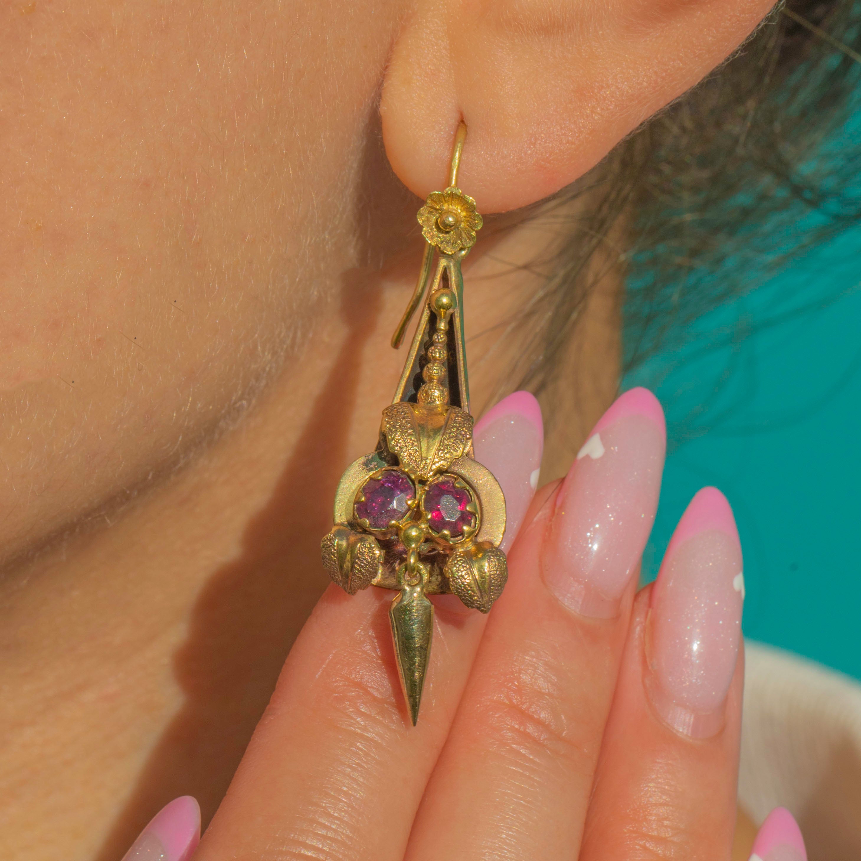 These stunning Victorian Etruscan Revival earrings date to circa 1870–1885 and showcase the masterful Goldsmithing of the period. Crafted in 15ct Gold, each earring features two deep red faceted Garnets, one at the centre and another suspended below, framed by intricate granulated and rope-twist decoration.