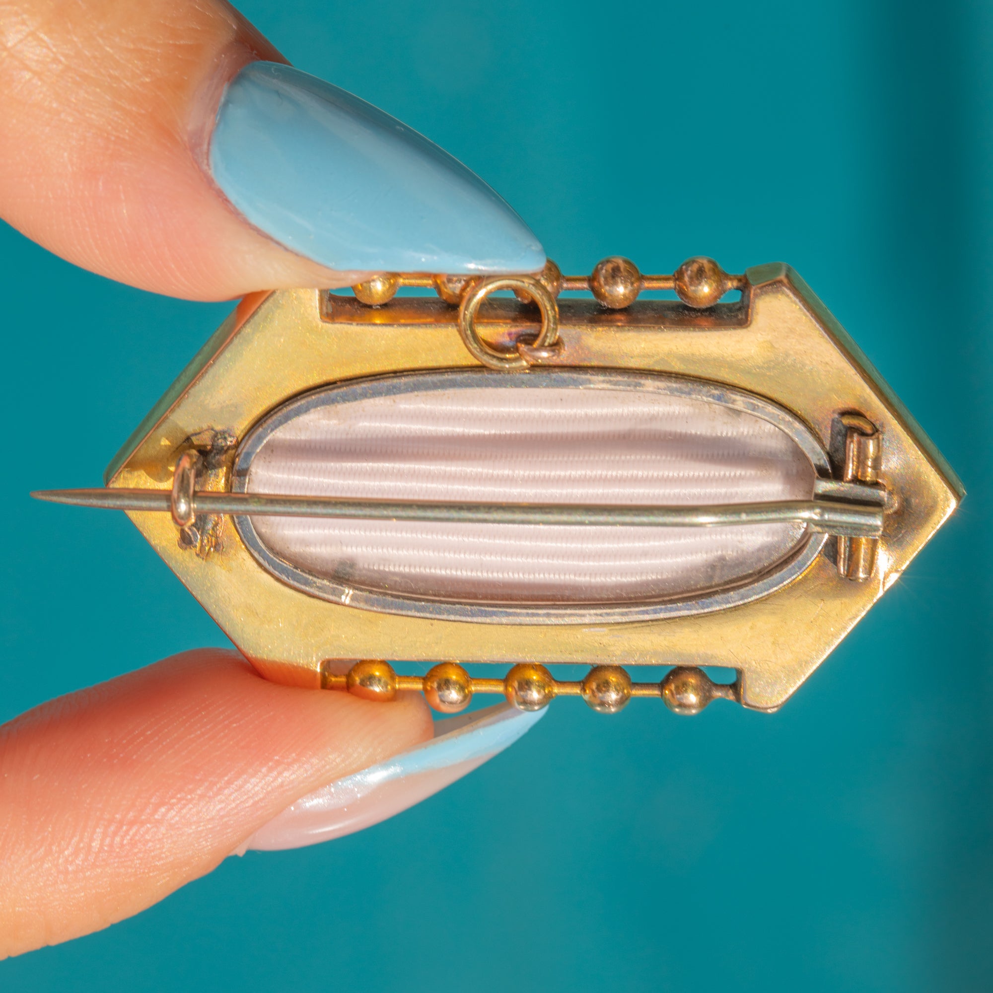 Fine cannetille wirework decorates either side of the raised gemstone disc, and the brooch is finished with beaded details for that classic Victorian finish. Upon turning the piece over, you will discover a secret locket compartment to which you can add a cherished photograph.