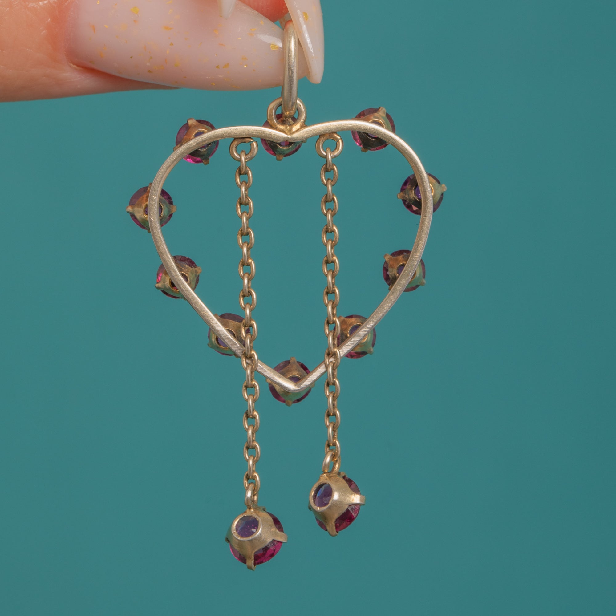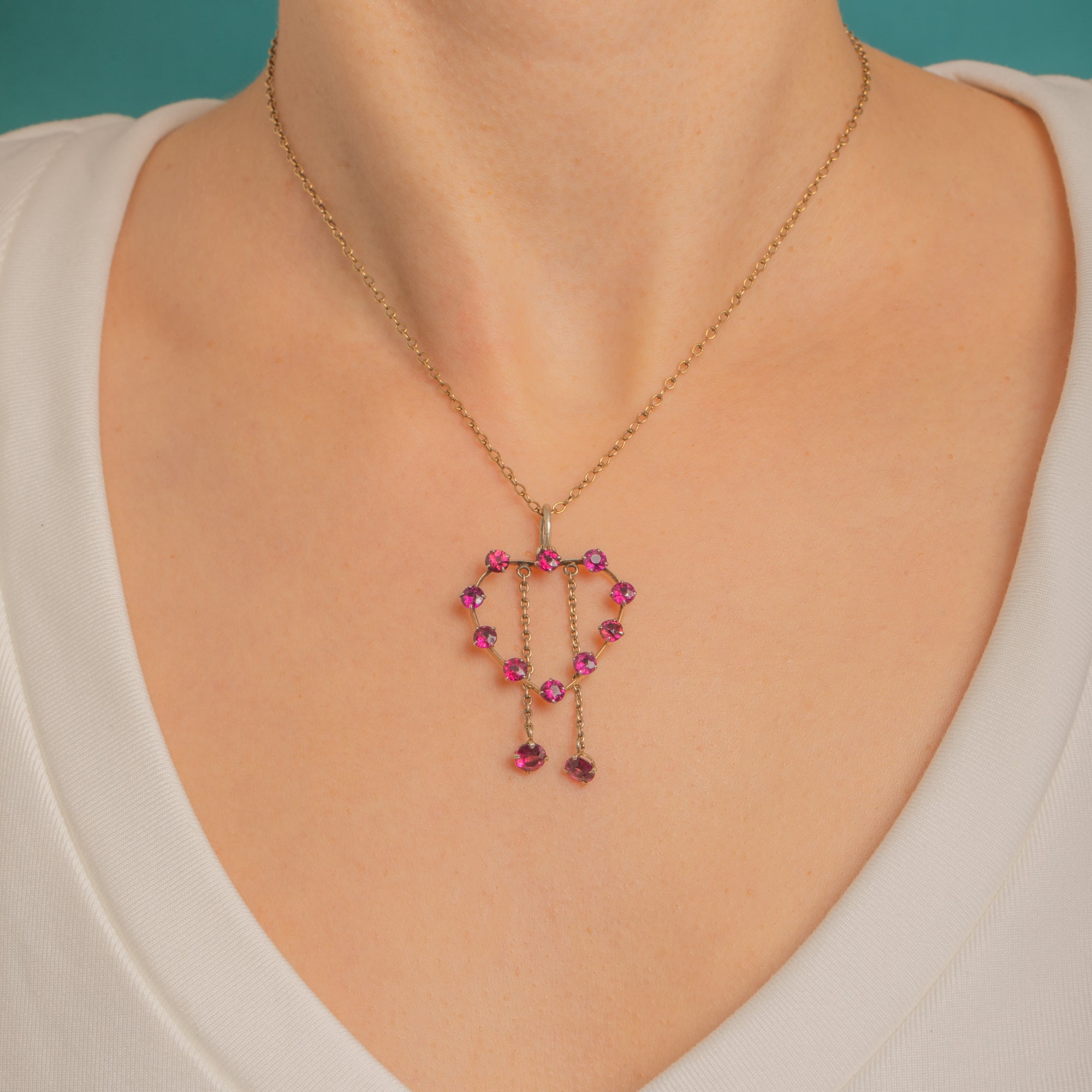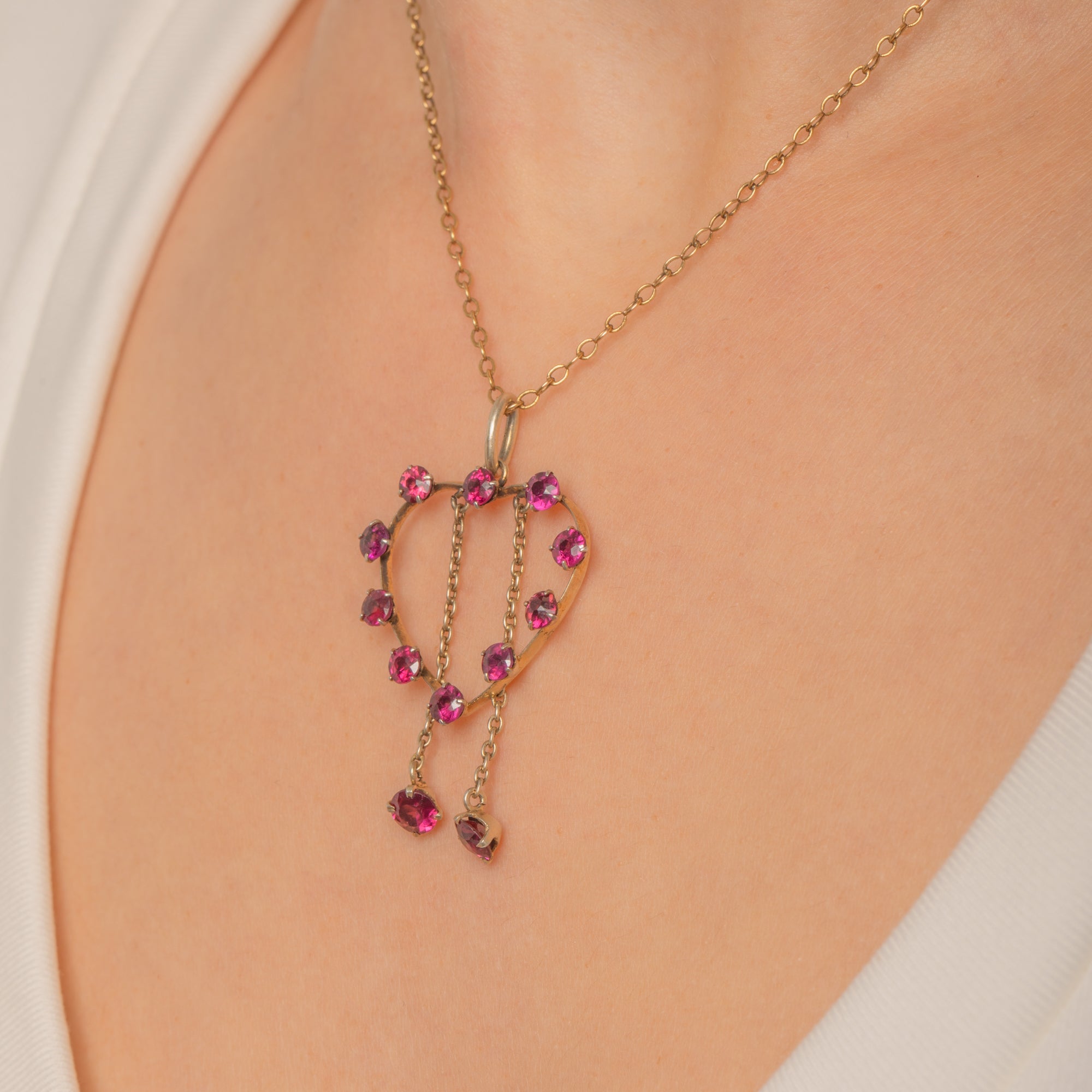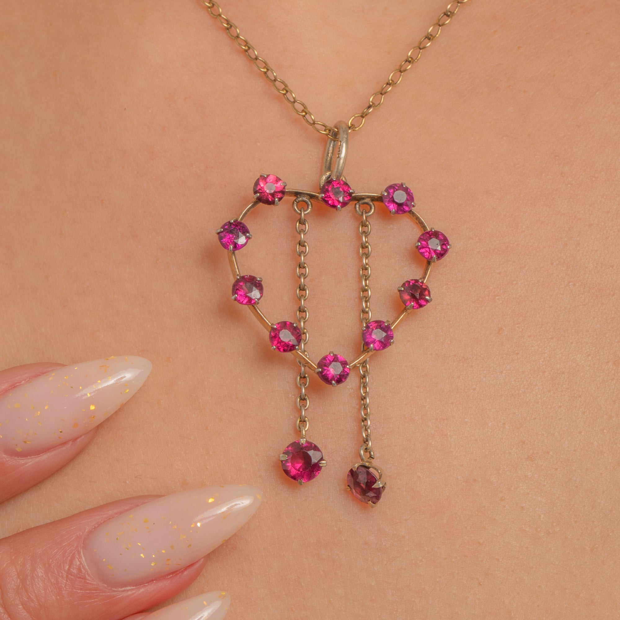 Romance meets refinement in this Victorian Garnet heart pendant. An airy openwork heart is traced in a ribbon of round Garnets held in delicate coronet settings, while two fine internal chains suspend slightly larger Garnet drops that sway with every movement. Crafted in Gold plated Silver, the warm glow beautifully complements the Garnets’ vivid pink-raspberry tones.