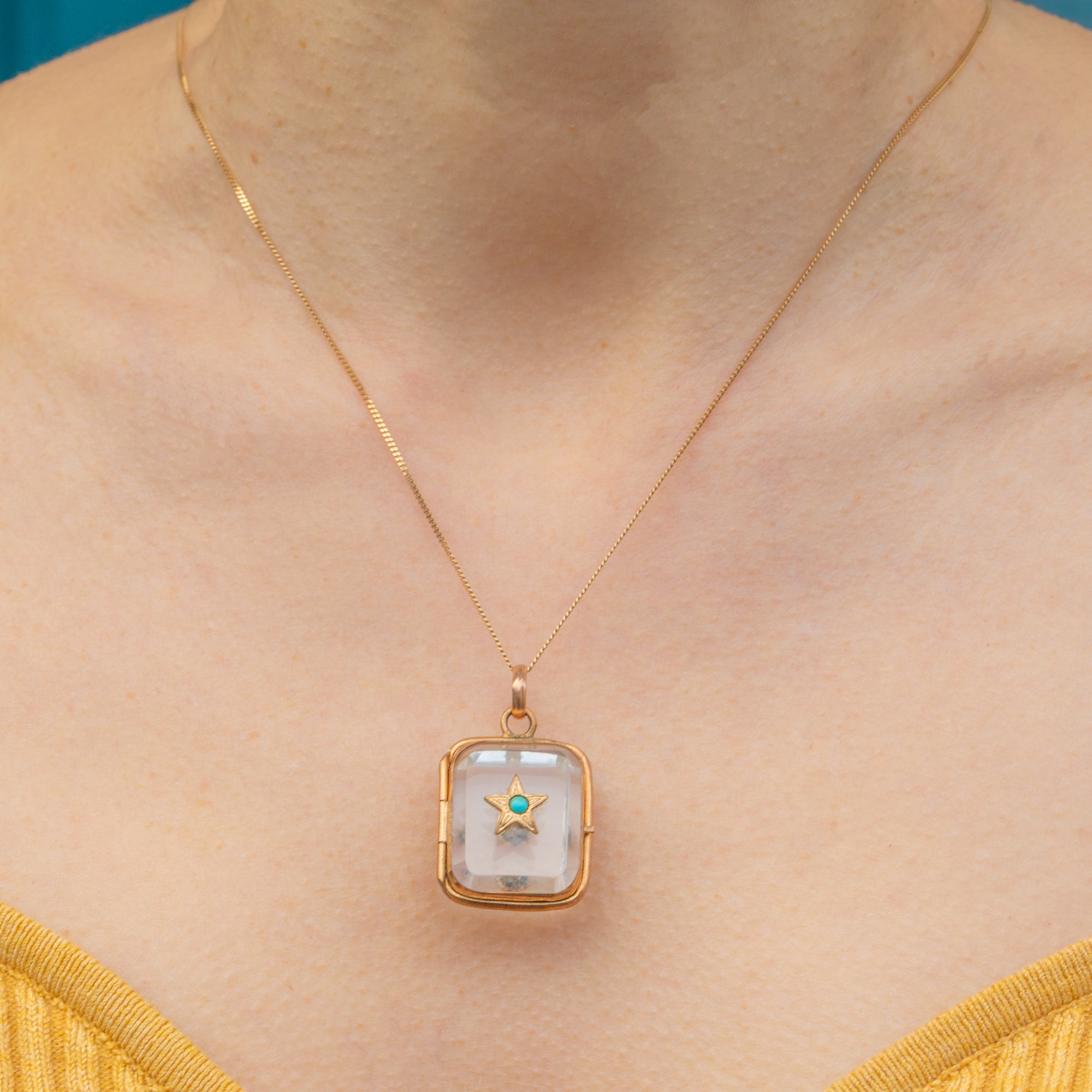 VERY GOOD: This Victorian Turquoise star locket is in very good condition. The Gold-toned metal has a lovely buttery hue and has kept its shape well, holding the glass panes securely in place. Both pieces of glass have remained intact, with only a few minor nibbles, including a small chip on the back. The Turquoise is smooth and secure within its star setting, adding an eye-catching pop of colour. The doors close securely allowing you to keep a precious memento safely inside.